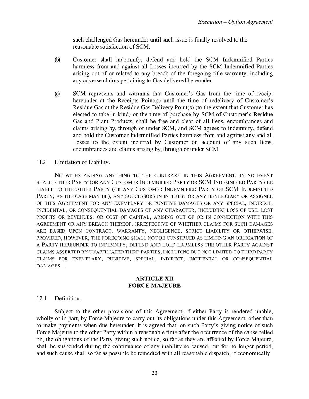 Execution – Option Agreement such challenged Gas hereunder until such issue is finally resolved to the reasonable satisfaction of SCM. (b) Customer shall indemnify, defend and hold the SCM Indemnified Parties harmless from and against all Losses incurred by the SCM Indemnified Parties arising out of or related to any breach of the foregoing title warranty, including any adverse claims pertaining to Gas delivered hereunder. (c) SCM represents and warrants that Customer’s Gas from the time of receipt hereunder at the Receipts Point(s) until the time of redelivery of Customer’s Residue Gas at the Residue Gas Delivery Point(s) (to the extent that Customer has elected to take in-kind) or the time of purchase by SCM of Customer’s Residue Gas and Plant Products, shall be free and clear of all liens, encumbrances and claims arising by, through or under SCM, and SCM agrees to indemnify, defend and hold the Customer Indemnified Parties harmless from and against any and all Losses to the extent incurred by Customer on account of any such liens, encumbrances and claims arising by, through or under SCM. 11.2 Limitation of Liability. NOTWITHSTANDING ANYTHING TO THE CONTRARY IN THIS AGREEMENT, IN NO EVENT SHALL EITHER PARTY (OR ANY CUSTOMER INDEMNIFIED PARTY OR SCM INDEMNIFIED PARTY) BE LIABLE TO THE OTHER PARTY (OR ANY CUSTOMER INDEMNIFIED PARTY OR SCM INDEMNIFIED PARTY, AS THE CASE MAY BE), ANY SUCCESSORS IN INTEREST OR ANY BENEFICIARY OR ASSIGNEE OF THIS AGREEMENT FOR ANY EXEMPLARY OR PUNITIVE DAMAGES OR ANY SPECIAL, INDIRECT, INCIDENTAL, OR CONSEQUENTIAL DAMAGES OF ANY CHARACTER, INCLUDING LOSS OF USE, LOST PROFITS OR REVENUES, OR COST OF CAPITAL, ARISING OUT OF OR IN CONNECTION WITH THIS AGREEMENT OR ANY BREACH THEREOF, IRRESPECTIVE OF WHETHER CLAIMS FOR SUCH DAMAGES ARE BASED UPON CONTRACT, WARRANTY, NEGLIGENCE, STRICT LIABILITY OR OTHERWISE; PROVIDED, HOWEVER, THE FOREGOING SHALL NOT BE CONSTRUED AS LIMITING AN OBLIGATION OF A PARTY HEREUNDER TO INDEMNIFY, DEFEND AND HOLD HARMLESS THE OTHER PARTY AGAINST CLAIMS ASSERTED BY UNAFFILIATED THIRD PARTIES, INCLUDING BUT NOT LIMITED TO THIRD PARTY CLAIMS FOR EXEMPLARY, PUNITIVE, SPECIAL, INDIRECT, INCIDENTAL OR CONSEQUENTIAL DAMAGES. . ARTICLE XII FORCE MAJEURE 12.1 Definition. Subject to the other provisions of this Agreement, if either Party is rendered unable, wholly or in part, by Force Majeure to carry out its obligations under this Agreement, other than to make payments when due hereunder, it is agreed that, on such Party’s giving notice of such Force Majeure to the other Party within a reasonable time after the occurrence of the cause relied on, the obligations of the Party giving such notice, so far as they are affected by Force Majeure, shall be suspended during the continuance of any inability so caused, but for no longer period, and such cause shall so far as possible be remedied with all reasonable dispatch, if economically 23