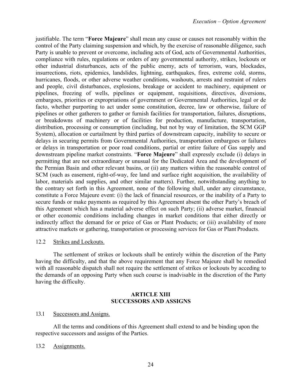 Execution – Option Agreement justifiable. The term “Force Majeure” shall mean any cause or causes not reasonably within the control of the Party claiming suspension and which, by the exercise of reasonable diligence, such Party is unable to prevent or overcome, including acts of God, acts of Governmental Authorities, compliance with rules, regulations or orders of any governmental authority, strikes, lockouts or other industrial disturbances, acts of the public enemy, acts of terrorism, wars, blockades, insurrections, riots, epidemics, landslides, lightning, earthquakes, fires, extreme cold, storms, hurricanes, floods, or other adverse weather conditions, washouts, arrests and restraint of rulers and people, civil disturbances, explosions, breakage or accident to machinery, equipment or pipelines, freezing of wells, pipelines or equipment, requisitions, directives, diversions, embargoes, priorities or expropriations of government or Governmental Authorities, legal or de facto, whether purporting to act under some constitution, decree, law or otherwise, failure of pipelines or other gatherers to gather or furnish facilities for transportation, failures, disruptions, or breakdowns of machinery or of facilities for production, manufacture, transportation, distribution, processing or consumption (including, but not by way of limitation, the SCM GGP System), allocation or curtailment by third parties of downstream capacity, inability to secure or delays in securing permits from Governmental Authorities, transportation embargoes or failures or delays in transportation or poor road conditions, partial or entire failure of Gas supply and downstream pipeline market constraints. “Force Majeure” shall expressly exclude (i) delays in permitting that are not extraordinary or unusual for the Dedicated Area and the development of the Permian Basin and other relevant basins, or (ii) any matters within the reasonable control of SCM (such as easement, right-of-way, fee land and surface right acquisition, the availability of labor, materials and supplies, and other similar matters). Further, notwithstanding anything to the contrary set forth in this Agreement, none of the following shall, under any circumstance, constitute a Force Majeure event: (i) the lack of financial resources, or the inability of a Party to secure funds or make payments as required by this Agreement absent the other Party’s breach of this Agreement which has a material adverse effect on such Party; (ii) adverse market, financial or other economic conditions including changes in market conditions that either directly or indirectly affect the demand for or price of Gas or Plant Products; or (iii) availability of more attractive markets or gathering, transportation or processing services for Gas or Plant Products. 12.2 Strikes and Lockouts. The settlement of strikes or lockouts shall be entirely within the discretion of the Party having the difficulty, and that the above requirement that any Force Majeure shall be remedied with all reasonable dispatch shall not require the settlement of strikes or lockouts by acceding to the demands of an opposing Party when such course is inadvisable in the discretion of the Party having the difficulty. ARTICLE XIII SUCCESSORS AND ASSIGNS 13.1 Successors and Assigns. All the terms and conditions of this Agreement shall extend to and be binding upon the respective successors and assigns of the Parties. 13.2 Assignments. 24