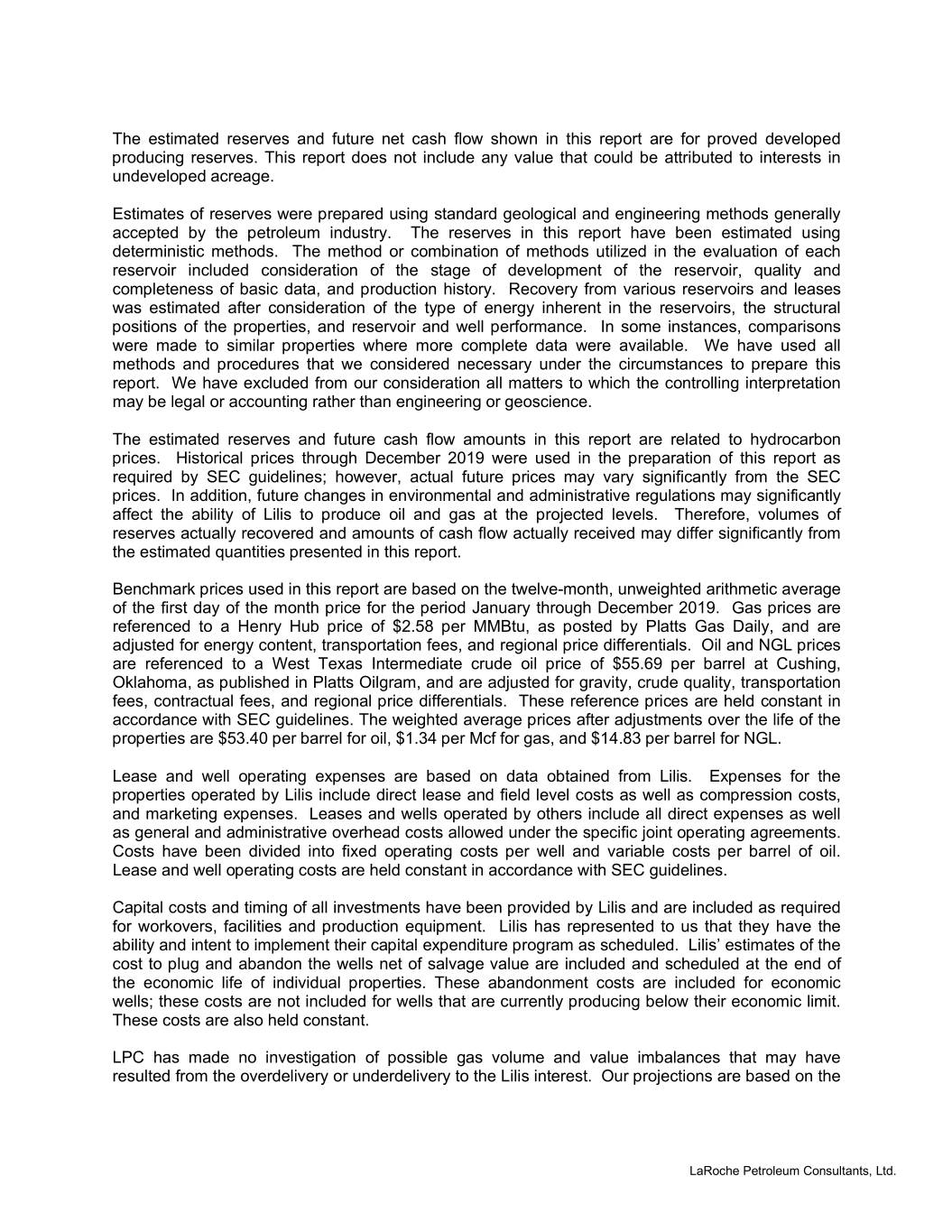 The estimated reserves and future net cash flow shown in this report are for proved developed producing reserves. This report does not include any value that could be attributed to interests in undeveloped acreage. Estimates of reserves were prepared using standard geological and engineering methods generally accepted by the petroleum industry. The reserves in this report have been estimated using deterministic methods. The method or combination of methods utilized in the evaluation of each reservoir included consideration of the stage of development of the reservoir, quality and completeness of basic data, and production history. Recovery from various reservoirs and leases was estimated after consideration of the type of energy inherent in the reservoirs, the structural positions of the properties, and reservoir and well performance. In some instances, comparisons were made to similar properties where more complete data were available. We have used all methods and procedures that we considered necessary under the circumstances to prepare this report. We have excluded from our consideration all matters to which the controlling interpretation may be legal or accounting rather than engineering or geoscience. The estimated reserves and future cash flow amounts in this report are related to hydrocarbon prices. Historical prices through December 2019 were used in the preparation of this report as required by SEC guidelines; however, actual future prices may vary significantly from the SEC prices. In addition, future changes in environmental and administrative regulations may significantly affect the ability of Lilis to produce oil and gas at the projected levels. Therefore, volumes of reserves actually recovered and amounts of cash flow actually received may differ significantly from the estimated quantities presented in this report. Benchmark prices used in this report are based on the twelve-month, unweighted arithmetic average of the first day of the month price for the period January through December 2019. Gas prices are referenced to a Henry Hub price of $2.58 per MMBtu, as posted by Platts Gas Daily, and are adjusted for energy content, transportation fees, and regional price differentials. Oil and NGL prices are referenced to a West Texas Intermediate crude oil price of $55.69 per barrel at Cushing, Oklahoma, as published in Platts Oilgram, and are adjusted for gravity, crude quality, transportation fees, contractual fees, and regional price differentials. These reference prices are held constant in accordance with SEC guidelines. The weighted average prices after adjustments over the life of the properties are $53.40 per barrel for oil, $1.34 per Mcf for gas, and $14.83 per barrel for NGL. Lease and well operating expenses are based on data obtained from Lilis. Expenses for the properties operated by Lilis include direct lease and field level costs as well as compression costs, and marketing expenses. Leases and wells operated by others include all direct expenses as well as general and administrative overhead costs allowed under the specific joint operating agreements. Costs have been divided into fixed operating costs per well and variable costs per barrel of oil. Lease and well operating costs are held constant in accordance with SEC guidelines. Capital costs and timing of all investments have been provided by Lilis and are included as required for workovers, facilities and production equipment. Lilis has represented to us that they have the ability and intent to implement their capital expenditure program as scheduled. Lilis’ estimates of the cost to plug and abandon the wells net of salvage value are included and scheduled at the end of the economic life of individual properties. These abandonment costs are included for economic wells; these costs are not included for wells that are currently producing below their economic limit. These costs are also held constant. LPC has made no investigation of possible gas volume and value imbalances that may have resulted from the overdelivery or underdelivery to the Lilis interest. Our projections are based on the LaRoche Petroleum Consultants, Ltd.