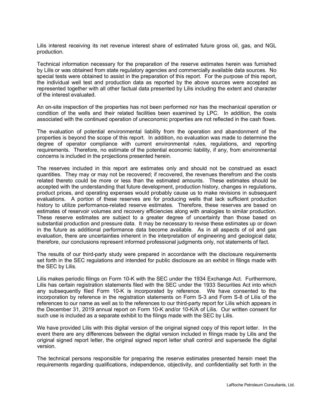 Lilis interest receiving its net revenue interest share of estimated future gross oil, gas, and NGL production. Technical information necessary for the preparation of the reserve estimates herein was furnished by Lilis or was obtained from state regulatory agencies and commercially available data sources. No special tests were obtained to assist in the preparation of this report. For the purpose of this report, the individual well test and production data as reported by the above sources were accepted as represented together with all other factual data presented by Lilis including the extent and character of the interest evaluated. An on-site inspection of the properties has not been performed nor has the mechanical operation or condition of the wells and their related facilities been examined by LPC. In addition, the costs associated with the continued operation of uneconomic properties are not reflected in the cash flows. The evaluation of potential environmental liability from the operation and abandonment of the properties is beyond the scope of this report. In addition, no evaluation was made to determine the degree of operator compliance with current environmental rules, regulations, and reporting requirements. Therefore, no estimate of the potential economic liability, if any, from environmental concerns is included in the projections presented herein. The reserves included in this report are estimates only and should not be construed as exact quantities. They may or may not be recovered; if recovered, the revenues therefrom and the costs related thereto could be more or less than the estimated amounts. These estimates should be accepted with the understanding that future development, production history, changes in regulations, product prices, and operating expenses would probably cause us to make revisions in subsequent evaluations. A portion of these reserves are for producing wells that lack sufficient production history to utilize performance-related reserve estimates. Therefore, these reserves are based on estimates of reservoir volumes and recovery efficiencies along with analogies to similar production. These reserve estimates are subject to a greater degree of uncertainty than those based on substantial production and pressure data. It may be necessary to revise these estimates up or down in the future as additional performance data become available. As in all aspects of oil and gas evaluation, there are uncertainties inherent in the interpretation of engineering and geological data; therefore, our conclusions represent informed professional judgments only, not statements of fact. The results of our third-party study were prepared in accordance with the disclosure requirements set forth in the SEC regulations and intended for public disclosure as an exhibit in filings made with the SEC by Lilis. Lilis makes periodic filings on Form 10-K with the SEC under the 1934 Exchange Act. Furthermore, Lilis has certain registration statements filed with the SEC under the 1933 Securities Act into which any subsequently filed Form 10-K is incorporated by reference. We have consented to the incorporation by reference in the registration statements on Form S-3 and Form S-8 of Lilis of the references to our name as well as to the references to our third-party report for Lilis which appears in the December 31, 2019 annual report on Form 10-K and/or 10-K/A of Lilis. Our written consent for such use is included as a separate exhibit to the filings made with the SEC by Lilis. We have provided Lilis with this digital version of the original signed copy of this report letter. In the event there are any differences between the digital version included in filings made by Lilis and the original signed report letter, the original signed report letter shall control and supersede the digital version. The technical persons responsible for preparing the reserve estimates presented herein meet the requirements regarding qualifications, independence, objectivity, and confidentiality set forth in the LaRoche Petroleum Consultants, Ltd.