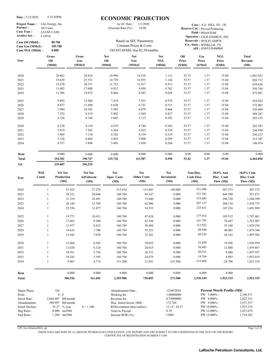 Date : 3/12/2020 2:23:03PM ECONOMIC PROJECTION Project Name : Lilis Energy, Inc. As Of Date : 1/1/2020 Case : A.G. HILL 2H - 2H Partner : All Cases Discount Rate (%) : 10.00 Reserve Cat. : Proved Producing Case Type : LEASE CASE Field : PHANTOM Archive Set : L19910 Operator : LILIS ENERGY, INC. Reservoir : Cum Oil (Mbbl) : 119.631 Based on SEC Parameters 2ND BONE SPRINGS Co., State : Cum Gas (MMcf) : 576.556 Constant Prices & Costs WINKLER, TX API : 4249533951 Cum NGL (Mbbl) : 0.000 Oil $55.69/bbl, Gas $2.58/mmbtu Gross Gross Net Net Net Oil Gas NGL Total Year Oil Gas Oil Gas NGL Price Price Price Revenue (Mbbl) (MMcf) (Mbbl) (MMcf) (Mbbl) ($/bbl) ($/Mcf) ($/bbl) (M$) 2020 79.810 283.883 59.857 166.071 10.896 52.70 1.37 15.04 3,545.732 2021 53.395 234.939 40.046 137.439 10.530 53.57 1.37 15.04 2,491.910 2022 40.635 178.795 30.476 104.595 8.014 53.57 1.37 15.04 1,896.413 2023 32.814 144.382 24.611 84.463 6.471 53.57 1.37 15.04 1,531.408 2024 27.594 121.412 20.695 71.026 5.442 53.57 1.37 15.04 1,287.775 2025 23.697 104.265 17.773 60.995 4.673 53.57 1.37 15.04 1,105.906 2026 20.812 91.574 15.609 53.571 4.104 53.57 1.37 15.04 971.293 2027 18.555 81.641 13.916 47.760 3.659 53.57 1.37 15.04 865.934 2028 16.783 73.846 12.587 43.200 3.310 53.57 1.37 15.04 783.260 2029 15.244 67.076 11.433 39.239 3.006 53.57 1.37 15.04 711.448 2030 13.998 61.591 10.498 36.031 2.761 53.57 1.37 15.04 653.274 2031 12.940 56.936 9.705 33.308 2.552 53.57 1.37 15.04 603.902 2032 12.063 53.076 9.047 31.050 2.379 53.57 1.37 15.04 562.960 2033 11.239 49.453 8.429 28.930 2.217 53.57 1.37 15.04 524.527 2034 10.546 46.402 7.909 27.145 2.080 53.57 1.37 15.04 492.170 Rem 89.716 394.750 67.287 230.929 17.693 0.00 0.00 0.00 4,186.971 Total 479.841 2,044.019 359.880 1,195.751 89.788 53.43 1.37 15.04 22,214.882 Ult 599.472 2,620.575 Well Net Tax Net Tax Net Net Net Non-Disc. 10.0% Ann 10.0% Cum Year Count Production AdValorem Oper. Costs Other Costs Investment Cash Flow Disc. Cash Disc. Cash (M$) (M$) (M$) (M$) (M$) (M$) Flow (M$) Flow (M$) 2020 1 175.056 88.643 187.596 617.602 150.000 2,326.834 2,231.161 2,231.161 2021 1 125.102 62.298 160.704 471.513 0.000 1,672.294 1,453.590 3,684.750 2022 1 95.206 47.410 160.704 358.835 0.000 1,234.258 974.803 4,659.553 2023 1 76.881 38.285 160.704 289.769 0.000 965.768 693.208 5,352.761 2024 1 64.650 32.194 160.704 243.670 0.000 786.557 513.100 5,865.861 2025 1 55.520 27.648 160.704 209.257 0.000 652.778 387.019 6,252.879 2026 1 48.762 24.282 160.704 183.786 0.000 553.759 298.446 6,551.325 2027 1 43.473 21.648 160.704 163.850 0.000 476.259 233.334 6,784.659 2028 1 39.322 19.581 160.704 148.206 0.000 415.446 185.015 6,969.674 2029 1 35.717 17.786 160.704 134.618 0.000 362.622 146.785 7,116.459 2030 1 32.796 16.332 160.704 123.611 0.000 319.831 117.695 7,234.155 2031 1 30.318 15.098 160.704 114.269 0.000 283.514 94.848 7,329.002 2032 1 28.262 14.074 160.704 106.522 0.000 253.397 77.062 7,406.064 2033 1 26.333 13.113 160.704 99.250 0.000 225.127 62.231 7,468.295 2034 1 24.708 12.304 160.704 93.127 0.000 201.326 50.594 7,518.890 Rem 210.199 104.674 2,030.671 792.248 123.500 925.679 170.009 Total 1,112.305 555.372 4,468.123 4,150.133 273.500 11,655.449 7,688.898 7,688.898 Major Phase : Oil Abandonment Date : 08/23/2047 Present Worth Profile (M$) Perfs : 0 - 0 Working Int : 1.00000000 PW 5.000% : 9,205.979 Initial Rate : 9,700.000 bbl/month Revenue Int : 0.75000000 PW 8.000% : 8,218.814 Abandonment : 389.877 bbl/month Disc. Initial Invest. (M$) : 148.511 PW 9.000% : 7,943.038 Initial Decline : 44.01 % year b = 1.001 ROInvestment (disc/undisc) : 52.77 / 43.62 PW 10.000% : 7,688.898 Beg Ratio : 4.204 mcf/bbl Years to Payout : 0.08 PW 12.000% : 7,236.290 End Ratio : 4.400 mcf/bbl Internal ROR (%) : >1000 PW 15.000% : 6,669.346 LPC Eco DetailedNGL.rpt Page 4 of 35 THESE DATA ARE PART OF A LAROCHE PETROLEUM CONSULTANTS, LTD. REPORT AND ARE SUBJECT TO THE CONDITIONS IN THE TEXT OF THE REPORT. CERTIFICATE OF REGISTRATION NUMBER F-1360 LaRoche Petroleum Consultants, Ltd.