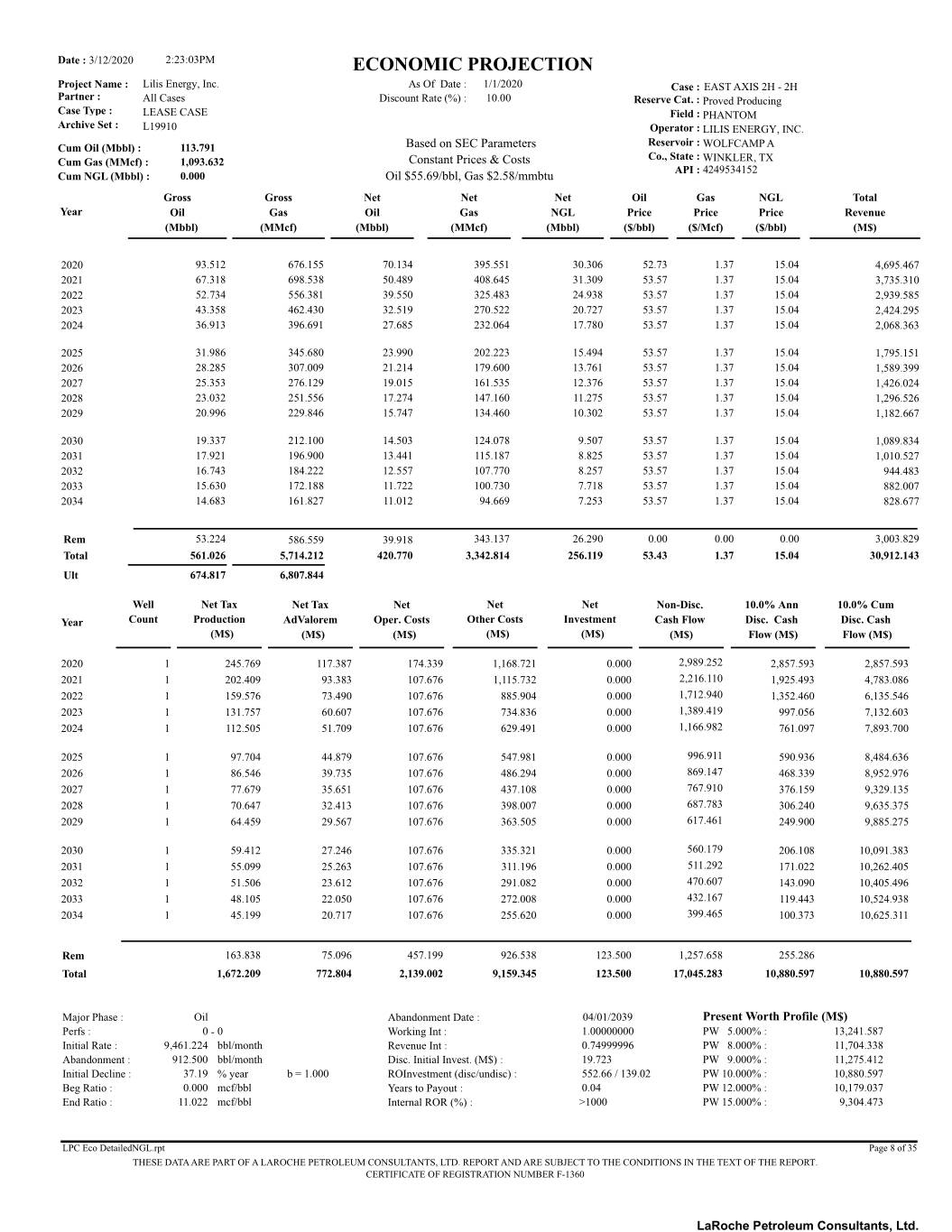 Date : 3/12/2020 2:23:03PM ECONOMIC PROJECTION Project Name : Lilis Energy, Inc. As Of Date : 1/1/2020 Case : NE AXIS 2H Partner : All Cases Discount Rate (%) : 10.00 Reserve Cat. : Proved Producing Case Type : LEASE CASE Field : PHANTOM Archive Set : L19910 Operator : LILIS ENERGY, INC. Reservoir : Cum Oil (Mbbl) : 52.198 Based on SEC Parameters WOLFCAMP A Co., State : Cum Gas (MMcf) : 830.002 Constant Prices & Costs WINKLER, TX API : Cum NGL (Mbbl) : 0.000 Oil $55.69/bbl, Gas $2.58/mmbtu Gross Gross Net Net Net Oil Gas NGL Total Year Oil Gas Oil Gas NGL Price Price Price Revenue (Mbbl) (MMcf) (Mbbl) (MMcf) (Mbbl) ($/bbl) ($/Mcf) ($/bbl) (M$) 2020 60.187 523.142 46.845 317.594 24.333 52.68 1.37 15.04 3,268.586 2021 36.204 432.510 28.178 262.572 20.118 53.57 1.37 15.04 2,171.725 2022 26.020 301.143 20.252 182.821 14.007 53.57 1.37 15.04 1,545.979 2023 20.327 231.272 15.821 140.403 10.757 53.57 1.37 15.04 1,201.611 2024 16.725 188.273 13.018 114.298 8.757 53.57 1.37 15.04 985.621 2025 14.144 158.054 11.009 95.953 7.352 53.57 1.37 15.04 831.744 2026 12.282 136.508 9.559 82.872 6.350 53.57 1.37 15.04 721.091 2027 10.853 120.139 8.447 72.935 5.588 53.57 1.37 15.04 636.468 2028 9.748 107.559 7.587 65.298 5.003 53.57 1.37 15.04 571.128 2029 8.804 96.886 6.852 58.818 4.507 53.57 1.37 15.04 515.405 2030 8.045 88.351 6.262 53.637 4.110 53.57 1.37 15.04 470.718 2031 7.407 81.199 5.765 49.295 3.777 53.57 1.37 15.04 433.169 2032 6.881 75.317 5.356 45.724 3.503 53.57 1.37 15.04 402.232 2033 6.392 69.874 4.975 42.420 3.250 53.57 1.37 15.04 373.512 2034 5.983 65.325 4.657 39.658 3.039 53.57 1.37 15.04 349.485 Rem 45.638 497.939 35.521 302.294 23.161 0.00 0.00 0.00 2,665.256 Total 295.641 3,173.493 230.103 1,926.593 147.611 53.39 1.37 15.04 17,143.727 Ult 347.839 4,003.495 Well Net Tax Net Tax Net Net Net Non-Disc. 10.0% Ann 10.0% Cum Year Count Production AdValorem Oper. Costs Other Costs Investment Cash Flow Disc. Cash Disc. Cash (M$) (M$) (M$) (M$) (M$) (M$) Flow (M$) Flow (M$) 2020 1 174.186 81.715 174.339 881.884 0.000 1,956.462 1,874.181 1,874.181 2021 1 119.516 54.293 107.676 686.671 0.000 1,203.568 1,046.831 2,921.013 2022 1 84.779 38.649 107.676 480.651 0.000 834.223 659.102 3,580.115 2023 1 65.770 30.040 107.676 370.207 0.000 627.919 450.818 4,030.932 2024 1 53.884 24.641 107.676 301.932 0.000 497.488 324.590 4,355.523 2025 1 45.435 20.794 107.676 253.795 0.000 404.044 239.585 4,595.108 2026 1 39.367 18.027 107.676 219.402 0.000 336.618 181.441 4,776.549 2027 1 34.732 15.912 107.676 193.232 0.000 284.916 139.605 4,916.154 2028 1 31.155 14.278 107.676 173.097 0.000 244.922 109.085 5,025.239 2029 1 28.107 12.885 107.676 155.991 0.000 210.745 85.315 5,110.555 2030 1 25.664 11.768 107.676 142.303 0.000 183.307 67.462 5,178.016 2031 1 23.613 10.829 107.676 130.825 0.000 160.226 53.607 5,231.624 2032 1 21.922 10.056 107.676 121.382 0.000 141.196 42.944 5,274.568 2033 1 20.354 9.338 107.676 112.636 0.000 123.509 34.144 5,308.712 2034 1 19.042 8.737 107.676 105.325 0.000 108.704 27.320 5,336.032 Rem 145.212 66.631 1,160.174 802.936 123.500 366.803 76.579 Total 932.740 428.593 2,841.977 5,132.270 123.500 7,684.647 5,412.611 5,412.611 Major Phase : Oil Abandonment Date : 10/13/2045 Present Worth Profile (M$) Perfs : 0 - 0 Working Int : 1.00000000 PW 5.000% : 6,311.733 Initial Rate : 7,014.484 bbl/month Revenue Int : 0.77831945 PW 8.000% : 5,731.252 Abandonment : 247.983 bbl/month Disc. Initial Invest. (M$) : 10.580 PW 9.000% : 5,566.056 Initial Decline : 59.54 % year b = 1.000 ROInvestment (disc/undisc) : 512.61 / 63.22 PW 10.000% : 5,412.611 Beg Ratio : 0.000 mcf/bbl Years to Payout : 0.05 PW 12.000% : 5,136.395 End Ratio : 10.911 mcf/bbl Internal ROR (%) : >1000 PW 15.000% : 4,784.949 LPC Eco DetailedNGL.rpt Page 25 of 35 THESE DATA ARE PART OF A LAROCHE PETROLEUM CONSULTANTS, LTD. REPORT AND ARE SUBJECT TO THE CONDITIONS IN THE TEXT OF THE REPORT. CERTIFICATE OF REGISTRATION NUMBER F-1360 LaRoche Petroleum Consultants, Ltd.