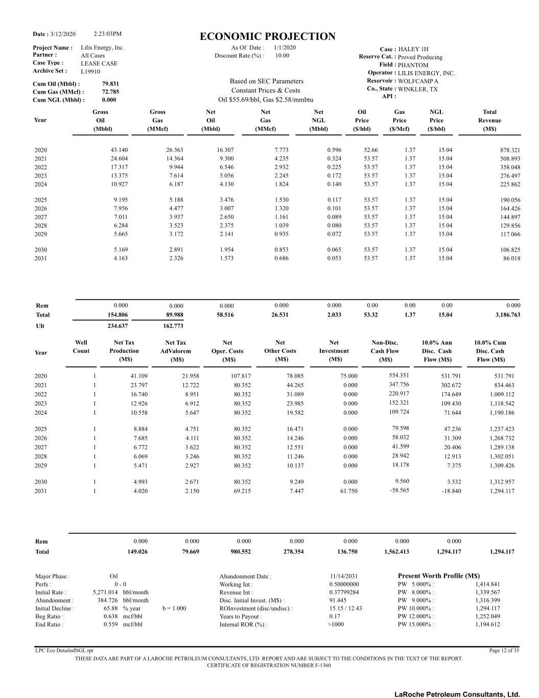 Date : 3/12/2020 2:23:03PM ECONOMIC PROJECTION Project Name : Lilis Energy, Inc. As Of Date : 1/1/2020 Case : HALEY 1H Partner : All Cases Discount Rate (%) : 10.00 Reserve Cat. : Proved Producing Case Type : LEASE CASE Field : PHANTOM Archive Set : L19910 Operator : LILIS ENERGY, INC. Reservoir : Cum Oil (Mbbl) : 79.831 Based on SEC Parameters WOLFCAMP A Co., State : Cum Gas (MMcf) : 72.785 Constant Prices & Costs WINKLER, TX API : Cum NGL (Mbbl) : 0.000 Oil $55.69/bbl, Gas $2.58/mmbtu Gross Gross Net Net Net Oil Gas NGL Total Year Oil Gas Oil Gas NGL Price Price Price Revenue (Mbbl) (MMcf) (Mbbl) (MMcf) (Mbbl) ($/bbl) ($/Mcf) ($/bbl) (M$) 2020 43.140 26.363 16.307 7.773 0.596 52.66 1.37 15.04 878.321 2021 24.604 14.364 9.300 4.235 0.324 53.57 1.37 15.04 508.893 2022 17.317 9.944 6.546 2.932 0.225 53.57 1.37 15.04 358.048 2023 13.375 7.614 5.056 2.245 0.172 53.57 1.37 15.04 276.497 2024 10.927 6.187 4.130 1.824 0.140 53.57 1.37 15.04 225.862 2025 9.195 5.188 3.476 1.530 0.117 53.57 1.37 15.04 190.056 2026 7.956 4.477 3.007 1.320 0.101 53.57 1.37 15.04 164.426 2027 7.011 3.937 2.650 1.161 0.089 53.57 1.37 15.04 144.897 2028 6.284 3.523 2.375 1.039 0.080 53.57 1.37 15.04 129.856 2029 5.665 3.172 2.141 0.935 0.072 53.57 1.37 15.04 117.066 2030 5.169 2.891 1.954 0.853 0.065 53.57 1.37 15.04 106.825 2031 4.163 2.326 1.573 0.686 0.053 53.57 1.37 15.04 86.018 Rem 0.000 0.000 0.000 0.000 0.000 0.00 0.00 0.00 0.000 Total 154.806 89.988 58.516 26.531 2.033 53.32 1.37 15.04 3,186.763 Ult 234.637 162.773 Well Net Tax Net Tax Net Net Net Non-Disc. 10.0% Ann 10.0% Cum Year Count Production AdValorem Oper. Costs Other Costs Investment Cash Flow Disc. Cash Disc. Cash (M$) (M$) (M$) (M$) (M$) (M$) Flow (M$) Flow (M$) 2020 1 41.109 21.958 107.817 78.085 75.000 554.351 531.791 531.791 2021 1 23.797 12.722 80.352 44.265 0.000 347.756 302.672 834.463 2022 1 16.740 8.951 80.352 31.089 0.000 220.917 174.649 1,009.112 2023 1 12.926 6.912 80.352 23.985 0.000 152.321 109.430 1,118.542 2024 1 10.558 5.647 80.352 19.582 0.000 109.724 71.644 1,190.186 2025 1 8.884 4.751 80.352 16.471 0.000 79.598 47.236 1,237.423 2026 1 7.685 4.111 80.352 14.246 0.000 58.032 31.309 1,268.732 2027 1 6.772 3.622 80.352 12.551 0.000 41.599 20.406 1,289.138 2028 1 6.069 3.246 80.352 11.246 0.000 28.942 12.913 1,302.051 2029 1 5.471 2.927 80.352 10.137 0.000 18.178 7.375 1,309.426 2030 1 4.993 2.671 80.352 9.249 0.000 9.560 3.532 1,312.957 2031 1 4.020 2.150 69.215 7.447 61.750 -58.565 -18.840 1,294.117 Rem 0.000 0.000 0.000 0.000 0.000 0.000 0.000 Total 149.026 79.669 980.552 278.354 136.750 1,562.413 1,294.117 1,294.117 Major Phase : Oil Abandonment Date : 11/14/2031 Present Worth Profile (M$) Perfs : 0 - 0 Working Int : 0.50000000 PW 5.000% : 1,414.841 Initial Rate : 5,271.014 bbl/month Revenue Int : 0.37799284 PW 8.000% : 1,339.567 Abandonment : 384.726 bbl/month Disc. Initial Invest. (M$) : 91.445 PW 9.000% : 1,316.399 Initial Decline : 65.88 % year b = 1.000 ROInvestment (disc/undisc) : 15.15 / 12.43 PW 10.000% : 1,294.117 Beg Ratio : 0.638 mcf/bbl Years to Payout : 0.17 PW 12.000% : 1,252.049 End Ratio : 0.559 mcf/bbl Internal ROR (%) : >1000 PW 15.000% : 1,194.612 LPC Eco DetailedNGL.rpt Page 12 of 35 THESE DATA ARE PART OF A LAROCHE PETROLEUM CONSULTANTS, LTD. REPORT AND ARE SUBJECT TO THE CONDITIONS IN THE TEXT OF THE REPORT. CERTIFICATE OF REGISTRATION NUMBER F-1360 LaRoche Petroleum Consultants, Ltd.