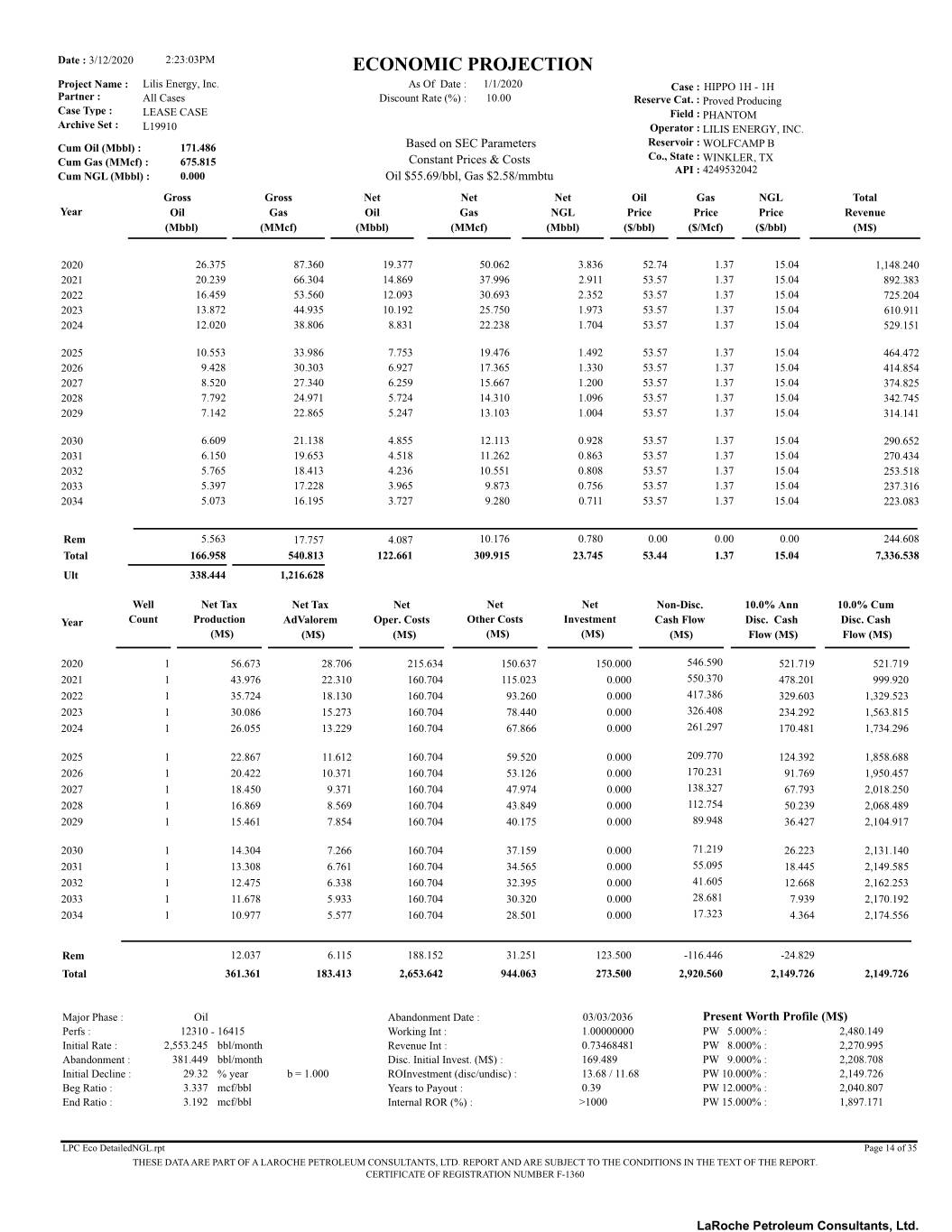 Date : 3/12/2020 2:23:03PM ECONOMIC PROJECTION Project Name : Lilis Energy, Inc. As Of Date : 1/1/2020 Case : HIPPO 1H - 1H Partner : All Cases Discount Rate (%) : 10.00 Reserve Cat. : Proved Producing Case Type : LEASE CASE Field : PHANTOM Archive Set : L19910 Operator : LILIS ENERGY, INC. Reservoir : Cum Oil (Mbbl) : 171.486 Based on SEC Parameters WOLFCAMP B Co., State : Cum Gas (MMcf) : 675.815 Constant Prices & Costs WINKLER, TX API : 4249532042 Cum NGL (Mbbl) : 0.000 Oil $55.69/bbl, Gas $2.58/mmbtu Gross Gross Net Net Net Oil Gas NGL Total Year Oil Gas Oil Gas NGL Price Price Price Revenue (Mbbl) (MMcf) (Mbbl) (MMcf) (Mbbl) ($/bbl) ($/Mcf) ($/bbl) (M$) 2020 26.375 87.360 19.377 50.062 3.836 52.74 1.37 15.04 1,148.240 2021 20.239 66.304 14.869 37.996 2.911 53.57 1.37 15.04 892.383 2022 16.459 53.560 12.093 30.693 2.352 53.57 1.37 15.04 725.204 2023 13.872 44.935 10.192 25.750 1.973 53.57 1.37 15.04 610.911 2024 12.020 38.806 8.831 22.238 1.704 53.57 1.37 15.04 529.151 2025 10.553 33.986 7.753 19.476 1.492 53.57 1.37 15.04 464.472 2026 9.428 30.303 6.927 17.365 1.330 53.57 1.37 15.04 414.854 2027 8.520 27.340 6.259 15.667 1.200 53.57 1.37 15.04 374.825 2028 7.792 24.971 5.724 14.310 1.096 53.57 1.37 15.04 342.745 2029 7.142 22.865 5.247 13.103 1.004 53.57 1.37 15.04 314.141 2030 6.609 21.138 4.855 12.113 0.928 53.57 1.37 15.04 290.652 2031 6.150 19.653 4.518 11.262 0.863 53.57 1.37 15.04 270.434 2032 5.765 18.413 4.236 10.551 0.808 53.57 1.37 15.04 253.518 2033 5.397 17.228 3.965 9.873 0.756 53.57 1.37 15.04 237.316 2034 5.073 16.195 3.727 9.280 0.711 53.57 1.37 15.04 223.083 Rem 5.563 17.757 4.087 10.176 0.780 0.00 0.00 0.00 244.608 Total 166.958 540.813 122.661 309.915 23.745 53.44 1.37 15.04 7,336.538 Ult 338.444 1,216.628 Well Net Tax Net Tax Net Net Net Non-Disc. 10.0% Ann 10.0% Cum Year Count Production AdValorem Oper. Costs Other Costs Investment Cash Flow Disc. Cash Disc. Cash (M$) (M$) (M$) (M$) (M$) (M$) Flow (M$) Flow (M$) 2020 1 56.673 28.706 215.634 150.637 150.000 546.590 521.719 521.719 2021 1 43.976 22.310 160.704 115.023 0.000 550.370 478.201 999.920 2022 1 35.724 18.130 160.704 93.260 0.000 417.386 329.603 1,329.523 2023 1 30.086 15.273 160.704 78.440 0.000 326.408 234.292 1,563.815 2024 1 26.055 13.229 160.704 67.866 0.000 261.297 170.481 1,734.296 2025 1 22.867 11.612 160.704 59.520 0.000 209.770 124.392 1,858.688 2026 1 20.422 10.371 160.704 53.126 0.000 170.231 91.769 1,950.457 2027 1 18.450 9.371 160.704 47.974 0.000 138.327 67.793 2,018.250 2028 1 16.869 8.569 160.704 43.849 0.000 112.754 50.239 2,068.489 2029 1 15.461 7.854 160.704 40.175 0.000 89.948 36.427 2,104.917 2030 1 14.304 7.266 160.704 37.159 0.000 71.219 26.223 2,131.140 2031 1 13.308 6.761 160.704 34.565 0.000 55.095 18.445 2,149.585 2032 1 12.475 6.338 160.704 32.395 0.000 41.605 12.668 2,162.253 2033 1 11.678 5.933 160.704 30.320 0.000 28.681 7.939 2,170.192 2034 1 10.977 5.577 160.704 28.501 0.000 17.323 4.364 2,174.556 Rem 12.037 6.115 188.152 31.251 123.500 -116.446 -24.829 Total 361.361 183.413 2,653.642 944.063 273.500 2,920.560 2,149.726 2,149.726 Major Phase : Oil Abandonment Date : 03/03/2036 Present Worth Profile (M$) Perfs : 12310 - 16415 Working Int : 1.00000000 PW 5.000% : 2,480.149 Initial Rate : 2,553.245 bbl/month Revenue Int : 0.73468481 PW 8.000% : 2,270.995 Abandonment : 381.449 bbl/month Disc. Initial Invest. (M$) : 169.489 PW 9.000% : 2,208.708 Initial Decline : 29.32 % year b = 1.000 ROInvestment (disc/undisc) : 13.68 / 11.68 PW 10.000% : 2,149.726 Beg Ratio : 3.337 mcf/bbl Years to Payout : 0.39 PW 12.000% : 2,040.807 End Ratio : 3.192 mcf/bbl Internal ROR (%) : >1000 PW 15.000% : 1,897.171 LPC Eco DetailedNGL.rpt Page 14 of 35 THESE DATA ARE PART OF A LAROCHE PETROLEUM CONSULTANTS, LTD. REPORT AND ARE SUBJECT TO THE CONDITIONS IN THE TEXT OF THE REPORT. CERTIFICATE OF REGISTRATION NUMBER F-1360 LaRoche Petroleum Consultants, Ltd.