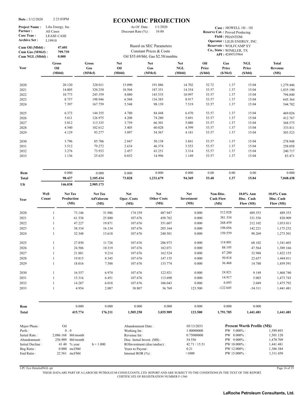 Date : 3/12/2020 2:23:03PM ECONOMIC PROJECTION Project Name : Lilis Energy, Inc. As Of Date : 1/1/2020 Case : HOWELL 1H - 1H Partner : All Cases Discount Rate (%) : 10.00 Reserve Cat. : Proved Producing Case Type : LEASE CASE Field : PHANTOM Archive Set : L19910 Operator : LILIS ENERGY, INC. Reservoir : Cum Oil (Mbbl) : 47.601 Based on SEC Parameters WOLFCAMP XY Co., State : Cum Gas (MMcf) : 799.739 Constant Prices & Costs WINKLER, TX API : 4249533964 Cum NGL (Mbbl) : 0.000 Oil $55.69/bbl, Gas $2.58/mmbtu Gross Gross Net Net Net Oil Gas NGL Total Year Oil Gas Oil Gas NGL Price Price Price Revenue (Mbbl) (MMcf) (Mbbl) (MMcf) (Mbbl) ($/bbl) ($/Mcf) ($/bbl) (M$) 2020 20.120 328.011 15.090 191.886 14.702 52.72 1.37 15.04 1,279.446 2021 14.005 320.258 10.504 187.351 14.354 53.57 1.37 15.04 1,035.190 2022 10.773 245.359 8.080 143.535 10.997 53.57 1.37 15.04 794.840 2023 8.757 198.946 6.568 116.383 8.917 53.57 1.37 15.04 645.364 2024 7.397 167.759 5.548 98.139 7.519 53.57 1.37 15.04 544.702 2025 6.373 144.355 4.780 84.448 6.470 53.57 1.37 15.04 469.026 2026 5.611 126.975 4.208 74.280 5.691 53.57 1.37 15.04 412.767 2027 5.012 113.335 3.759 66.301 5.080 53.57 1.37 15.04 368.575 2028 4.540 102.612 3.405 60.028 4.599 53.57 1.37 15.04 333.811 2029 4.129 93.277 3.097 54.567 4.181 53.57 1.37 15.04 303.523 2030 3.796 85.706 2.847 50.138 3.841 53.57 1.37 15.04 278.948 2031 3.512 79.272 2.634 46.374 3.553 53.57 1.37 15.04 258.058 2032 3.276 73.933 2.457 43.251 3.314 53.57 1.37 15.04 240.717 2033 1.136 25.635 0.852 14.996 1.149 53.57 1.37 15.04 83.471 Rem 0.000 0.000 0.000 0.000 0.000 0.00 0.00 0.00 0.000 Total 98.437 2,105.434 73.828 1,231.679 94.369 53.40 1.37 15.04 7,048.438 Ult 146.038 2,905.173 Well Net Tax Net Tax Net Net Net Non-Disc. 10.0% Ann 10.0% Cum Year Count Production AdValorem Oper. Costs Other Costs Investment Cash Flow Disc. Cash Disc. Cash (M$) (M$) (M$) (M$) (M$) (M$) Flow (M$) Flow (M$) 2020 1 73.146 31.986 174.339 487.947 0.000 512.028 489.353 489.353 2021 1 61.538 25.880 107.676 458.762 0.000 381.334 331.556 820.909 2022 1 47.227 19.871 107.676 351.607 0.000 268.459 212.102 1,033.011 2023 1 38.334 16.134 107.676 285.164 0.000 198.056 142.221 1,175.232 2024 1 32.348 13.618 107.676 240.501 0.000 150.559 98.269 1,273.501 2025 1 27.850 11.726 107.676 206.973 0.000 114.801 68.102 1,341.603 2026 1 24.506 10.319 107.676 182.071 0.000 88.195 47.564 1,389.166 2027 1 21.881 9.214 107.676 162.524 0.000 67.280 32.988 1,422.155 2028 1 19.815 8.345 107.676 147.155 0.000 50.818 22.657 1,444.811 2029 1 18.016 7.588 107.676 133.774 0.000 36.468 14.780 1,459.591 2030 1 16.557 6.974 107.676 122.921 0.000 24.821 9.149 1,468.740 2031 1 15.316 6.451 107.676 113.698 0.000 14.917 5.003 1,473.743 2032 1 14.287 6.018 107.676 106.043 0.000 6.693 2.049 1,475.792 2033 1 4.954 2.087 38.807 36.769 123.500 -122.645 -34.311 1,441.481 Rem 0.000 0.000 0.000 0.000 0.000 0.000 0.000 Total 415.774 176.211 1,505.258 3,035.909 123.500 1,791.785 1,441.481 1,441.481 Major Phase : Oil Abandonment Date : 05/13/2033 Present Worth Profile (M$) Perfs : 0 - 0 Working Int : 1.00000000 PW 5.000% : 1,599.893 Initial Rate : 2,086.168 bbl/month Revenue Int : 0.75000000 PW 8.000% : 1,501.120 Abandonment : 256.909 bbl/month Disc. Initial Invest. (M$) : 34.556 PW 9.000% : 1,470.709 Initial Decline : 41.40 % year b = 1.000 ROInvestment (disc/undisc) : 42.71 / 15.51 PW 10.000% : 1,441.481 Beg Ratio : 0.000 mcf/bbl Years to Payout : 0.21 PW 12.000% : 1,386.384 End Ratio : 22.561 mcf/bbl Internal ROR (%) : >1000 PW 15.000% : 1,311.450 LPC Eco DetailedNGL.rpt Page 16 of 35 THESE DATA ARE PART OF A LAROCHE PETROLEUM CONSULTANTS, LTD. REPORT AND ARE SUBJECT TO THE CONDITIONS IN THE TEXT OF THE REPORT. CERTIFICATE OF REGISTRATION NUMBER F-1360 LaRoche Petroleum Consultants, Ltd.