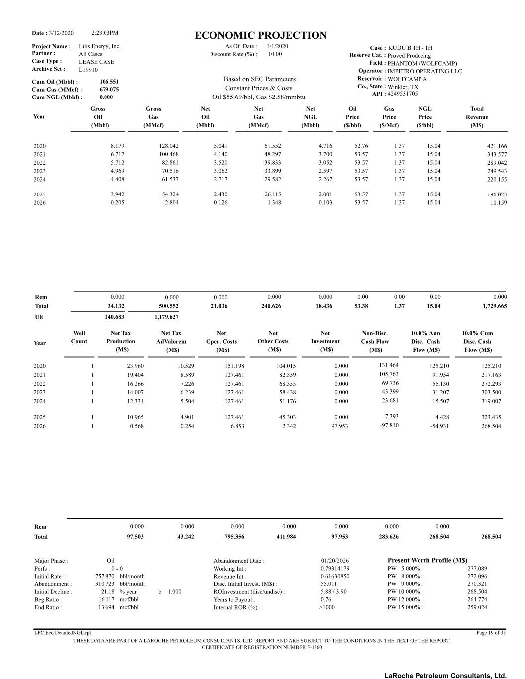 Date : 3/12/2020 2:23:03PM ECONOMIC PROJECTION Project Name : Lilis Energy, Inc. As Of Date : 1/1/2020 Case : KUDU B 1H - 1H Partner : All Cases Discount Rate (%) : 10.00 Reserve Cat. : Proved Producing Case Type : LEASE CASE Field : PHANTOM (WOLFCAMP) Archive Set : L19910 Operator : IMPETRO OPERATING LLC Reservoir : Cum Oil (Mbbl) : 106.551 Based on SEC Parameters WOLFCAMP A Co., State : Cum Gas (MMcf) : 679.075 Constant Prices & Costs Winkler, TX API : 4249531705 Cum NGL (Mbbl) : 0.000 Oil $55.69/bbl, Gas $2.58/mmbtu Gross Gross Net Net Net Oil Gas NGL Total Year Oil Gas Oil Gas NGL Price Price Price Revenue (Mbbl) (MMcf) (Mbbl) (MMcf) (Mbbl) ($/bbl) ($/Mcf) ($/bbl) (M$) 2020 8.179 128.042 5.041 61.552 4.716 52.76 1.37 15.04 421.166 2021 6.717 100.468 4.140 48.297 3.700 53.57 1.37 15.04 343.577 2022 5.712 82.861 3.520 39.833 3.052 53.57 1.37 15.04 289.042 2023 4.969 70.516 3.062 33.899 2.597 53.57 1.37 15.04 249.543 2024 4.408 61.537 2.717 29.582 2.267 53.57 1.37 15.04 220.155 2025 3.942 54.324 2.430 26.115 2.001 53.57 1.37 15.04 196.023 2026 0.205 2.804 0.126 1.348 0.103 53.57 1.37 15.04 10.159 Rem 0.000 0.000 0.000 0.000 0.000 0.00 0.00 0.00 0.000 Total 34.132 500.552 21.036 240.626 18.436 53.38 1.37 15.04 1,729.665 Ult 140.683 1,179.627 Well Net Tax Net Tax Net Net Net Non-Disc. 10.0% Ann 10.0% Cum Year Count Production AdValorem Oper. Costs Other Costs Investment Cash Flow Disc. Cash Disc. Cash (M$) (M$) (M$) (M$) (M$) (M$) Flow (M$) Flow (M$) 2020 1 23.960 10.529 151.198 104.015 0.000 131.464 125.210 125.210 2021 1 19.404 8.589 127.461 82.359 0.000 105.763 91.954 217.163 2022 1 16.266 7.226 127.461 68.353 0.000 69.736 55.130 272.293 2023 1 14.007 6.239 127.461 58.438 0.000 43.399 31.207 303.500 2024 1 12.334 5.504 127.461 51.176 0.000 23.681 15.507 319.007 2025 1 10.965 4.901 127.461 45.303 0.000 7.393 4.428 323.435 2026 1 0.568 0.254 6.853 2.342 97.953 -97.810 -54.931 268.504 Rem 0.000 0.000 0.000 0.000 0.000 0.000 0.000 Total 97.503 43.242 795.356 411.984 97.953 283.626 268.504 268.504 Major Phase : Oil Abandonment Date : 01/20/2026 Present Worth Profile (M$) Perfs : 0 - 0 Working Int : 0.79314179 PW 5.000% : 277.089 Initial Rate : 757.870 bbl/month Revenue Int : 0.61630850 PW 8.000% : 272.096 Abandonment : 310.723 bbl/month Disc. Initial Invest. (M$) : 55.011 PW 9.000% : 270.321 Initial Decline : 21.18 % year b = 1.000 ROInvestment (disc/undisc) : 5.88 / 3.90 PW 10.000% : 268.504 Beg Ratio : 16.117 mcf/bbl Years to Payout : 0.76 PW 12.000% : 264.774 End Ratio : 13.694 mcf/bbl Internal ROR (%) : >1000 PW 15.000% : 259.024 LPC Eco DetailedNGL.rpt Page 19 of 35 THESE DATA ARE PART OF A LAROCHE PETROLEUM CONSULTANTS, LTD. REPORT AND ARE SUBJECT TO THE CONDITIONS IN THE TEXT OF THE REPORT. CERTIFICATE OF REGISTRATION NUMBER F-1360 LaRoche Petroleum Consultants, Ltd.
