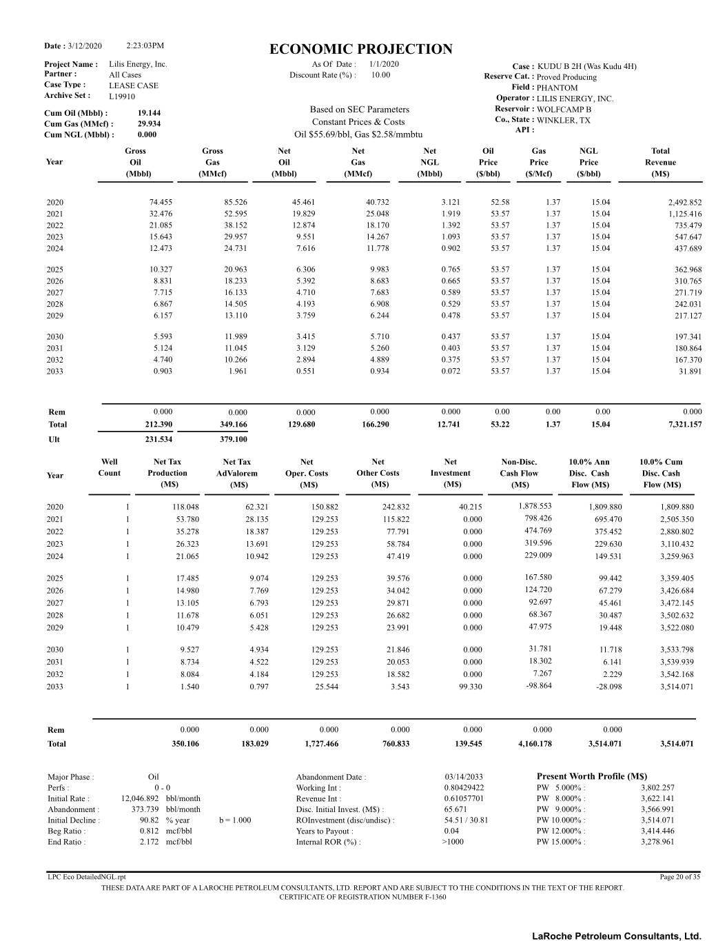 Date : 3/12/2020 2:23:03PM ECONOMIC PROJECTION Project Name : Lilis Energy, Inc. As Of Date : 1/1/2020 Case : KUDU B 2H (Was Kudu 4H) Partner : All Cases Discount Rate (%) : 10.00 Reserve Cat. : Proved Producing Case Type : LEASE CASE Field : PHANTOM Archive Set : L19910 Operator : LILIS ENERGY, INC. Reservoir : Cum Oil (Mbbl) : 19.144 Based on SEC Parameters WOLFCAMP B Co., State : Cum Gas (MMcf) : 29.934 Constant Prices & Costs WINKLER, TX API : Cum NGL (Mbbl) : 0.000 Oil $55.69/bbl, Gas $2.58/mmbtu Gross Gross Net Net Net Oil Gas NGL Total Year Oil Gas Oil Gas NGL Price Price Price Revenue (Mbbl) (MMcf) (Mbbl) (MMcf) (Mbbl) ($/bbl) ($/Mcf) ($/bbl) (M$) 2020 74.455 85.526 45.461 40.732 3.121 52.58 1.37 15.04 2,492.852 2021 32.476 52.595 19.829 25.048 1.919 53.57 1.37 15.04 1,125.416 2022 21.085 38.152 12.874 18.170 1.392 53.57 1.37 15.04 735.479 2023 15.643 29.957 9.551 14.267 1.093 53.57 1.37 15.04 547.647 2024 12.473 24.731 7.616 11.778 0.902 53.57 1.37 15.04 437.689 2025 10.327 20.963 6.306 9.983 0.765 53.57 1.37 15.04 362.968 2026 8.831 18.233 5.392 8.683 0.665 53.57 1.37 15.04 310.765 2027 7.715 16.133 4.710 7.683 0.589 53.57 1.37 15.04 271.719 2028 6.867 14.505 4.193 6.908 0.529 53.57 1.37 15.04 242.031 2029 6.157 13.110 3.759 6.244 0.478 53.57 1.37 15.04 217.127 2030 5.593 11.989 3.415 5.710 0.437 53.57 1.37 15.04 197.341 2031 5.124 11.045 3.129 5.260 0.403 53.57 1.37 15.04 180.864 2032 4.740 10.266 2.894 4.889 0.375 53.57 1.37 15.04 167.370 2033 0.903 1.961 0.551 0.934 0.072 53.57 1.37 15.04 31.891 Rem 0.000 0.000 0.000 0.000 0.000 0.00 0.00 0.00 0.000 Total 212.390 349.166 129.680 166.290 12.741 53.22 1.37 15.04 7,321.157 Ult 231.534 379.100 Well Net Tax Net Tax Net Net Net Non-Disc. 10.0% Ann 10.0% Cum Year Count Production AdValorem Oper. Costs Other Costs Investment Cash Flow Disc. Cash Disc. Cash (M$) (M$) (M$) (M$) (M$) (M$) Flow (M$) Flow (M$) 2020 1 118.048 62.321 150.882 242.832 40.215 1,878.553 1,809.880 1,809.880 2021 1 53.780 28.135 129.253 115.822 0.000 798.426 695.470 2,505.350 2022 1 35.278 18.387 129.253 77.791 0.000 474.769 375.452 2,880.802 2023 1 26.323 13.691 129.253 58.784 0.000 319.596 229.630 3,110.432 2024 1 21.065 10.942 129.253 47.419 0.000 229.009 149.531 3,259.963 2025 1 17.485 9.074 129.253 39.576 0.000 167.580 99.442 3,359.405 2026 1 14.980 7.769 129.253 34.042 0.000 124.720 67.279 3,426.684 2027 1 13.105 6.793 129.253 29.871 0.000 92.697 45.461 3,472.145 2028 1 11.678 6.051 129.253 26.682 0.000 68.367 30.487 3,502.632 2029 1 10.479 5.428 129.253 23.991 0.000 47.975 19.448 3,522.080 2030 1 9.527 4.934 129.253 21.846 0.000 31.781 11.718 3,533.798 2031 1 8.734 4.522 129.253 20.053 0.000 18.302 6.141 3,539.939 2032 1 8.084 4.184 129.253 18.582 0.000 7.267 2.229 3,542.168 2033 1 1.540 0.797 25.544 3.543 99.330 -98.864 -28.098 3,514.071 Rem 0.000 0.000 0.000 0.000 0.000 0.000 0.000 Total 350.106 183.029 1,727.466 760.833 139.545 4,160.178 3,514.071 3,514.071 Major Phase : Oil Abandonment Date : 03/14/2033 Present Worth Profile (M$) Perfs : 0 - 0 Working Int : 0.80429422 PW 5.000% : 3,802.257 Initial Rate : 12,046.892 bbl/month Revenue Int : 0.61057701 PW 8.000% : 3,622.141 Abandonment : 373.739 bbl/month Disc. Initial Invest. (M$) : 65.671 PW 9.000% : 3,566.991 Initial Decline : 90.82 % year b = 1.000 ROInvestment (disc/undisc) : 54.51 / 30.81 PW 10.000% : 3,514.071 Beg Ratio : 0.812 mcf/bbl Years to Payout : 0.04 PW 12.000% : 3,414.446 End Ratio : 2.172 mcf/bbl Internal ROR (%) : >1000 PW 15.000% : 3,278.961 LPC Eco DetailedNGL.rpt Page 20 of 35 THESE DATA ARE PART OF A LAROCHE PETROLEUM CONSULTANTS, LTD. REPORT AND ARE SUBJECT TO THE CONDITIONS IN THE TEXT OF THE REPORT. CERTIFICATE OF REGISTRATION NUMBER F-1360 LaRoche Petroleum Consultants, Ltd.