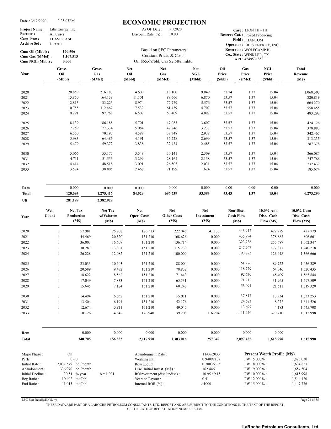 Date : 3/12/2020 2:23:03PM ECONOMIC PROJECTION Project Name : Lilis Energy, Inc. As Of Date : 1/1/2020 Case : LION 1H - 1H Partner : All Cases Discount Rate (%) : 10.00 Reserve Cat. : Proved Producing Case Type : LEASE CASE Field : PHANTOM Archive Set : L19910 Operator : LILIS ENERGY, INC. Reservoir : Cum Oil (Mbbl) : 160.506 Based on SEC Parameters WOLFCAMP B Co., State : Cum Gas (MMcf) : 1,107.513 Constant Prices & Costs WINKLER, TX API : 4249531858 Cum NGL (Mbbl) : 0.000 Oil $55.69/bbl, Gas $2.58/mmbtu Gross Gross Net Net Net Oil Gas NGL Total Year Oil Gas Oil Gas NGL Price Price Price Revenue (Mbbl) (MMcf) (Mbbl) (MMcf) (Mbbl) ($/bbl) ($/Mcf) ($/bbl) (M$) 2020 20.859 216.187 14.609 118.100 9.049 52.74 1.37 15.04 1,068.303 2021 15.850 164.138 11.101 89.666 6.870 53.57 1.37 15.04 820.819 2022 12.813 133.225 8.974 72.779 5.576 53.57 1.37 15.04 664.270 2023 10.755 112.467 7.532 61.439 4.707 53.57 1.37 15.04 558.455 2024 9.291 97.768 6.507 53.409 4.092 53.57 1.37 15.04 483.293 2025 8.139 86.188 5.701 47.083 3.607 53.57 1.37 15.04 424.126 2026 7.259 77.334 5.084 42.246 3.237 53.57 1.37 15.04 378.883 2027 6.550 70.197 4.588 38.348 2.938 53.57 1.37 15.04 342.467 2028 5.983 64.486 4.191 35.228 2.699 53.57 1.37 15.04 313.335 2029 5.479 59.372 3.838 32.434 2.485 53.57 1.37 15.04 287.378 2030 5.066 55.175 3.548 30.141 2.309 53.57 1.37 15.04 266.085 2031 4.711 51.556 3.299 28.164 2.158 53.57 1.37 15.04 247.766 2032 4.414 48.518 3.091 26.505 2.031 53.57 1.37 15.04 232.437 2033 3.524 38.805 2.468 21.199 1.624 53.57 1.37 15.04 185.674 Rem 0.000 0.000 0.000 0.000 0.000 0.00 0.00 0.00 0.000 Total 120.693 1,275.416 84.529 696.739 53.383 53.43 1.37 15.04 6,273.290 Ult 281.199 2,382.929 Well Net Tax Net Tax Net Net Net Non-Disc. 10.0% Ann 10.0% Cum Year Count Production AdValorem Oper. Costs Other Costs Investment Cash Flow Disc. Cash Disc. Cash (M$) (M$) (M$) (M$) (M$) (M$) Flow (M$) Flow (M$) 2020 1 57.981 26.708 176.513 222.046 141.138 443.917 427.779 427.779 2021 1 44.469 20.520 151.210 168.626 0.000 435.994 378.882 806.661 2022 1 36.003 16.607 151.210 136.714 0.000 323.736 255.687 1,062.347 2023 1 30.287 13.961 151.210 115.230 0.000 247.767 177.871 1,240.218 2024 1 26.228 12.082 151.210 100.000 0.000 193.773 126.448 1,366.666 2025 1 23.033 10.603 151.210 88.004 0.000 151.276 89.722 1,456.389 2026 1 20.589 9.472 151.210 78.832 0.000 118.779 64.046 1,520.435 2027 1 18.622 8.562 151.210 71.443 0.000 92.630 45.409 1,565.844 2028 1 17.049 7.833 151.210 65.531 0.000 71.712 31.965 1,597.809 2029 1 15.645 7.184 151.210 60.248 0.000 53.091 21.511 1,619.320 2030 1 14.494 6.652 151.210 55.911 0.000 37.817 13.934 1,633.253 2031 1 13.504 6.194 151.210 52.176 0.000 24.683 8.272 1,641.526 2032 1 12.674 5.811 151.210 49.045 0.000 13.697 4.183 1,645.708 2033 1 10.126 4.642 126.940 39.208 116.204 -111.446 -29.710 1,615.998 Rem 0.000 0.000 0.000 0.000 0.000 0.000 0.000 Total 340.705 156.832 2,117.970 1,303.016 257.342 2,097.425 1,615.998 1,615.998 Major Phase : Oil Abandonment Date : 11/06/2033 Present Worth Profile (M$) Perfs : 0 - 0 Working Int : 0.94092107 PW 5.000% : 1,828.030 Initial Rate : 2,032.579 bbl/month Revenue Int : 0.70036395 PW 8.000% : 1,694.853 Abandonment : 336.970 bbl/month Disc. Initial Invest. (M$) : 162.446 PW 9.000% : 1,654.504 Initial Decline : 30.51 % year b = 1.001 ROInvestment (disc/undisc) : 10.95 / 9.15 PW 10.000% : 1,615.998 Beg Ratio : 10.402 mcf/bbl Years to Payout : 0.41 PW 12.000% : 1,544.120 End Ratio : 11.013 mcf/bbl Internal ROR (%) : >1000 PW 15.000% : 1,447.776 LPC Eco DetailedNGL.rpt Page 21 of 35 THESE DATA ARE PART OF A LAROCHE PETROLEUM CONSULTANTS, LTD. REPORT AND ARE SUBJECT TO THE CONDITIONS IN THE TEXT OF THE REPORT. CERTIFICATE OF REGISTRATION NUMBER F-1360 LaRoche Petroleum Consultants, Ltd.