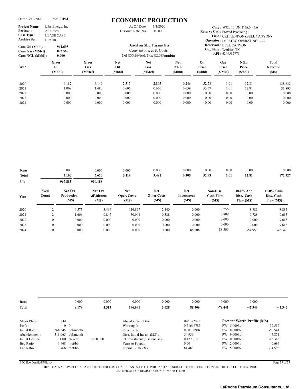 Date : 3/12/2020 2:23:03PM ECONOMIC PROJECTION Project Name : Lilis Energy, Inc. As Of Date : 1/1/2020 Case : WOLFE UNIT 5&6 - 5,6 Partner : All Cases Discount Rate (%) : 10.00 Reserve Cat. : Proved Producing Case Type : LEASE CASE Field : CRITTENDON (BELL CANYON) Archive Set : L19910 Operator : IMPETRO OPERATING LLC Reservoir : Cum Oil (Mbbl) : 962.695 Based on SEC Parameters BELL CANYON Co., State : Cum Gas (MMcf) : 892.568 Constant Prices & Costs Winkler, TX API : 4249532776 Cum NGL (Mbbl) : 0.000 Oil $55.69/bbl, Gas $2.58/mmbtu Gross Gross Net Net Net Oil Gas NGL Total Year Oil Gas Oil Gas NGL Price Price Price Revenue (Mbbl) (MMcf) (Mbbl) (MMcf) (Mbbl) ($/bbl) ($/Mcf) ($/bbl) (M$) 2020 4.182 6.140 2.513 2.805 0.246 52.78 1.01 12.81 138.632 2021 1.008 1.480 0.606 0.676 0.059 53.57 1.01 12.81 33.895 2022 0.000 0.000 0.000 0.000 0.000 0.00 0.00 0.00 0.000 2023 0.000 0.000 0.000 0.000 0.000 0.00 0.00 0.00 0.000 2024 0.000 0.000 0.000 0.000 0.000 0.00 0.00 0.00 0.000 Rem 0.000 0.000 0.000 0.000 0.000 0.00 0.00 0.00 0.000 Total 5.190 7.620 3.119 3.481 0.305 52.93 1.01 12.81 172.527 Ult 967.885 900.188 Well Net Tax Net Tax Net Net Net Non-Disc. 10.0% Ann 10.0% Cum Year Count Production AdValorem Oper. Costs Other Costs Investment Cash Flow Disc. Cash Disc. Cash (M$) (M$) (M$) (M$) (M$) (M$) Flow (M$) Flow (M$) 2020 2 6.573 3.466 116.897 2.440 0.000 9.256 8.885 8.885 2021 2 1.606 0.847 30.044 0.588 0.000 0.809 0.728 9.613 2022 0 0.000 0.000 0.000 0.000 0.000 0.000 0.000 9.613 2023 0 0.000 0.000 0.000 0.000 0.000 0.000 0.000 9.613 2024 0 0.000 0.000 0.000 0.000 88.506 -88.506 -54.959 -45.346 Rem 0.000 0.000 0.000 0.000 0.000 0.000 0.000 Total 8.179 4.313 146.941 3.028 88.506 -78.441 -45.346 -45.346 Major Phase : Oil Abandonment Date : 04/05/2021 Present Worth Profile (M$) Perfs : 0 - 0 Working Int : 0.71664785 PW 5.000% : -59.519 Initial Rate : 368.345 bbl/month Revenue Int : 0.60103904 PW 8.000% : -50.541 Abandonment : 318.065 bbl/month Disc. Initial Invest. (M$) : 54.959 PW 9.000% : -47.871 Initial Decline : 11.00 % year b = 0.000 ROInvestment (disc/undisc) : 0.17 / 0.11 PW 10.000% : -45.346 Beg Ratio : 1.468 mcf/bbl Years to Payout : 0.00 PW 12.000% : -40.694 End Ratio : 1.468 mcf/bbl Internal ROR (%) : 61.483 PW 15.000% : -34.596 LPC Eco DetailedNGL.rpt Page 35 of 35 THESE DATA ARE PART OF A LAROCHE PETROLEUM CONSULTANTS, LTD. REPORT AND ARE SUBJECT TO THE CONDITIONS IN THE TEXT OF THE REPORT. CERTIFICATE OF REGISTRATION NUMBER F-1360 LaRoche Petroleum Consultants, Ltd.