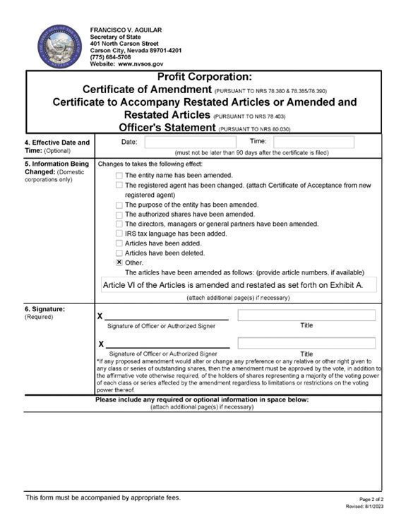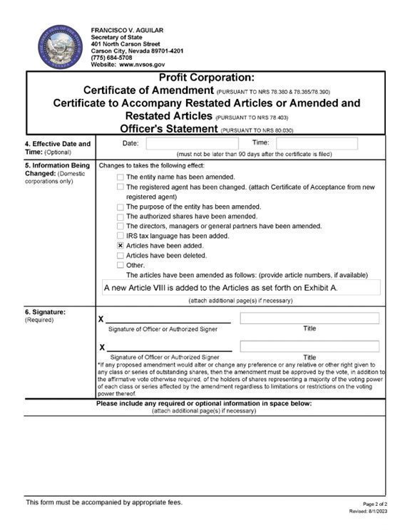 | Approval of the adoption of a Certificate of Amendment to amend the Company’s Amended and Restated Articles of Incorporation to opt out of Nevada Revised Statutes Sections 78.378 to 78.3793. |