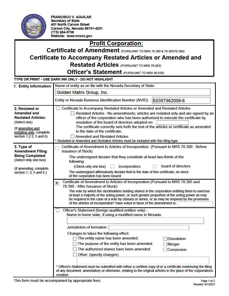 At the Special Meeting, you will be asked to approve (1) for the purposes of Nasdaq Listing Rules 5635(a) and (b), the terms of, and issuance of shares of common stock in connection with, that certain Amended and Restated Sale and Purchase Agreement of Share Capital dated June 27, 2023 (as amended by that certain First Amendment to Amended and Restated Sale and Purchase Agreement of Share Capital dated September 22, 2023, and entered into on September 27, 2023 and that certain Second Amendment to Amended and Restated Sale and Purchase Agreement of Share Capital dated and effective January 22, 2024, and as further amended from time to time, the “Purchase Agreement”) by and between the Company, as purchaser and Aleksandar Milovanović, Zoran Milošević and Snežana Božović, owners of the Meridian Companies (collectively, the “Sellers”), the shareholders of: Meridian Tech Društvo Sa Ograničenom Odgovornošću Beograd, a private limited company formed and registered in and under the laws of the Republic of Serbia, Društvo Sa Ograničenom Odgovornošću “Meridianbet” Društvo Za Proizvodnju, Promet Roba I Usluga, Export Import Podgorica, a private limited company formed and registered in and under the laws of Montenegro, Meridian Gaming Holdings Ltd., a company formed and registered in the Republic of Malta, and Meridian Gaming (Cy) Ltd, a company formed and registered in the Republic of Cyprus (collectively, the “Meridian Companies”), including the shares of Company common stock issuable upon conversion of certain shares of Series C Voting Preferred Stock issuable in connection therewith and any shares of common stock issuable in connection with the indemnification obligations set forth in the Purchase Agreement, pursuant to which the Company will acquire the Meridian Companies (the “Purchase Agreement Proposal”); (2) on a non-binding, advisory basis, the compensation that may be paid or become payable to certain of Golden Matrix’s named executive officers prior to, or after, the Purchase; (3) for the purposes of complying with the applicable listing rules of Nasdaq, to consider and vote upon a proposal to approve the issuance of more than 20% of the Company’s issued and outstanding common stock and voting stock in certain offerings after the date of the Special Meeting (the “Nasdaq Proposal”); (4) the adoption of a Certificate of Amendment to amend our Amended and Restated Articles of Incorporation to remove the provisions thereof providing for a three class, classified Board of Directors of the Company (the “Declassification Proposal”); (5) the adoption of a Certificate of Amendment to amend our Amended and Restated Articles of Incorporation to opt out of Nevada Revised Statutes Sections 78.378 to 78.3793 (the Nevada Control Share Act) (the “Control Share Act Opt Out Proposal”); (6) the adoption of a Certificate of Amendment to amend our Amended and Restated Articles of Incorporation to amend Article VI thereof to (a) remove the Board of Directors’ exclusive right to make, amend, alter, or repeal the bylaws of the Company; and (b) provide that nothing in the Amended and Restated Articles of Incorporation shall deny the concurrent power of the stockholders (together with the directors) to adopt, alter, amend, restate, or repeal the Bylaws of the Company (the “Stockholder Bylaws Amendment Proposal”); (7) the adoption of a Certificate of Amendment to our Amended and Restated Articles of Incorporation to amend Article III, Section 1, to increase the Company’s authorized number of shares of common stock from two hundred and fifty million (250,000,000) shares to three hundred million (300,000,000) shares (the “Authorized Shares Increase Proposal”); (8) the adoption of the Golden Matrix Group, Inc. 2023 Equity Incentive Plan; and (9) an adjournment of the Special Meeting, if necessary, to solicit additional proxies if there are not sufficient votes in favor of the Purchase Agreement Proposal or Nasdaq Proposal (the “Adjournment Proposal”).