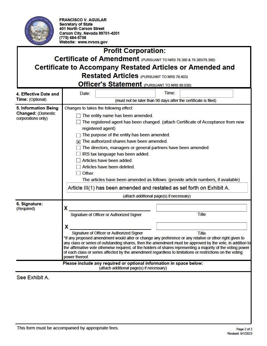7. The Authorized Shares Increase Proposal – to consider and vote upon the adoption of a Certificate of Amendment to our Amended and Restated Articles of Incorporation to amend Article III, Section 1, to increase the Company’s authorized number of shares of common stock from two hundred and fifty million (250,000,000) shares to three hundred million (300,000,000) shares (Proposal No. 7);