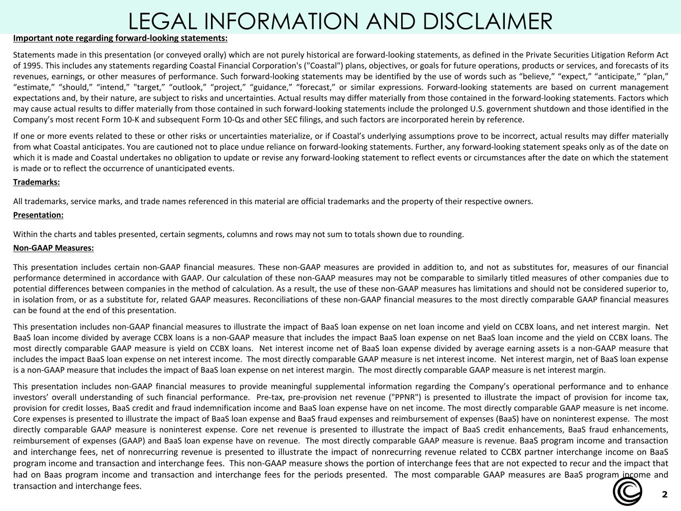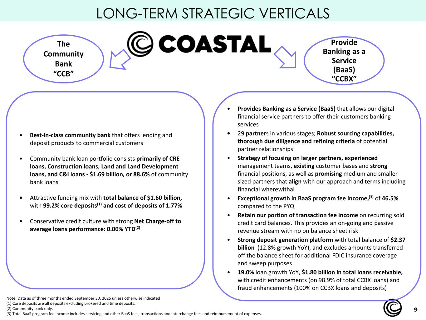 2 LEGAL INFORMATION AND DISCLAIMER Important note regarding forward-looking statements: Statements made in this presentation (or conveyed orally) which are not purely historical are forward-looking statements, as defined in the Private Securities Litigation Reform Act of 1995. This includes any statements regarding Coastal Financial Corporation's ("Coastal") plans, objectives, or goals for future operations, products or services, and forecasts of its revenues, earnings, or other measures of performance. Such forward-looking statements may be identified by the use of words such as “believe,” “expect,” “anticipate,” “plan,” “estimate,” “should,” “intend,” "target,” “outlook,” “project,” “guidance,” “forecast,” or similar expressions. Forward-looking statements are based on current management expectations and, by their nature, are subject to risks and uncertainties. Actual results may differ materially from those contained in the forward-looking statements. Factors which may cause actual results to differ materially from those contained in such forward-looking statements include the prolonged U.S. government shutdown and those identified in the Company’s most recent Form 10-K and subsequent Form 10-Qs and other SEC filings, and such factors are incorporated herein by reference. If one or more events related to these or other risks or uncertainties materialize, or if Coastal’s underlying assumptions prove to be incorrect, actual results may differ materially from what Coastal anticipates. You are cautioned not to place undue reliance on forward-looking statements. Further, any forward-looking statement speaks only as of the date on which it is made and Coastal undertakes no obligation to update or revise any forward-looking statement to reflect events or circumstances after the date on which the statement is made or to reflect the occurrence of unanticipated events. Trademarks: All trademarks, service marks, and trade names referenced in this material are official trademarks and the property of their respective owners. Presentation: Within the charts and tables presented, certain segments, columns and rows may not sum to totals shown due to rounding. Non-GAAP Measures: This presentation includes certain non-GAAP financial measures. These non-GAAP measures are provided in addition to, and not as substitutes for, measures of our financial performance determined in accordance with GAAP. Our calculation of these non-GAAP measures may not be comparable to similarly titled measures of other companies due to potential differences between companies in the method of calculation. As a result, the use of these non-GAAP measures has limitations and should not be considered superior to, in isolation from, or as a substitute for, related GAAP measures. Reconciliations of these non-GAAP financial measures to the most directly comparable GAAP financial measures can be found at the end of this presentation. This presentation includes non-GAAP financial measures to illustrate the impact of BaaS loan expense on net loan income and yield on CCBX loans, and net interest margin. Net BaaS loan income divided by average CCBX loans is a non-GAAP measure that includes the impact BaaS loan expense on net BaaS loan income and the yield on CCBX loans. The most directly comparable GAAP measure is yield on CCBX loans. Net interest income net of BaaS loan expense divided by average earning assets is a non-GAAP measure that includes the impact BaaS loan expense on net interest income. The most directly comparable GAAP measure is net interest income. Net interest margin, net of BaaS loan expense is a non-GAAP measure that includes the impact of BaaS loan expense on net interest margin. The most directly comparable GAAP measure is net interest margin. This presentation includes non-GAAP financial measures to provide meaningful supplemental information regarding the Company’s operational performance and to enhance investors’ overall understanding of such financial performance. Pre-tax, pre-provision net revenue ("PPNR") is presented to illustrate the impact of provision for income tax, provision for credit losses, BaaS credit and fraud indemnification income and BaaS loan expense have on net income. The most directly comparable GAAP measure is net income. Core expenses is presented to illustrate the impact of BaaS loan expense and BaaS fraud expenses and reimbursement of expenses (BaaS) have on noninterest expense. The most directly comparable GAAP measure is noninterest expense. Core net revenue is presented to illustrate the impact of BaaS credit enhancements, BaaS fraud enhancements, reimbursement of expenses (GAAP) and BaaS loan expense have on revenue. The most directly comparable GAAP measure is revenue. BaaS program income and transaction and interchange fees, net of nonrecurring revenue is presented to illustrate the impact of nonrecurring revenue related to CCBX partner interchange income on BaaS program income and transaction and interchange fees. This non-GAAP measure shows the portion of interchange fees that are not expected to recur and the impact that had on Baas program income and transaction and interchange fees for the periods presented. The most comparable GAAP measures are BaaS program income and transaction and interchange fees.