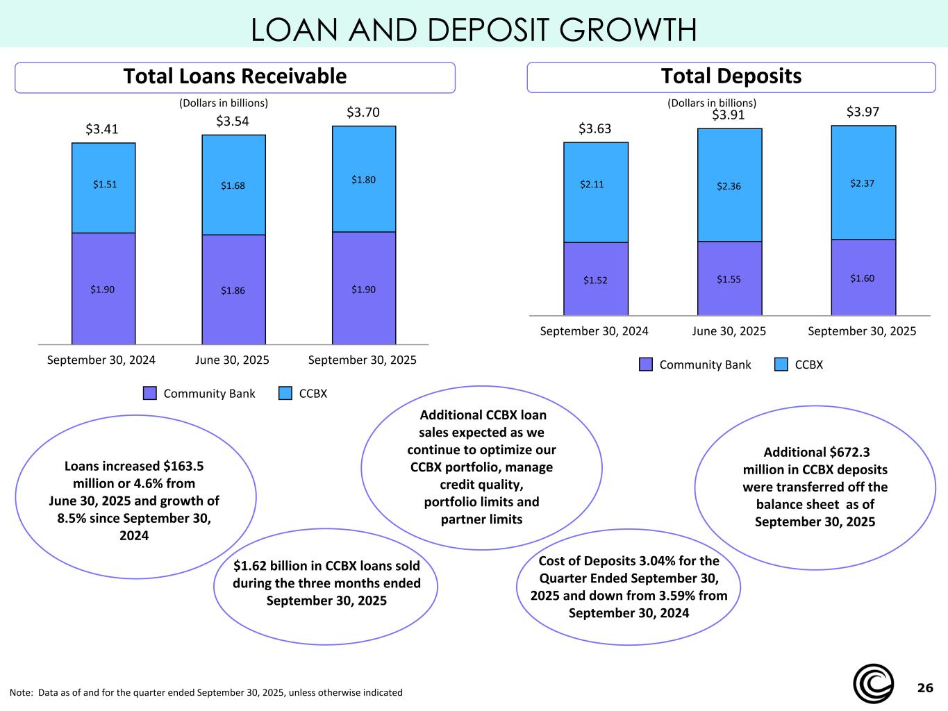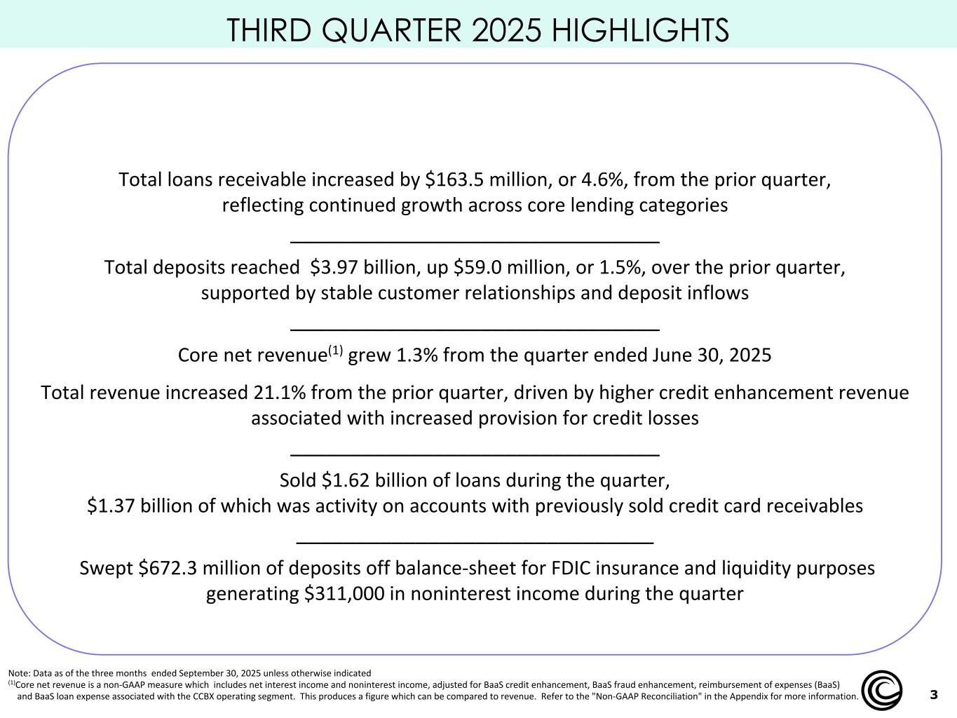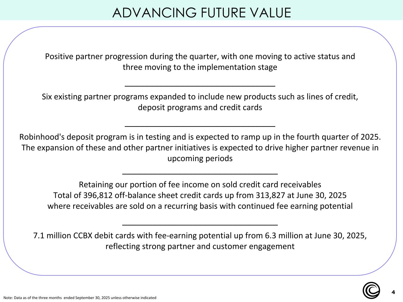 3 THIRD QUARTER 2025 HIGHLIGHTS Note: Data as of the three months ended September 30, 2025 unless otherwise indicated (1)Core net revenue is a non-GAAP measure which includes net interest income and noninterest income, adjusted for BaaS credit enhancement, BaaS fraud enhancement, reimbursement of expenses (BaaS) and BaaS loan expense associated with the CCBX operating segment. This produces a figure which can be compared to revenue. Refer to the "Non-GAAP Reconciliation" in the Appendix for more information. Total loans receivable increased by $163.5 million, or 4.6%, from the prior quarter, reflecting continued growth across core lending categories _______________________________ Total deposits reached $3.97 billion, up $59.0 million, or 1.5%, over the prior quarter, supported by stable customer relationships and deposit inflows _______________________________ Core net revenue(1) grew 1.3% from the quarter ended June 30, 2025 Total revenue increased 21.1% from the prior quarter, driven by higher credit enhancement revenue associated with increased provision for credit losses _______________________________ Sold $1.62 billion of loans during the quarter, $1.37 billion of which was activity on accounts with previously sold credit card receivables ______________________________ Swept $672.3 million of deposits off balance-sheet for FDIC insurance and liquidity purposes generating $311,000 in noninterest income during the quarter