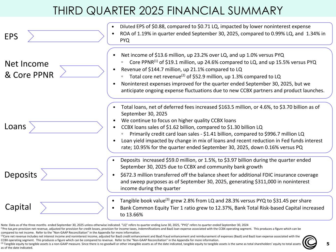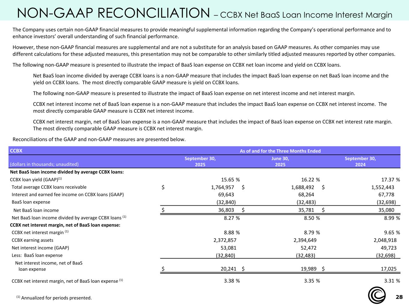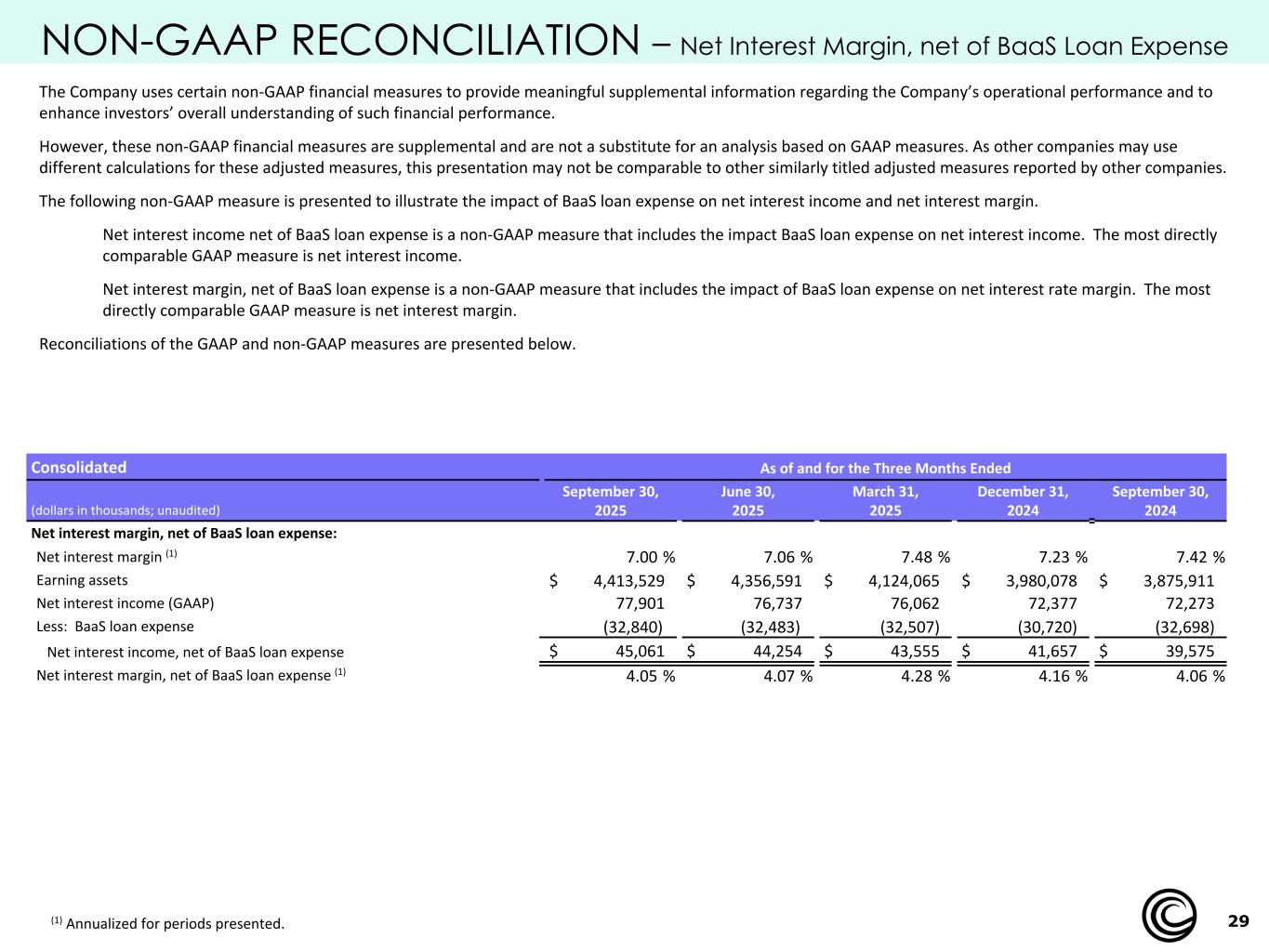 28 NON-GAAP RECONCILIATION – CCBX Net BaaS Loan Income Interest Margin The Company uses certain non-GAAP financial measures to provide meaningful supplemental information regarding the Company’s operational performance and to enhance investors’ overall understanding of such financial performance. However, these non-GAAP financial measures are supplemental and are not a substitute for an analysis based on GAAP measures. As other companies may use different calculations for these adjusted measures, this presentation may not be comparable to other similarly titled adjusted measures reported by other companies. The following non-GAAP measure is presented to illustrate the impact of BaaS loan expense on CCBX net loan income and yield on CCBX loans. Net BaaS loan income divided by average CCBX loans is a non-GAAP measure that includes the impact BaaS loan expense on net BaaS loan income and the yield on CCBX loans. The most directly comparable GAAP measure is yield on CCBX loans. The following non-GAAP measure is presented to illustrate the impact of BaaS loan expense on net interest income and net interest margin. CCBX net interest income net of BaaS loan expense is a non-GAAP measure that includes the impact BaaS loan expense on CCBX net interest income. The most directly comparable GAAP measure is CCBX net interest income. CCBX net interest margin, net of BaaS loan expense is a non-GAAP measure that includes the impact of BaaS loan expense on CCBX net interest rate margin. The most directly comparable GAAP measure is CCBX net interest margin. Reconciliations of the GAAP and non-GAAP measures are presented below. CCBX As of and for the Three Months Ended (dollars in thousands; unaudited) September 30, 2025 June 30, 2025 September 30, 2024 Net BaaS loan income divided by average CCBX loans: CCBX loan yield (GAAP)(1) 15.65 % 16.22 % 17.37 % Total average CCBX loans receivable $ 1,764,957 $ 1,688,492 $ 1,552,443 Interest and earned fee income on CCBX loans (GAAP) 69,643 68,264 67,778 BaaS loan expense (32,840) (32,483) (32,698) Net BaaS loan income $ 36,803 $ 35,781 $ 35,080 Net BaaS loan income divided by average CCBX loans (1) 8.27 % 8.50 % 8.99 % CCBX net interest margin, net of BaaS loan expense: CCBX net interest margin (1) 8.88 % 8.79 % 9.65 % CCBX earning assets 2,372,857 2,394,649 2,048,918 Net interest income (GAAP) 53,081 52,472 49,723 Less: BaaS loan expense (32,840) (32,483) (32,698) Net interest income, net of BaaS loan expense $ 20,241 $ 19,989 $ 17,025 CCBX net interest margin, net of BaaS loan expense (1) 3.38 % 3.35 % 3.31 % (1) Annualized for periods presented.
