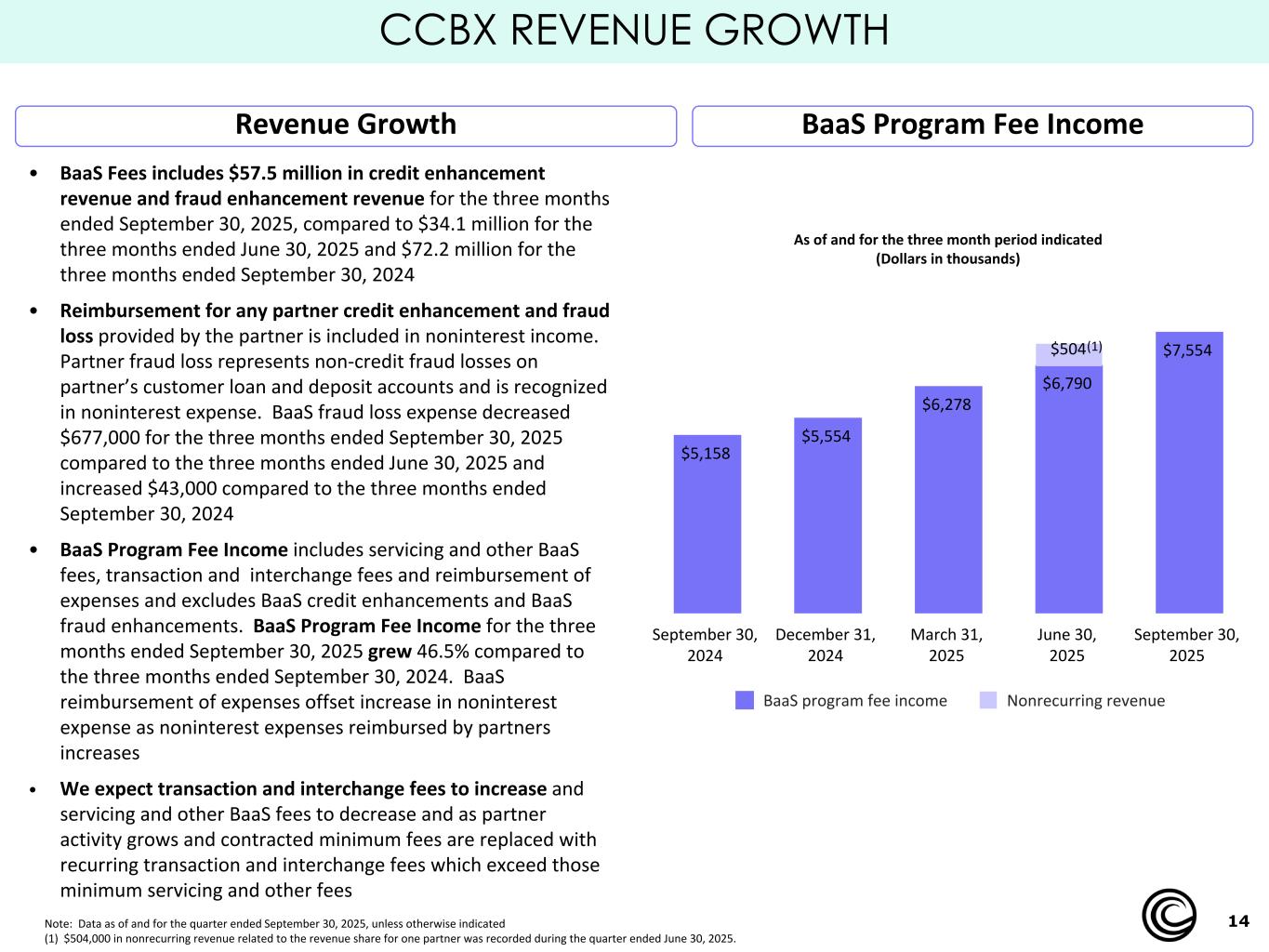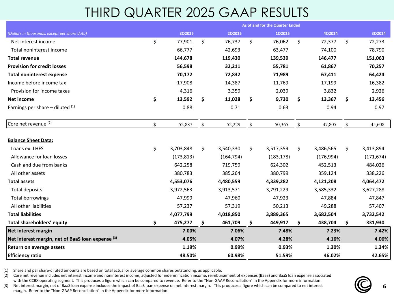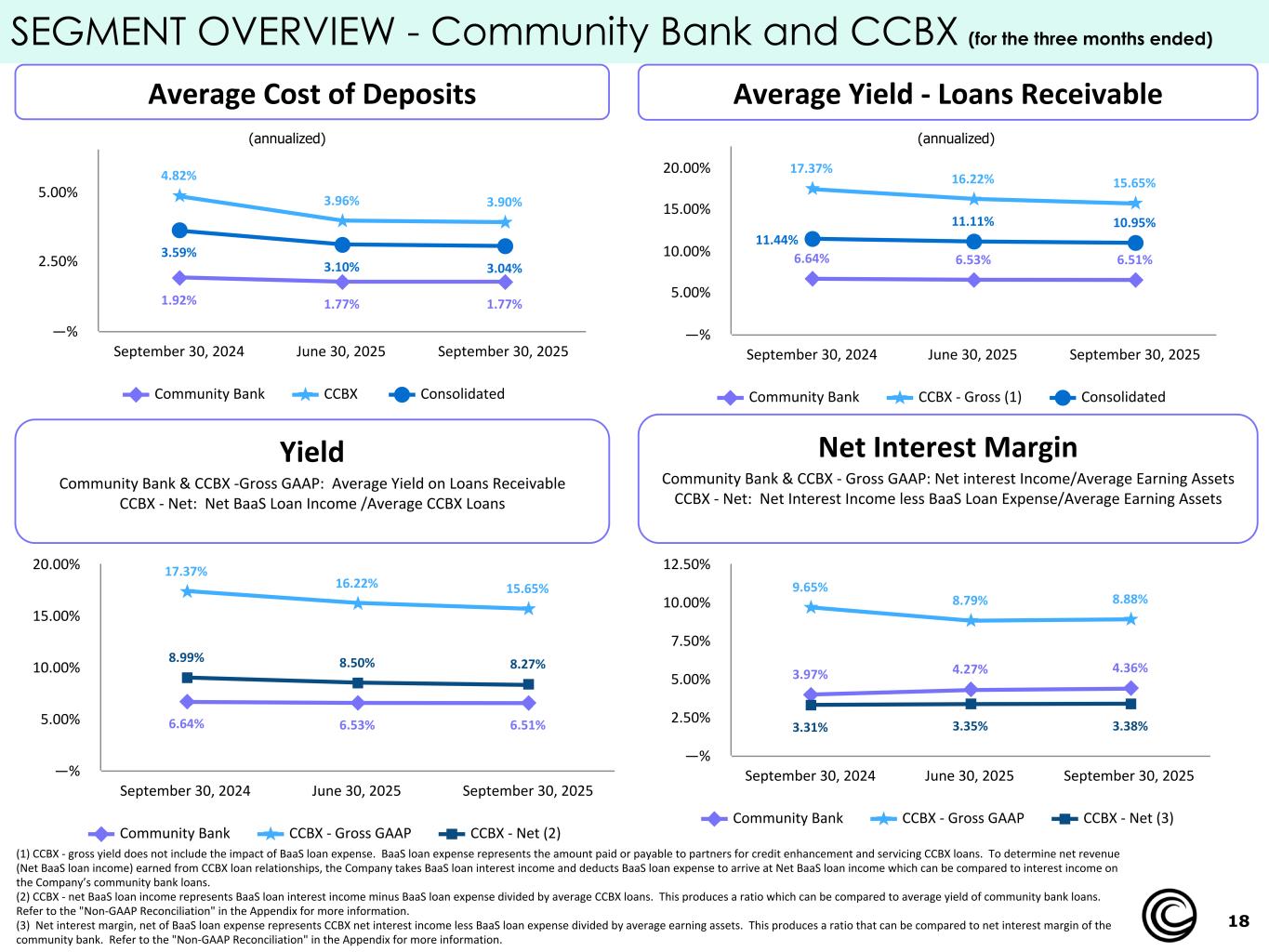 28 NON-GAAP RECONCILIATION – CCBX Net BaaS Loan Income Interest Margin The Company uses certain non-GAAP financial measures to provide meaningful supplemental information regarding the Company’s operational performance and to enhance investors’ overall understanding of such financial performance. However, these non-GAAP financial measures are supplemental and are not a substitute for an analysis based on GAAP measures. As other companies may use different calculations for these adjusted measures, this presentation may not be comparable to other similarly titled adjusted measures reported by other companies. The following non-GAAP measure is presented to illustrate the impact of BaaS loan expense on CCBX net loan income and yield on CCBX loans. Net BaaS loan income divided by average CCBX loans is a non-GAAP measure that includes the impact BaaS loan expense on net BaaS loan income and the yield on CCBX loans. The most directly comparable GAAP measure is yield on CCBX loans. The following non-GAAP measure is presented to illustrate the impact of BaaS loan expense on net interest income and net interest margin. CCBX net interest income net of BaaS loan expense is a non-GAAP measure that includes the impact BaaS loan expense on CCBX net interest income. The most directly comparable GAAP measure is CCBX net interest income. CCBX net interest margin, net of BaaS loan expense is a non-GAAP measure that includes the impact of BaaS loan expense on CCBX net interest rate margin. The most directly comparable GAAP measure is CCBX net interest margin. Reconciliations of the GAAP and non-GAAP measures are presented below. CCBX As of and for the Three Months Ended (dollars in thousands; unaudited) September 30, 2025 June 30, 2025 September 30, 2024 Net BaaS loan income divided by average CCBX loans: CCBX loan yield (GAAP)(1) 15.65 % 16.22 % 17.37 % Total average CCBX loans receivable $ 1,764,957 $ 1,688,492 $ 1,552,443 Interest and earned fee income on CCBX loans (GAAP) 69,643 68,264 67,778 BaaS loan expense (32,840) (32,483) (32,698) Net BaaS loan income $ 36,803 $ 35,781 $ 35,080 Net BaaS loan income divided by average CCBX loans (1) 8.27 % 8.50 % 8.99 % CCBX net interest margin, net of BaaS loan expense: CCBX net interest margin (1) 8.88 % 8.79 % 9.65 % CCBX earning assets 2,372,857 2,394,649 2,048,918 Net interest income (GAAP) 53,081 52,472 49,723 Less: BaaS loan expense (32,840) (32,483) (32,698) Net interest income, net of BaaS loan expense $ 20,241 $ 19,989 $ 17,025 CCBX net interest margin, net of BaaS loan expense (1) 3.38 % 3.35 % 3.31 % (1) Annualized for periods presented.