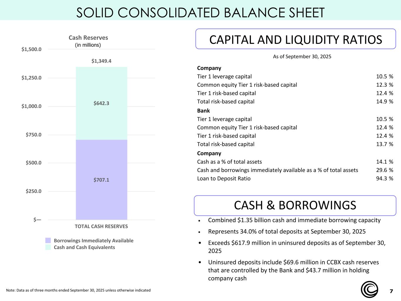 6 THIRD QUARTER 2025 GAAP RESULTS (1) Share and per share-diluted amounts are based on total actual or average common shares outstanding, as applicable. (2) Core net revenue includes net interest income and noninterest income, adjusted for indemnification income, reimbursement of expenses (BaaS) and BaaS loan expense associated with the CCBX operating segment. This produces a figure which can be compared to revenue. Refer to the "Non-GAAP Reconciliation" in the Appendix for more information. (3) Net interest margin, net of BaaS loan expense includes the impact of BaaS loan expense on net interest margin. This produces a figure which can be compared to net interest margin. Refer to the "Non-GAAP Reconciliation" in the Appendix for more information. As of and for the Quarter Ended (Dollars in thousands, except per share data) 3Q2025 2Q2025 1Q2025 4Q2024 3Q2024 Net interest income $ 77,901 $ 76,737 $ 76,062 $ 72,377 $ 72,273 Total noninterest income 66,777 42,693 63,477 74,100 78,790 Total revenue 144,678 119,430 139,539 146,477 151,063 Provision for credit losses 56,598 32,211 55,781 61,867 70,257 Total noninterest expense 70,172 72,832 71,989 67,411 64,424 Income before income tax 17,908 14,387 11,769 17,199 16,382 Provision for income taxes 4,316 3,359 2,039 3,832 2,926 Net income $ 13,592 $ 11,028 $ 9,730 $ 13,367 $ 13,456 Earnings per share – diluted (1) 0.88 0.71 0.63 0.94 0.97 Core net revenue (2) $ 52,887 $ 52,229 $ 50,365 $ 47,805 $ 45,608 $ 45,608 Balance Sheet Data: Loans ex. LHFS $ 3,703,848 $ 3,540,330 $ 3,517,359 $ 3,486,565 $ 3,413,894 Allowance for loan losses (173,813) (164,794) (183,178) (176,994) (171,674) Cash and due from banks 642,258 719,759 624,302 452,513 484,026 All other assets 380,783 385,264 380,799 359,124 338,226 Total assets 4,553,076 4,480,559 4,339,282 4,121,208 4,064,472 Total deposits 3,972,563 3,913,571 3,791,229 3,585,332 3,627,288 Total borrowings 47,999 47,960 47,923 47,884 47,847 All other liabilities 57,237 57,319 50,213 49,288 57,407 Total liabilities 4,077,799 4,018,850 3,889,365 3,682,504 3,732,542 Total shareholders’ equity $ 475,277 $ 461,709 $ 449,917 $ 438,704 $ 331,930 Net interest margin 7.00% 7.06% 7.48% 7.23% 7.42% Net interest margin, net of BaaS loan expense (3) 4.05% 4.07% 4.28% 4.16% 4.06% Return on average assets 1.19% 0.99% 0.93% 1.30% 1.34% Efficiency ratio 48.50% 60.98% 51.59% 46.02% 42.65%