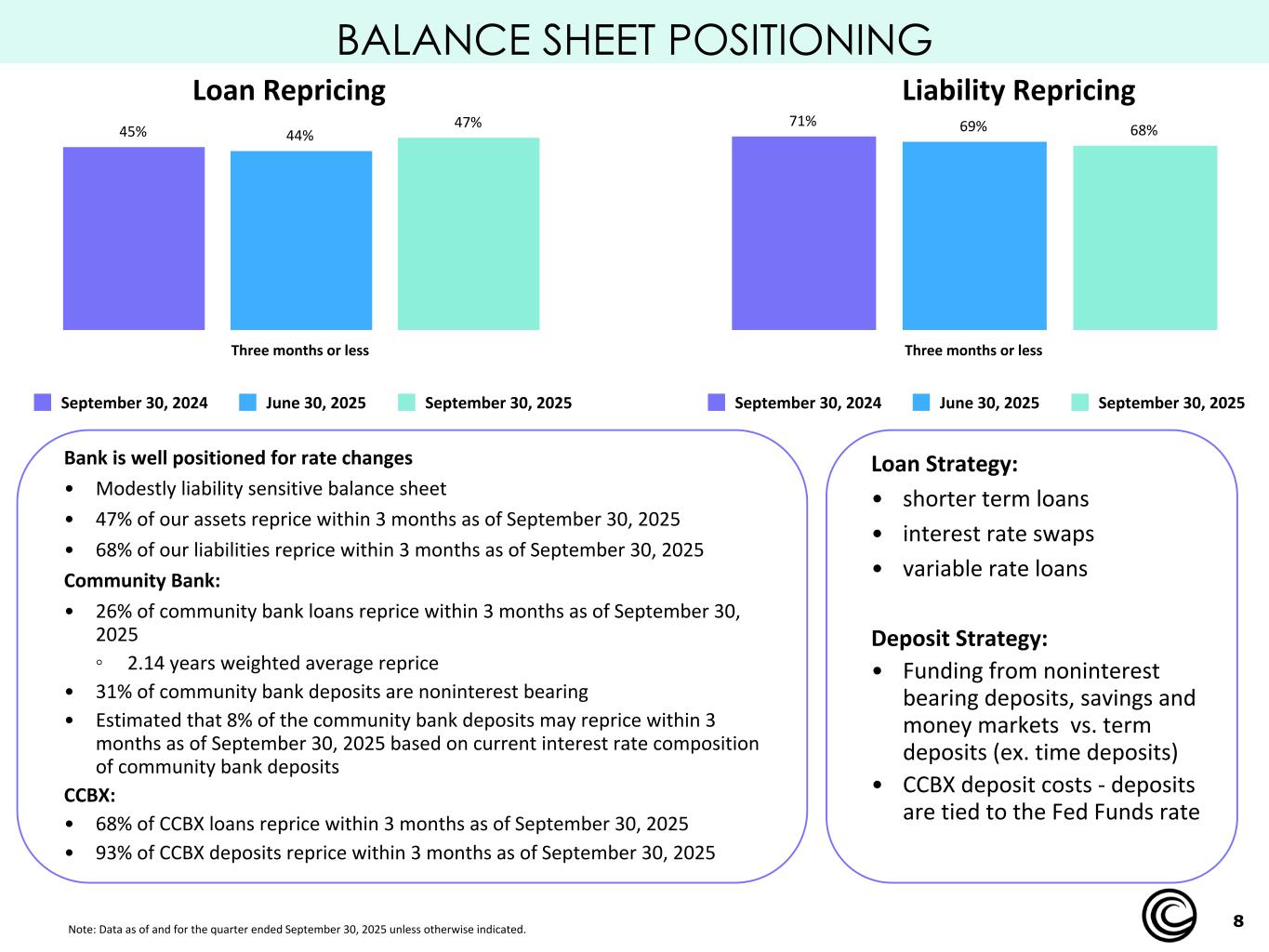 7 SOLID CONSOLIDATED BALANCE SHEET CAPITAL AND LIQUIDITY RATIOS Note: Data as of three months ended September 30, 2025 unless otherwise indicated (in millions) CASH & BORROWINGS • Combined $1.35 billion cash and immediate borrowing capacity • Represents 34.0% of total deposits at September 30, 2025 • Exceeds $617.9 million in uninsured deposits as of September 30, 2025 • Uninsured deposits include $69.6 million in CCBX cash reserves that are controlled by the Bank and $43.7 million in holding company cash Company Tier 1 leverage capital 10.5 % Common equity Tier 1 risk-based capital 12.3 % Tier 1 risk-based capital 12.4 % Total risk-based capital 14.9 % Bank Tier 1 leverage capital 10.5 % Common equity Tier 1 risk-based capital 12.4 % Tier 1 risk-based capital 12.4 % Total risk-based capital 13.7 % Company Cash as a % of total assets 14.1 % Cash and borrowings immediately available as a % of total assets 29.6 % Loan to Deposit Ratio 94.3 % As of September 30, 2025 Cash Reserves $1,349.4 $707.1 $642.3 Borrowings Immediately Available Cash and Cash Equivalents TOTAL CASH RESERVES $— $250.0 $500.0 $750.0 $1,000.0 $1,250.0 $1,500.0