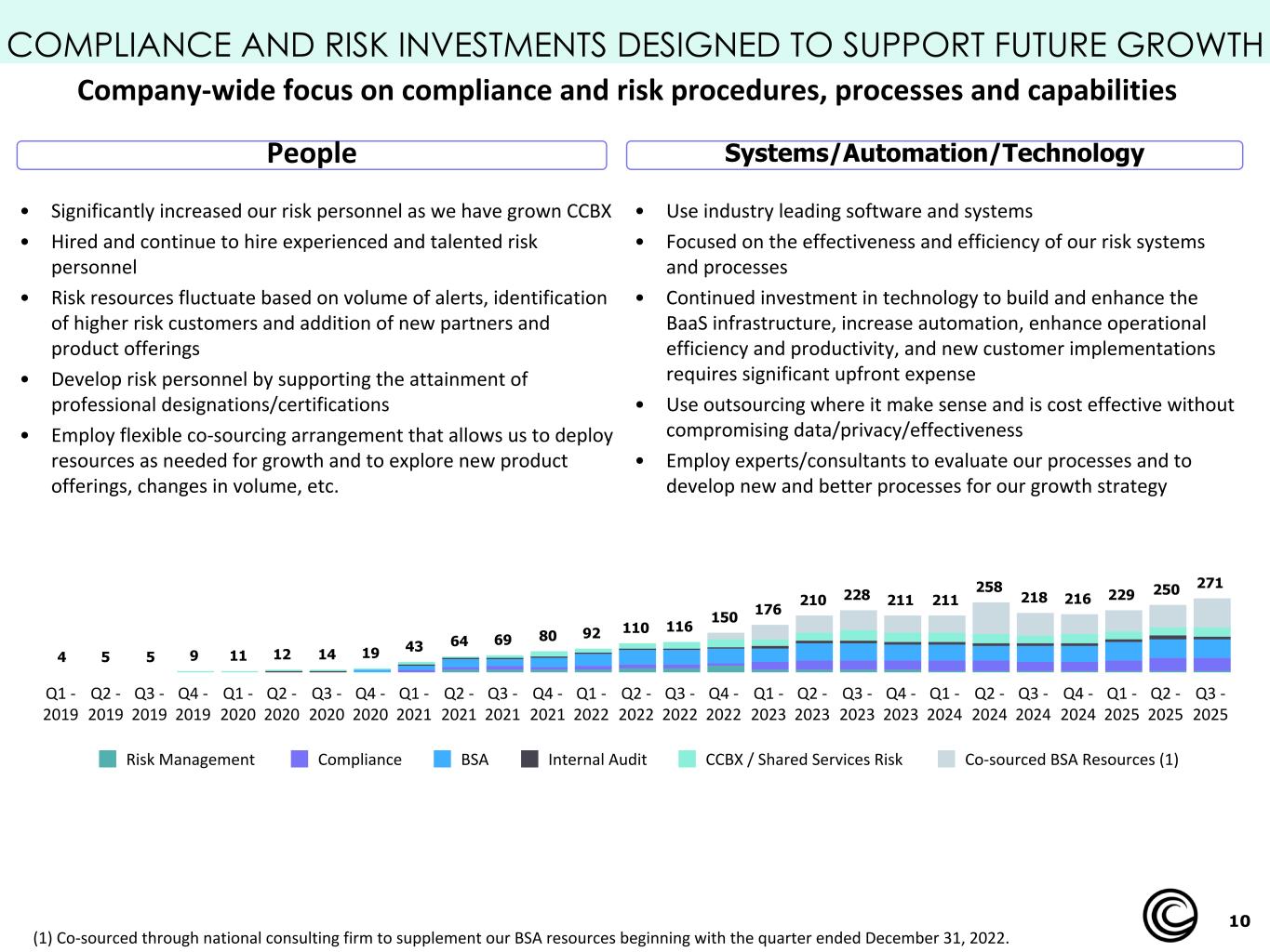 10 COMPLIANCE AND RISK INVESTMENTS DESIGNED TO SUPPORT FUTURE GROWTH 4 5 5 9 11 12 14 19 43 64 69 80 92 110 116 150 176 210 228 211 211 258 218 216 229 250 271 Risk Management Compliance BSA Internal Audit CCBX / Shared Services Risk Co-sourced BSA Resources (1) Q1 - 2019 Q2 - 2019 Q3 - 2019 Q4 - 2019 Q1 - 2020 Q2 - 2020 Q3 - 2020 Q4 - 2020 Q1 - 2021 Q2 - 2021 Q3 - 2021 Q4 - 2021 Q1 - 2022 Q2 - 2022 Q3 - 2022 Q4 - 2022 Q1 - 2023 Q2 - 2023 Q3 - 2023 Q4 - 2023 Q1 - 2024 Q2 - 2024 Q3 - 2024 Q4 - 2024 Q1 - 2025 Q2 - 2025 Q3 - 2025 People Systems/Automation/Technology • Significantly increased our risk personnel as we have grown CCBX • Hired and continue to hire experienced and talented risk personnel • Risk resources fluctuate based on volume of alerts, identification of higher risk customers and addition of new partners and product offerings • Develop risk personnel by supporting the attainment of professional designations/certifications • Employ flexible co-sourcing arrangement that allows us to deploy resources as needed for growth and to explore new product offerings, changes in volume, etc. • Use industry leading software and systems • Focused on the effectiveness and efficiency of our risk systems and processes • Continued investment in technology to build and enhance the BaaS infrastructure, increase automation, enhance operational efficiency and productivity, and new customer implementations requires significant upfront expense • Use outsourcing where it make sense and is cost effective without compromising data/privacy/effectiveness • Employ experts/consultants to evaluate our processes and to develop new and better processes for our growth strategy (1) Co-sourced through national consulting firm to supplement our BSA resources beginning with the quarter ended December 31, 2022. Company-wide focus on compliance and risk procedures, processes and capabilities