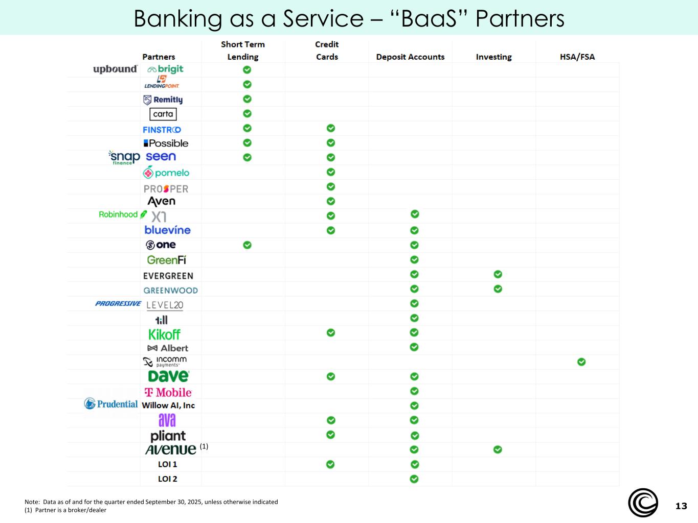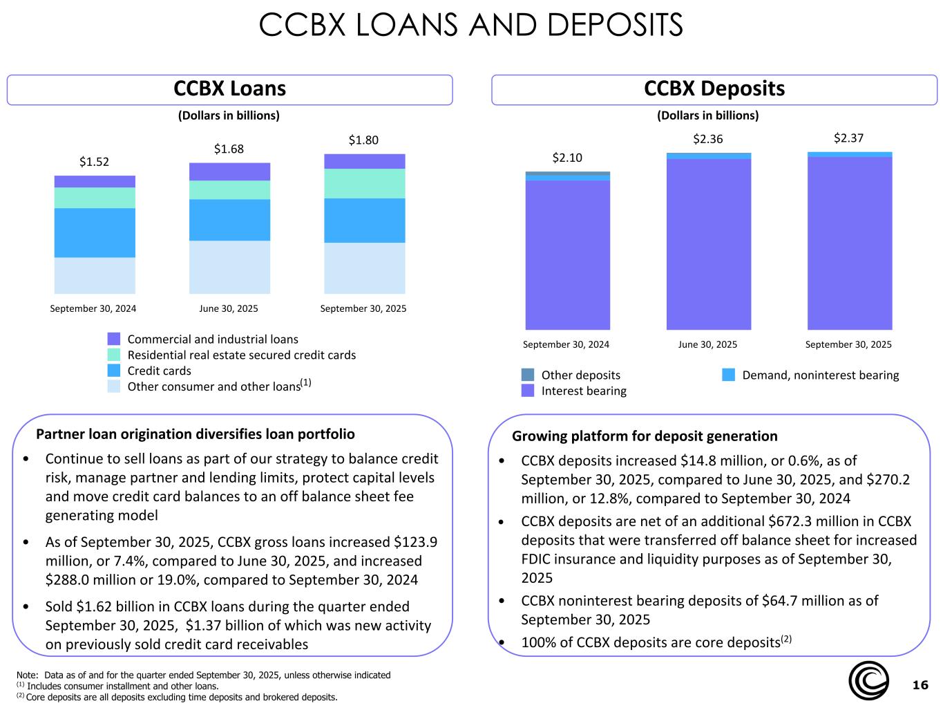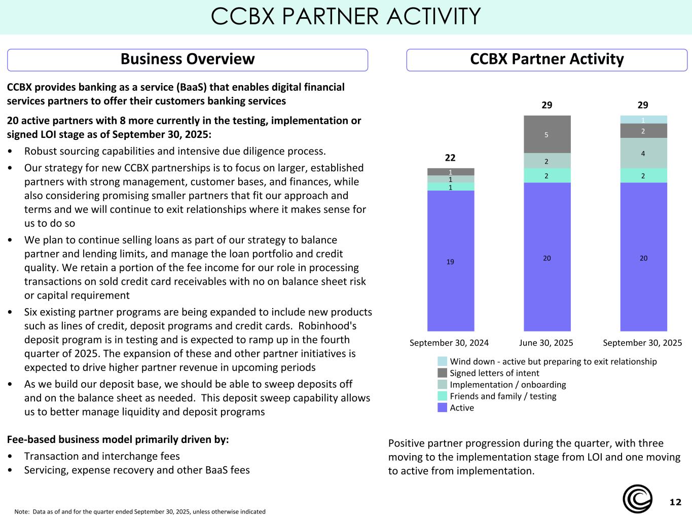 12 22 29 29 19 20 20 1 2 21 2 4 1 5 2 1 Wind down - active but preparing to exit relationship Signed letters of intent Implementation / onboarding Friends and family / testing Active September 30, 2024 June 30, 2025 September 30, 2025 CCBX provides banking as a service (BaaS) that enables digital financial services partners to offer their customers banking services 20 active partners with 8 more currently in the testing, implementation or signed LOI stage as of September 30, 2025: • Robust sourcing capabilities and intensive due diligence process. • Our strategy for new CCBX partnerships is to focus on larger, established partners with strong management, customer bases, and finances, while also considering promising smaller partners that fit our approach and terms and we will continue to exit relationships where it makes sense for us to do so • We plan to continue selling loans as part of our strategy to balance partner and lending limits, and manage the loan portfolio and credit quality. We retain a portion of the fee income for our role in processing transactions on sold credit card receivables with no on balance sheet risk or capital requirement • Six existing partner programs are being expanded to include new products such as lines of credit, deposit programs and credit cards. Robinhood's deposit program is in testing and is expected to ramp up in the fourth quarter of 2025. The expansion of these and other partner initiatives is expected to drive higher partner revenue in upcoming periods • As we build our deposit base, we should be able to sweep deposits off and on the balance sheet as needed. This deposit sweep capability allows us to better manage liquidity and deposit programs Fee-based business model primarily driven by: • Transaction and interchange fees • Servicing, expense recovery and other BaaS fees CCBX Partner Activity Note: Data as of and for the quarter ended September 30, 2025, unless otherwise indicated Business Overview CCBX PARTNER ACTIVITY Positive partner progression during the quarter, with three moving to the implementation stage from LOI and one moving to active from implementation.