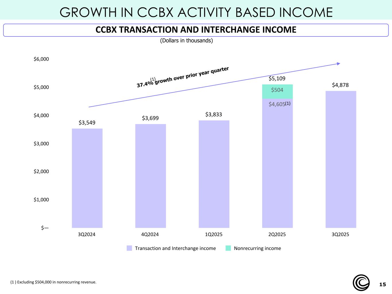 14 CCBX REVENUE GROWTH As of and for the three month period indicated (Dollars in thousands) $5,158 $5,554 $6,278 $6,790 $7,554$504 BaaS program fee income Nonrecurring revenue September 30, 2024 December 31, 2024 March 31, 2025 June 30, 2025 September 30, 2025 BaaS Program Fee Income Note: Data as of and for the quarter ended September 30, 2025, unless otherwise indicated (1) $504,000 in nonrecurring revenue related to the revenue share for one partner was recorded during the quarter ended June 30, 2025. Revenue Growth • BaaS Fees includes $57.5 million in credit enhancement revenue and fraud enhancement revenue for the three months ended September 30, 2025, compared to $34.1 million for the three months ended June 30, 2025 and $72.2 million for the three months ended September 30, 2024 • Reimbursement for any partner credit enhancement and fraud loss provided by the partner is included in noninterest income. Partner fraud loss represents non-credit fraud losses on partner’s customer loan and deposit accounts and is recognized in noninterest expense. BaaS fraud loss expense decreased $677,000 for the three months ended September 30, 2025 compared to the three months ended June 30, 2025 and increased $43,000 compared to the three months ended September 30, 2024 • BaaS Program Fee Income includes servicing and other BaaS fees, transaction and interchange fees and reimbursement of expenses and excludes BaaS credit enhancements and BaaS fraud enhancements. BaaS Program Fee Income for the three months ended September 30, 2025 grew 46.5% compared to the three months ended September 30, 2024. BaaS reimbursement of expenses offset increase in noninterest expense as noninterest expenses reimbursed by partners increases • We expect transaction and interchange fees to increase and servicing and other BaaS fees to decrease and as partner activity grows and contracted minimum fees are replaced with recurring transaction and interchange fees which exceed those minimum servicing and other fees (1)