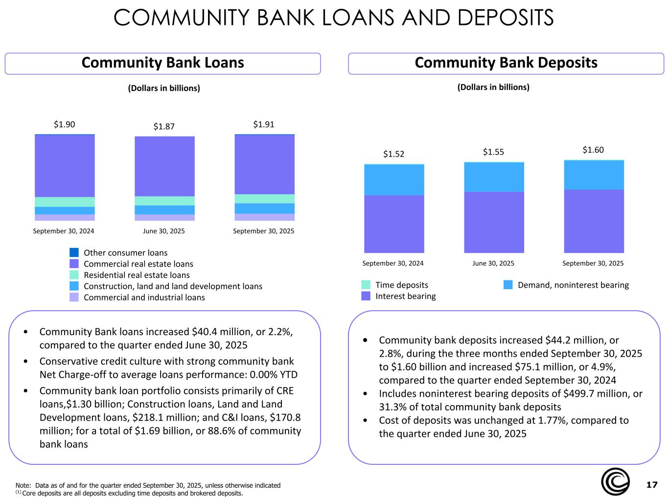 16 CCBX LOANS AND DEPOSITS (Dollars in billions) $2.10 $2.36 $2.37 Other deposits Demand, noninterest bearing Interest bearing September 30, 2024 June 30, 2025 September 30, 2025 (Dollars in billions) $1.52 $1.68 $1.80 Commercial and industrial loans Residential real estate secured credit cards Credit cards Other consumer and other loans September 30, 2024 June 30, 2025 September 30, 2025 Growing platform for deposit generation • CCBX deposits increased $14.8 million, or 0.6%, as of September 30, 2025, compared to June 30, 2025, and $270.2 million, or 12.8%, compared to September 30, 2024 • CCBX deposits are net of an additional $672.3 million in CCBX deposits that were transferred off balance sheet for increased FDIC insurance and liquidity purposes as of September 30, 2025 • CCBX noninterest bearing deposits of $64.7 million as of September 30, 2025 • 100% of CCBX deposits are core deposits(2) Partner loan origination diversifies loan portfolio • Continue to sell loans as part of our strategy to balance credit risk, manage partner and lending limits, protect capital levels and move credit card balances to an off balance sheet fee generating model • As of September 30, 2025, CCBX gross loans increased $123.9 million, or 7.4%, compared to June 30, 2025, and increased $288.0 million or 19.0%, compared to September 30, 2024 • Sold $1.62 billion in CCBX loans during the quarter ended September 30, 2025, $1.37 billion of which was new activity on previously sold credit card receivables CCBX Loans CCBX Deposits Note: Data as of and for the quarter ended September 30, 2025, unless otherwise indicated (1) Includes consumer installment and other loans. (2) Core deposits are all deposits excluding time deposits and brokered deposits. (1)