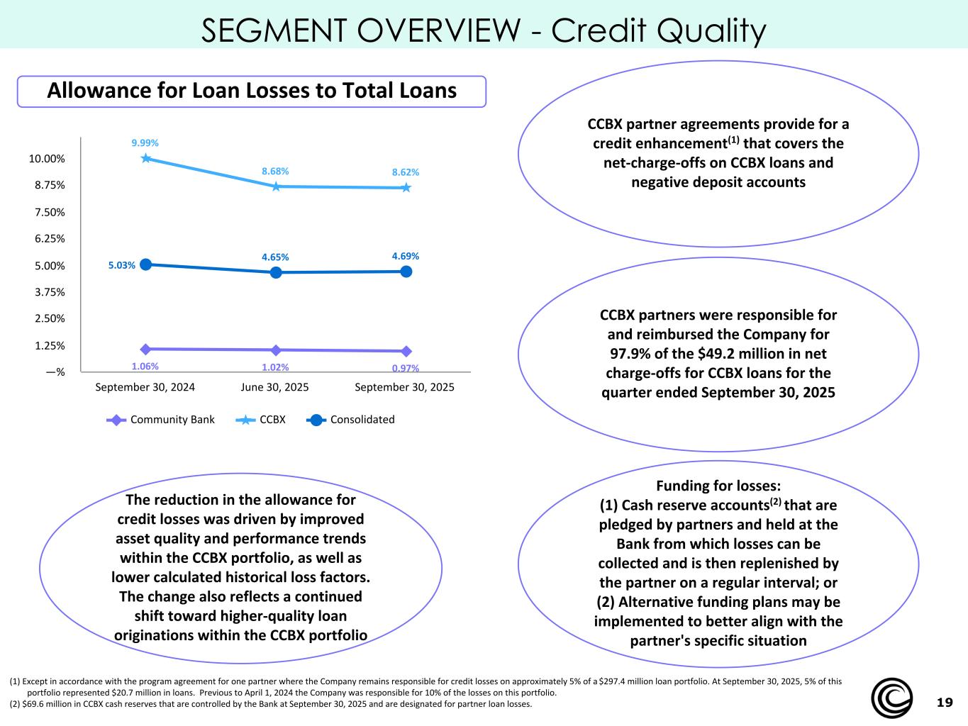 18 SEGMENT OVERVIEW - Community Bank and CCBX (for the three months ended) 1.92% 1.77% 1.77% 4.82% 3.96% 3.90% 3.59% 3.10% 3.04% Community Bank CCBX Consolidated September 30, 2024 June 30, 2025 September 30, 2025 —% 2.50% 5.00% Average Cost of Deposits (annualized) 6.64% 6.53% 6.51% 17.37% 16.22% 15.65% 11.44% 11.11% 10.95% Community Bank CCBX - Gross (1) Consolidated September 30, 2024 June 30, 2025 September 30, 2025 —% 5.00% 10.00% 15.00% 20.00% Average Yield - Loans Receivable (annualized) Yield Community Bank & CCBX -Gross GAAP: Average Yield on Loans Receivable CCBX - Net: Net BaaS Loan Income /Average CCBX Loans 6.64% 6.53% 6.51% 17.37% 16.22% 15.65% 8.99% 8.50% 8.27% Community Bank CCBX - Gross GAAP CCBX - Net (2) September 30, 2024 June 30, 2025 September 30, 2025 —% 5.00% 10.00% 15.00% 20.00% 3.97% 4.27% 4.36% 9.65% 8.79% 8.88% 3.31% 3.35% 3.38% Community Bank CCBX - Gross GAAP CCBX - Net (3) September 30, 2024 June 30, 2025 September 30, 2025 —% 2.50% 5.00% 7.50% 10.00% 12.50% Net Interest Margin Community Bank & CCBX - Gross GAAP: Net interest Income/Average Earning Assets CCBX - Net: Net Interest Income less BaaS Loan Expense/Average Earning Assets (1) CCBX - gross yield does not include the impact of BaaS loan expense. BaaS loan expense represents the amount paid or payable to partners for credit enhancement and servicing CCBX loans. To determine net revenue (Net BaaS loan income) earned from CCBX loan relationships, the Company takes BaaS loan interest income and deducts BaaS loan expense to arrive at Net BaaS loan income which can be compared to interest income on the Company’s community bank loans. (2) CCBX - net BaaS loan income represents BaaS loan interest income minus BaaS loan expense divided by average CCBX loans. This produces a ratio which can be compared to average yield of community bank loans. Refer to the "Non-GAAP Reconciliation" in the Appendix for more information. (3) Net interest margin, net of BaaS loan expense represents CCBX net interest income less BaaS loan expense divided by average earning assets. This produces a ratio that can be compared to net interest margin of the community bank. Refer to the "Non-GAAP Reconciliation" in the Appendix for more information.