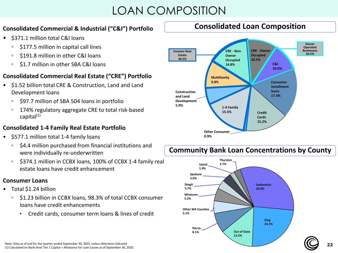 21 • Established in 1997 with a focus on serving small to medium- sized businesses within the Puget Sound region • Offers traditional lending and deposit products to commercial and retail customers as well as treasury management, remote deposit capture and credit processing • Largest bank by deposit market share in Snohomish County(1) Accolades and Recognitions Stanwood & Camano News “Best Bank” 2013 - 2024 COASTAL COMMUNITY BANK OVERVIEW Note: Data as of September 30, 2025 unless otherwise indicated (1) FDIC Summary of Deposits June 30, 2025. Raymond James “Community Bankers Cup Award” 2019-2024 Piper Sandler "Bank and Thrift Sm-All Stars" 2019 -2023 Dedication to Community Banking CCB's Branch Footprint "Corporate Citizenship" Puget Sound Business Journal 2022-2023 Everett Herald Readers Choice 2024 - “Best Bank" "Best Place to Work" "3rd Place Mortgage" 2023 - “Best Bank" "Best Mortgage" "Best Place to Work" Institution name Market Share Coastal Community Bank 19.11 % Bank of America, National Association 16.24 % JP Morgan Chase Bank, National Association 15.85 % Wells Fargo, National Association 9.12 % US Bank, National Association 8.35 % Hovde Group “Hovde's High Performers” 2022 - 2024 Notable Employers "Corporate Philanthropist" Puget Sound Business Journal 2023-2025 "Fastest Growing Mid-Market Company in the Northwest" Puget Sound Business Journal 2023 Mount Vernon Everett Seattle 14 retail banking locations • 12 in Snohomish County • 1 in Island County • 1 in King County 1 loan production office • King County KBW Bank Honor Roll Award 2024 Newsweek "America's Greatest Companies" 2025 Seattle Times "Best Bank" 2025 Time "America's Growth Leaders of 2026"