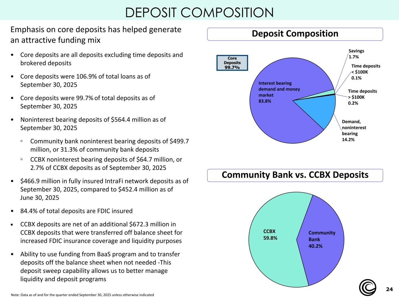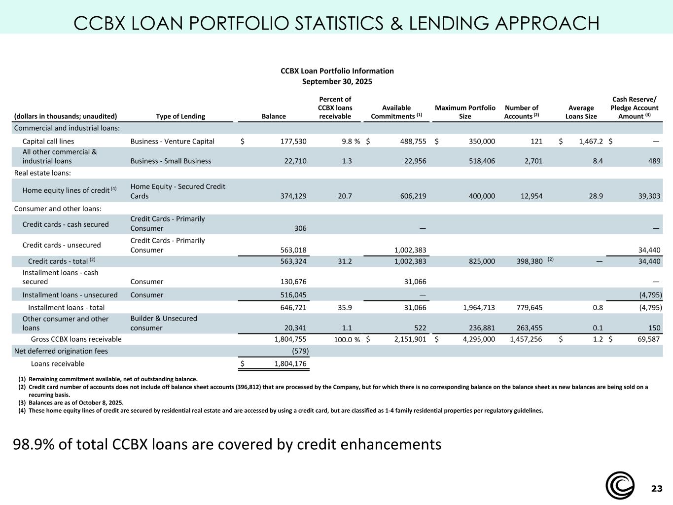 23 CCBX LOAN PORTFOLIO STATISTICS & LENDING APPROACH CCBX Loan Portfolio Information September 30, 2025 (dollars in thousands; unaudited) Type of Lending Balance Percent of CCBX loans receivable Available Commitments (1) Maximum Portfolio Size Number of Accounts (2) Average Loans Size Cash Reserve/ Pledge Account Amount (3) Commercial and industrial loans: Capital call lines Business - Venture Capital $ 177,530 9.8 % $ 488,755 $ 350,000 121 $ 1,467.2 $ — All other commercial & industrial loans Business - Small Business 22,710 1.3 22,956 518,406 2,701 8.4 489 Real estate loans: Home equity lines of credit (4) Home Equity - Secured Credit Cards 374,129 20.7 606,219 400,000 12,954 28.9 39,303 Consumer and other loans: Credit cards - cash secured Credit Cards - Primarily Consumer 306 — — Credit cards - unsecured Credit Cards - Primarily Consumer 563,018 1,002,383 34,440 Credit cards - total (2) 563,324 31.2 1,002,383 825,000 398,380 (2) — 34,440 Installment loans - cash secured Consumer 130,676 31,066 — Installment loans - unsecured Consumer 516,045 — (4,795) Installment loans - total 646,721 35.9 31,066 1,964,713 779,645 0.8 (4,795) Other consumer and other loans Builder & Unsecured consumer 20,341 1.1 522 236,881 263,455 0.1 150 Gross CCBX loans receivable 1,804,755 100.0 % $ 2,151,901 $ 4,295,000 1,457,256 $ 1.2 $ 69,587 Net deferred origination fees (579) Loans receivable $ 1,804,176 (1) Remaining commitment available, net of outstanding balance. (2) Credit card number of accounts does not include off balance sheet accounts (396,812) that are processed by the Company, but for which there is no corresponding balance on the balance sheet as new balances are being sold on a recurring basis. (3) Balances are as of October 8, 2025. (4) These home equity lines of credit are secured by residential real estate and are accessed by using a credit card, but are classified as 1-4 family residential properties per regulatory guidelines. 98.9% of total CCBX loans are covered by credit enhancements