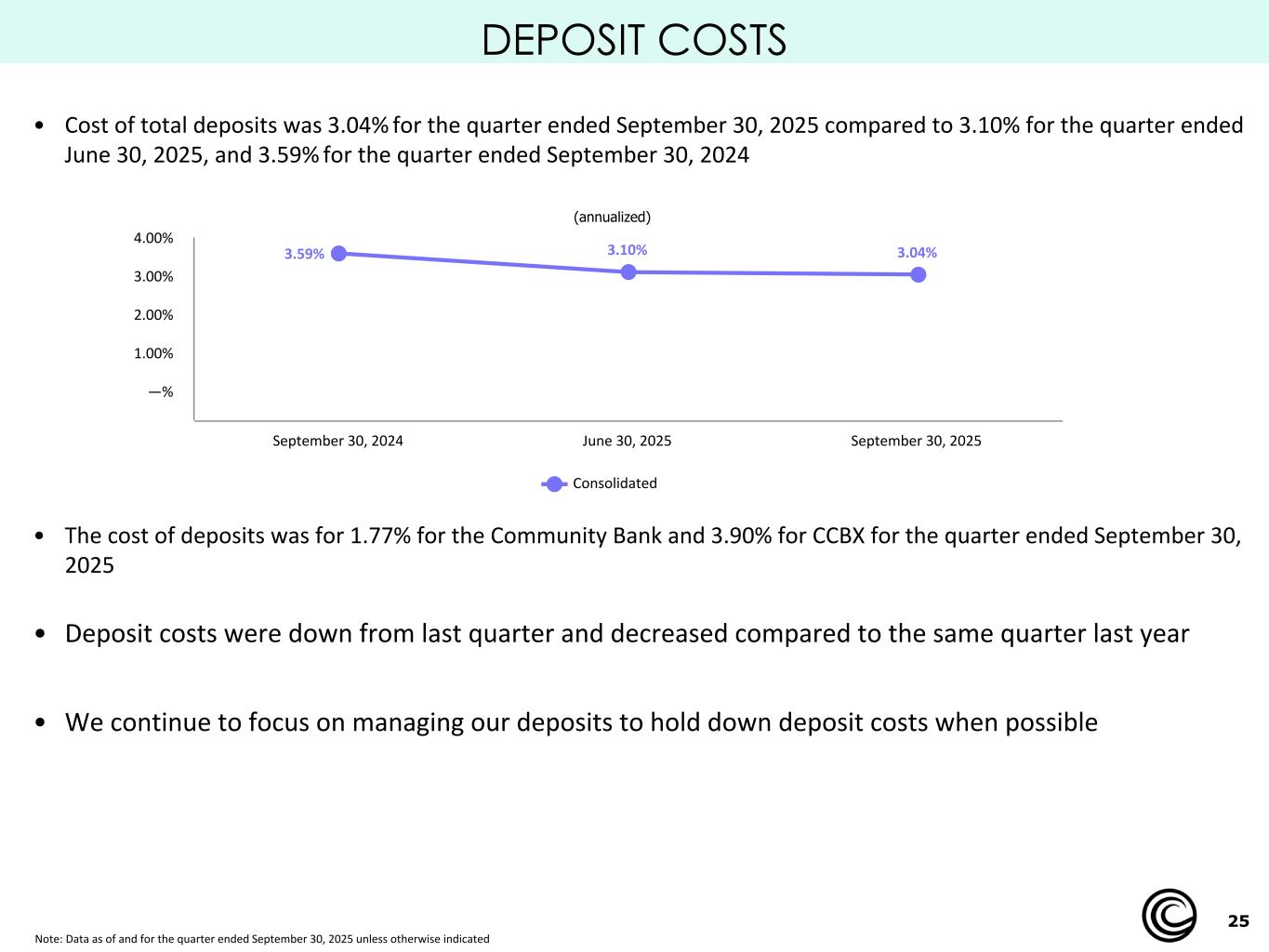 24 Demand, noninterest bearing 14.2% Interest bearing demand and money market 83.8% Savings 1.7% Time deposits < $100K 0.1% Time deposits > $100K 0.2% DEPOSIT COMPOSITION Deposit CompositionEmphasis on core deposits has helped generate an attractive funding mix • Core deposits are all deposits excluding time deposits and brokered deposits • Core deposits were 106.9% of total loans as of September 30, 2025 • Core deposits were 99.7% of total deposits as of September 30, 2025 • Noninterest bearing deposits of $564.4 million as of September 30, 2025 ◦ Community bank noninterest bearing deposits of $499.7 million, or 31.3% of community bank deposits ◦ CCBX noninterest bearing deposits of $64.7 million, or 2.7% of CCBX deposits as of September 30, 2025 • $466.9 million in fully insured IntraFi network deposits as of September 30, 2025, compared to $452.4 million as of June 30, 2025 • 84.4% of total deposits are FDIC insured • CCBX deposits are net of an additional $672.3 million in CCBX deposits that were transferred off balance sheet for increased FDIC insurance coverage and liquidity purposes • Ability to use funding from BaaS program and to transfer deposits off the balance sheet when not needed -This deposit sweep capability allows us to better manage liquidity and deposit programs Note: Data as of and for the quarter ended September 30, 2025 unless otherwise indicated Core Deposits 99.7% Community Bank vs. CCBX Deposits CCBX 59.8% Community Bank 40.2%
