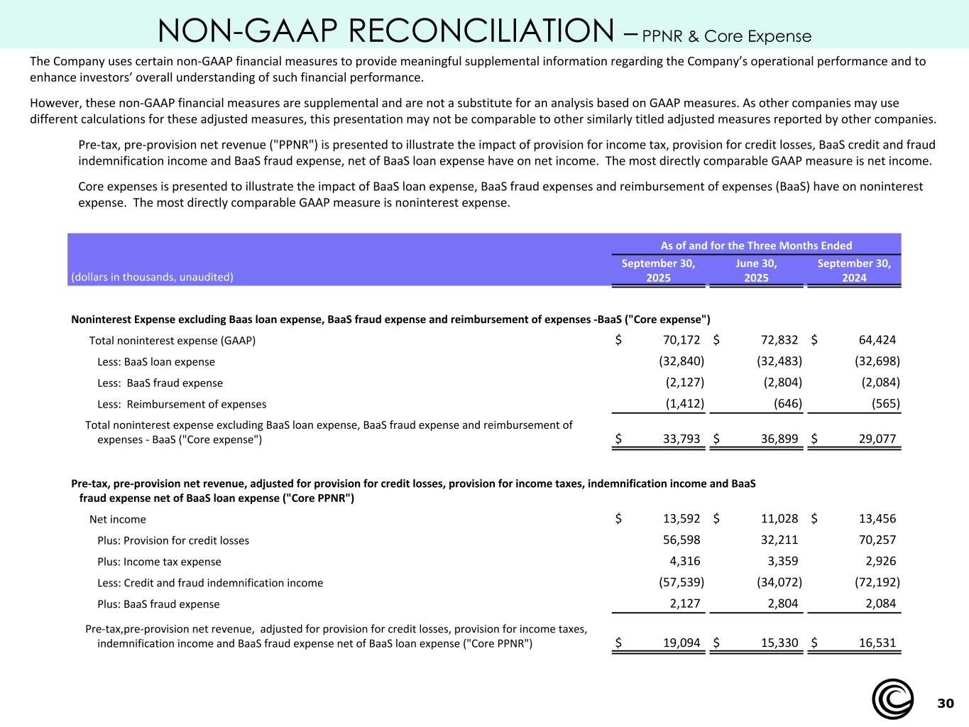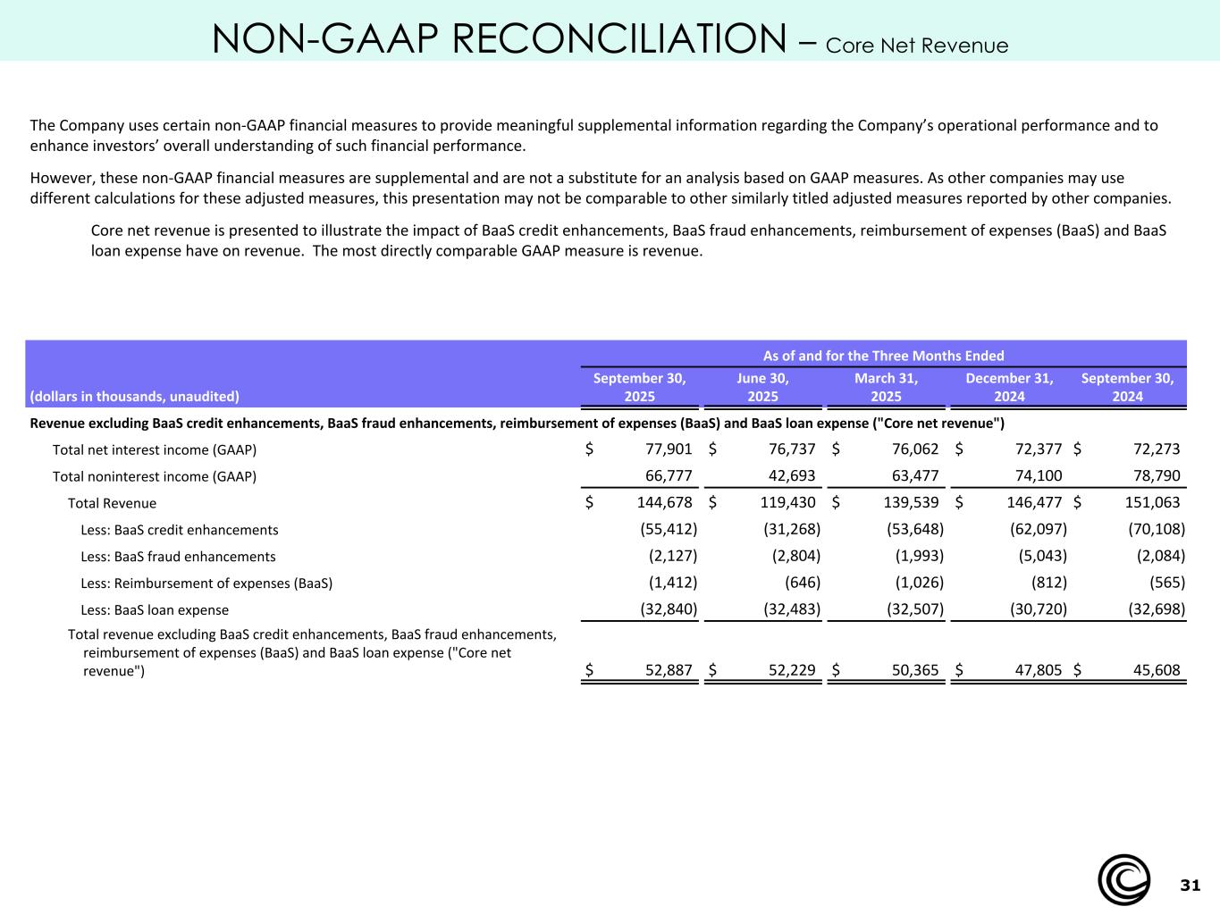 30 NON-GAAP RECONCILIATION – PPNR & Core Expense The Company uses certain non-GAAP financial measures to provide meaningful supplemental information regarding the Company’s operational performance and to enhance investors’ overall understanding of such financial performance. However, these non-GAAP financial measures are supplemental and are not a substitute for an analysis based on GAAP measures. As other companies may use different calculations for these adjusted measures, this presentation may not be comparable to other similarly titled adjusted measures reported by other companies. Pre-tax, pre-provision net revenue ("PPNR") is presented to illustrate the impact of provision for income tax, provision for credit losses, BaaS credit and fraud indemnification income and BaaS fraud expense, net of BaaS loan expense have on net income. The most directly comparable GAAP measure is net income. Core expenses is presented to illustrate the impact of BaaS loan expense, BaaS fraud expenses and reimbursement of expenses (BaaS) have on noninterest expense. The most directly comparable GAAP measure is noninterest expense. As of and for the Three Months Ended (dollars in thousands, unaudited) September 30, 2025 June 30, 2025 September 30, 2024 Noninterest Expense excluding Baas loan expense, BaaS fraud expense and reimbursement of expenses -BaaS ("Core expense") Total noninterest expense (GAAP) $ 70,172 $ 72,832 $ 64,424 Less: BaaS loan expense (32,840) (32,483) (32,698) Less: BaaS fraud expense (2,127) (2,804) (2,084) Less: Reimbursement of expenses (1,412) (646) (565) Total noninterest expense excluding BaaS loan expense, BaaS fraud expense and reimbursement of expenses - BaaS ("Core expense") $ 33,793 $ 36,899 $ 29,077 Pre-tax, pre-provision net revenue, adjusted for provision for credit losses, provision for income taxes, indemnification income and BaaS fraud expense net of BaaS loan expense ("Core PPNR") Net income $ 13,592 $ 11,028 $ 13,456 Plus: Provision for credit losses 56,598 32,211 70,257 Plus: Income tax expense 4,316 3,359 2,926 Less: Credit and fraud indemnification income (57,539) (34,072) (72,192) Plus: BaaS fraud expense 2,127 2,804 2,084 Pre-tax,pre-provision net revenue, adjusted for provision for credit losses, provision for income taxes, indemnification income and BaaS fraud expense net of BaaS loan expense ("Core PPNR") $ 19,094 $ 15,330 $ 16,531