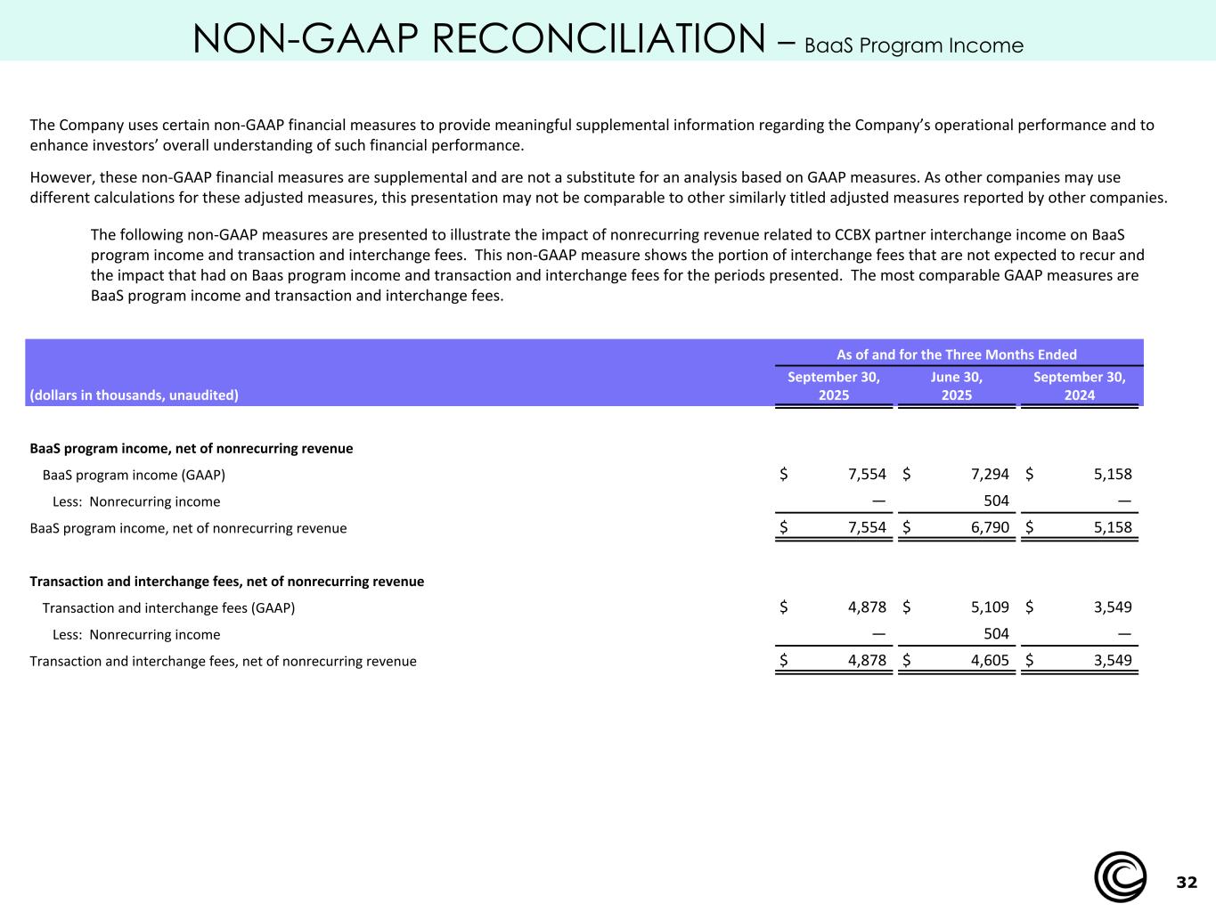 32 NON-GAAP RECONCILIATION – BaaS Program Income The Company uses certain non-GAAP financial measures to provide meaningful supplemental information regarding the Company’s operational performance and to enhance investors’ overall understanding of such financial performance. However, these non-GAAP financial measures are supplemental and are not a substitute for an analysis based on GAAP measures. As other companies may use different calculations for these adjusted measures, this presentation may not be comparable to other similarly titled adjusted measures reported by other companies. The following non-GAAP measures are presented to illustrate the impact of nonrecurring revenue related to CCBX partner interchange income on BaaS program income and transaction and interchange fees. This non-GAAP measure shows the portion of interchange fees that are not expected to recur and the impact that had on Baas program income and transaction and interchange fees for the periods presented. The most comparable GAAP measures are BaaS program income and transaction and interchange fees. As of and for the Three Months Ended (dollars in thousands, unaudited) September 30, 2025 June 30, 2025 September 30, 2024 BaaS program income, net of nonrecurring revenue BaaS program income (GAAP) $ 7,554 $ 7,294 $ 5,158 Less: Nonrecurring income — 504 — BaaS program income, net of nonrecurring revenue $ 7,554 $ 6,790 $ 5,158 Transaction and interchange fees, net of nonrecurring revenue Transaction and interchange fees (GAAP) $ 4,878 $ 5,109 $ 3,549 Less: Nonrecurring income — 504 — Transaction and interchange fees, net of nonrecurring revenue $ 4,878 $ 4,605 $ 3,549