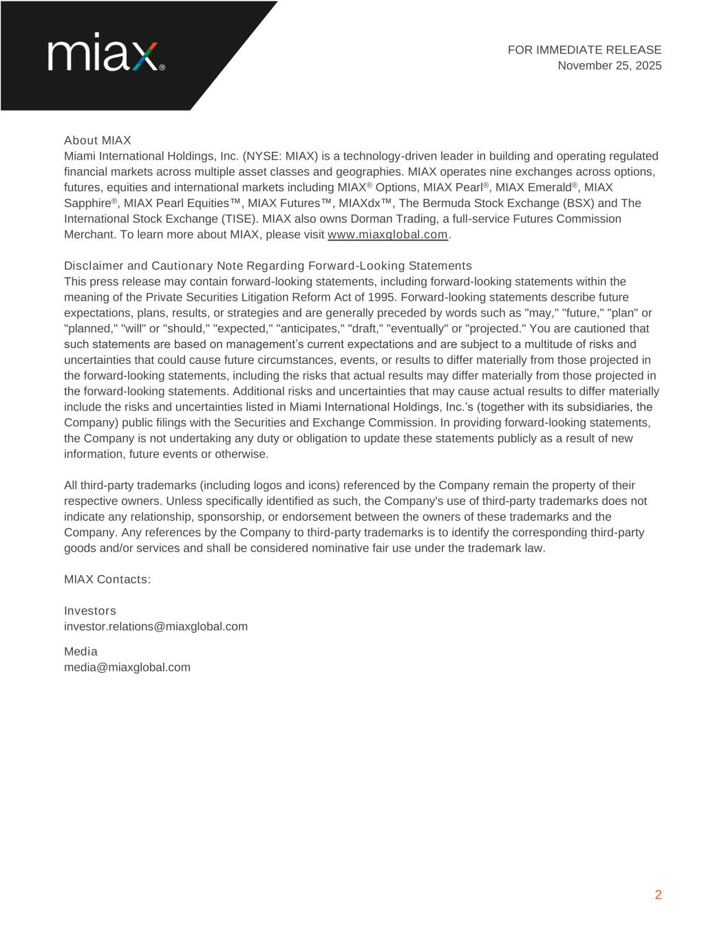 FOR IMMEDIATE RELEASE November 25, 2025 2 About MIAX Miami International Holdings, Inc. (NYSE: MIAX) is a technology-driven leader in building and operating regulated financial markets across multiple asset classes and geographies. MIAX operates nine exchanges across options, futures, equities and international markets including MIAX® Options, MIAX Pearl®, MIAX Emerald®, MIAX Sapphire®, MIAX Pearl Equities™, MIAX Futures™, MIAXdx™, The Bermuda Stock Exchange (BSX) and The International Stock Exchange (TISE). MIAX also owns Dorman Trading, a full-service Futures Commission Merchant. To learn more about MIAX, please visit www.miaxglobal.com. Disclaimer and Cautionary Note Regarding Forward-Looking Statements This press release may contain forward-looking statements, including forward-looking statements within the meaning of the Private Securities Litigation Reform Act of 1995. Forward-looking statements describe future expectations, plans, results, or strategies and are generally preceded by words such as "may," "future," "plan" or "planned," "will" or "should," "expected," "anticipates," "draft," "eventually" or "projected." You are cautioned that such statements are based on management’s current expectations and are subject to a multitude of risks and uncertainties that could cause future circumstances, events, or results to differ materially from those projected in the forward-looking statements, including the risks that actual results may differ materially from those projected in the forward-looking statements. Additional risks and uncertainties that may cause actual results to differ materially include the risks and uncertainties listed in Miami International Holdings, Inc.’s (together with its subsidiaries, the Company) public filings with the Securities and Exchange Commission. In providing forward-looking statements, the Company is not undertaking any duty or obligation to update these statements publicly as a result of new information, future events or otherwise. All third-party trademarks (including logos and icons) referenced by the Company remain the property of their respective owners. Unless specifically identified as such, the Company's use of third-party trademarks does not indicate any relationship, sponsorship, or endorsement between the owners of these trademarks and the Company. Any references by the Company to third-party trademarks is to identify the corresponding third-party goods and/or services and shall be considered nominative fair use under the trademark law. MIAX Contacts: Investors investor.relations@miaxglobal.com Media media@miaxglobal.com