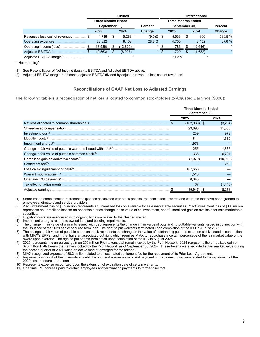Futures International Three Months Ended Three Months Ended September 30, Percent September 30, Percent 2025 2024 Change 2025 2024 Change Revenues less cost of revenues ............... $ 4,786 $ 5,288 (9.5) % $ 5,533 $ 806 586.5 % Operating expenses .................................... 23,322 18,108 28.8 % 4,750 3,452 37.6 % Operating income (loss) ............................. $ (18,536) $ (12,820) * $ 783 $ (2,646) * Adjusted EBITDA(1) ...................................... $ (9,563) $ (8,027) * $ 1,729 $ (1,682) * Adjusted EBITDA margin(2) ......................... * * 31.2 % * * Not meaningful (1) See Reconciliation of Net Income (Loss) to EBITDA and Adjusted EBITDA above. (2) Adjusted EBITDA margin represents adjusted EBITDA divided by adjusted revenues less cost of revenues. Reconciliations of GAAP Net Loss to Adjusted Earnings The following table is a reconciliation of net loss allocated to common stockholders to Adjusted Earnings ($000): Three Months Ended September 30, 2025 2024 Net loss allocated to common shareholders ............................................................................................. $ (102,080) $ (3,204) Share-based compensation(1) ...................................................................................................................... 29,098 11,888 Investment loss(2) ........................................................................................................................................... 239 979 Litigation costs(3) ............................................................................................................................................ 811 1,389 Impairment charge(4) ..................................................................................................................................... 1,978 — Change in fair value of puttable warrants issued with debt(5) ................................................................. 255 1,635 Change in fair value of puttable common stock(6) .................................................................................... 338 6,791 Unrealized gain on derivative assets(7) ...................................................................................................... (7,979) (10,010) Settlement fee(8) ............................................................................................................................................. — 250 Loss on extinguishment of debt(9) ............................................................................................................... 107,656 — Warrant modifications(10) .............................................................................................................................. 1,516 — One time IPO payments(11) ........................................................................................................................... 8,048 — Tax effect of adjustments .............................................................................................................................. 67 (1,445) Adjusted earnings .......................................................................................................................................... $ 39,947 $ 8,273 (1) Share-based compensation represents expenses associated with stock options, restricted stock awards and warrants that have been granted to employees, directors and service providers. (2) 2025 investment loss of $0.2 million represents an unrealized loss on available for sale marketable securities. 2024 investment loss of $1.0 million represents an unrealized loss for an observable price change in the value of an investment, net of unrealized gain on available for sale marketable securities. (3) Litigation costs are associated with ongoing litigation related to the Nasdaq matter. (4) Impairment charges related to owned land and building impairments. (5) The change in fair value of warrants issued with debt represents the change in fair value of outstanding puttable warrants issued in connection with the issuance of the 2029 senior secured term loan. The right to put warrants terminated upon completion of the IPO in August 2025. (6) The change in fair value of puttable common stock represents the change in fair value of outstanding puttable common stock issued in connection with MIAX’s ERPs I and II that have an associated put right which requires MIAX to repurchase a certain percentage of the fair market value of the award upon exercise. The right to put shares terminated upon completion of the IPO in August 2025. (7) 2025 represents the unrealized gain on 250 million Pyth tokens that remain locked by the Pyth Network. 2024 represents the unrealized gain on 375 million Pyth tokens that remain locked by the Pyth Network as of September 30, 2024. These tokens were recorded at fair market value during the second quarter of 2024 when an active market emerged for the tokens. (8) MIAX recognized expense of $0.3 million related to an estimated settlement fee for the repayment of its Prior Loan Agreement. (9) Represents write-off of the unamortized debt discount and issuance costs and payment of prepayment premium related to the repayment of the 2029 senior secured term loan. (10) Represents expense recognized upon the extension of expiration date of certain warrants. (11) One time IPO bonuses paid to certain employees and termination payments to former directors. 9