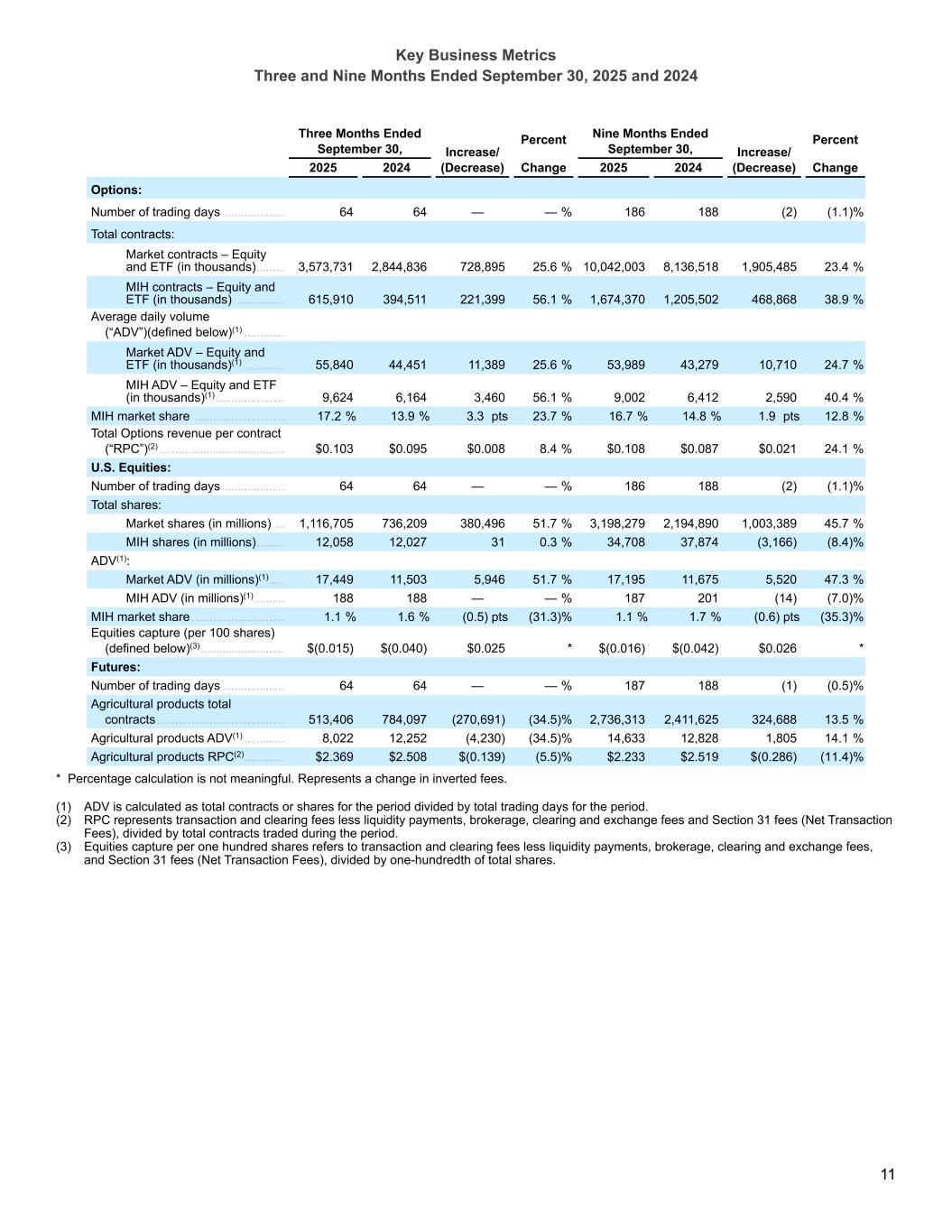 Key Business Metrics Three and Nine Months Ended September 30, 2025 and 2024 Three Months Ended September 30, Increase/ (Decrease) Percent Change Nine Months Ended September 30, Increase/ (Decrease) Percent Change2025 2024 2025 2024 Options: Number of trading days ................... 64 64 — — % 186 188 (2) (1.1) % Total contracts: Market contracts – Equity and ETF (in thousands) ......... 3,573,731 2,844,836 728,895 25.6 % 10,042,003 8,136,518 1,905,485 23.4 % MIH contracts – Equity and ETF (in thousands) ............... 615,910 394,511 221,399 56.1 % 1,674,370 1,205,502 468,868 38.9 % Average daily volume (“ADV”)(defined below)(1) ............. Market ADV – Equity and ETF (in thousands)(1) ............. 55,840 44,451 11,389 25.6 % 53,989 43,279 10,710 24.7 % MIH ADV – Equity and ETF (in thousands)(1) ...................... 9,624 6,164 3,460 56.1 % 9,002 6,412 2,590 40.4 % MIH market share ............................. 17.2 % 13.9 % 3.3 pts 23.7 % 16.7 % 14.8 % 1.9 pts 12.8 % Total Options revenue per contract (“RPC”)(2) ........................................ $0.103 $0.095 $0.008 8.4 % $0.108 $0.087 $0.021 24.1 % U.S. Equities: Number of trading days ................... 64 64 — — % 186 188 (2) (1.1) % Total shares: Market shares (in millions) ... 1,116,705 736,209 380,496 51.7 % 3,198,279 2,194,890 1,003,389 45.7 % MIH shares (in millions) ......... 12,058 12,027 31 0.3 % 34,708 37,874 (3,166) (8.4) % ADV(1): Market ADV (in millions)(1) ..... 17,449 11,503 5,946 51.7 % 17,195 11,675 5,520 47.3 % MIH ADV (in millions)(1) .......... 188 188 — — % 187 201 (14) (7.0) % MIH market share .............................. 1.1 % 1.6 % (0.5) pts (31.3) % 1.1 % 1.7 % (0.6) pts (35.3) % Equities capture (per 100 shares) (defined below)(3) ........................... $(0.015) $(0.040) $0.025 * $(0.016) $(0.042) $0.026 * Futures: Number of trading days .................... 64 64 — — % 187 188 (1) (0.5) % Agricultural products total contracts ......................................... 513,406 784,097 (270,691) (34.5) % 2,736,313 2,411,625 324,688 13.5 % Agricultural products ADV(1) ............. 8,022 12,252 (4,230) (34.5) % 14,633 12,828 1,805 14.1 % Agricultural products RPC(2) ............. $2.369 $2.508 $(0.139) (5.5) % $2.233 $2.519 $(0.286) (11.4) % * Percentage calculation is not meaningful. Represents a change in inverted fees. (1) ADV is calculated as total contracts or shares for the period divided by total trading days for the period. (2) RPC represents transaction and clearing fees less liquidity payments, brokerage, clearing and exchange fees and Section 31 fees (Net Transaction Fees), divided by total contracts traded during the period. (3) Equities capture per one hundred shares refers to transaction and clearing fees less liquidity payments, brokerage, clearing and exchange fees, and Section 31 fees (Net Transaction Fees), divided by one-hundredth of total shares. 11