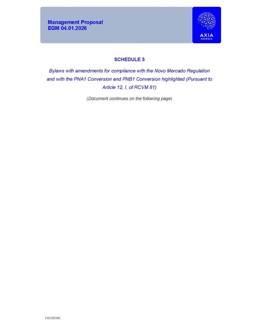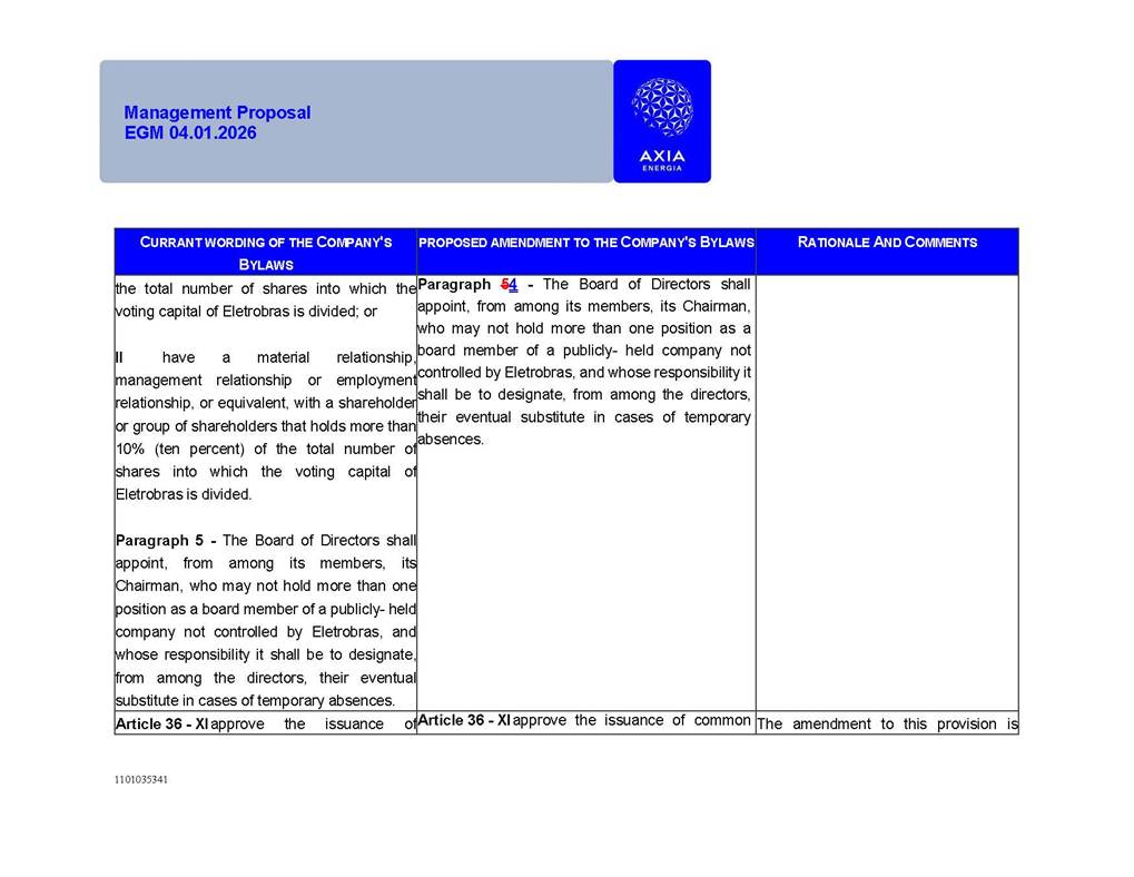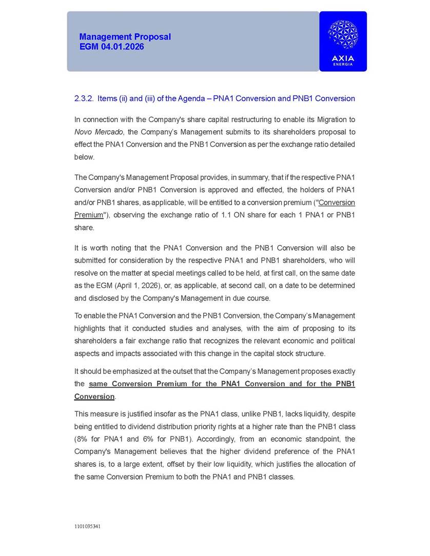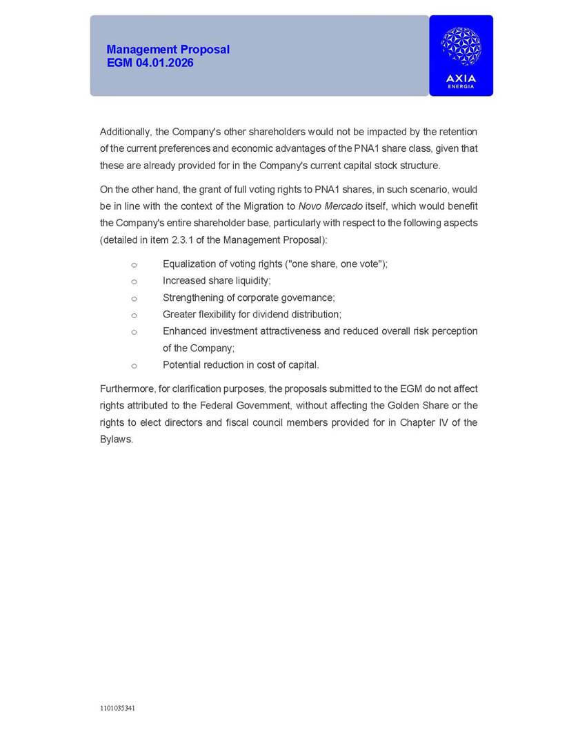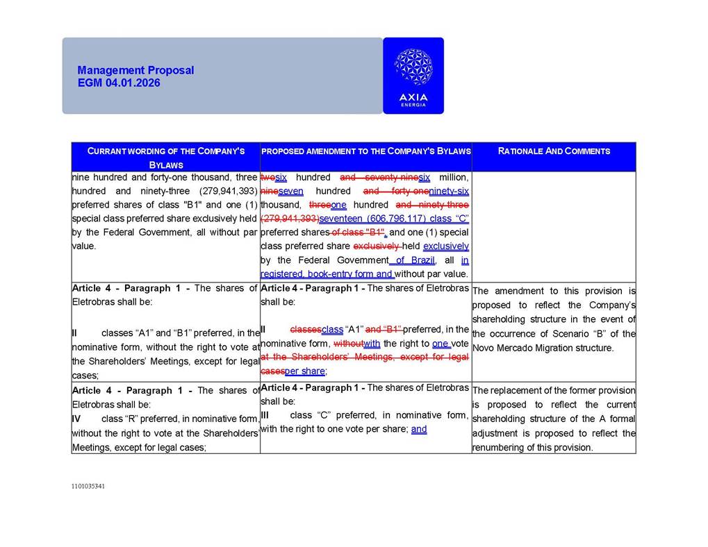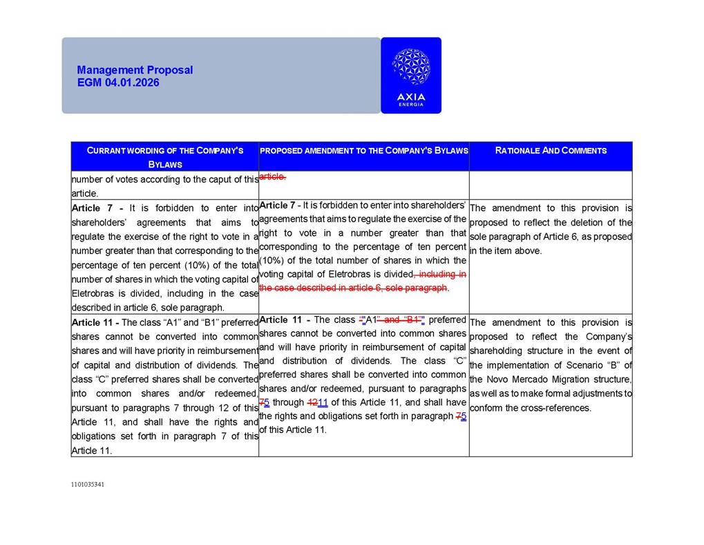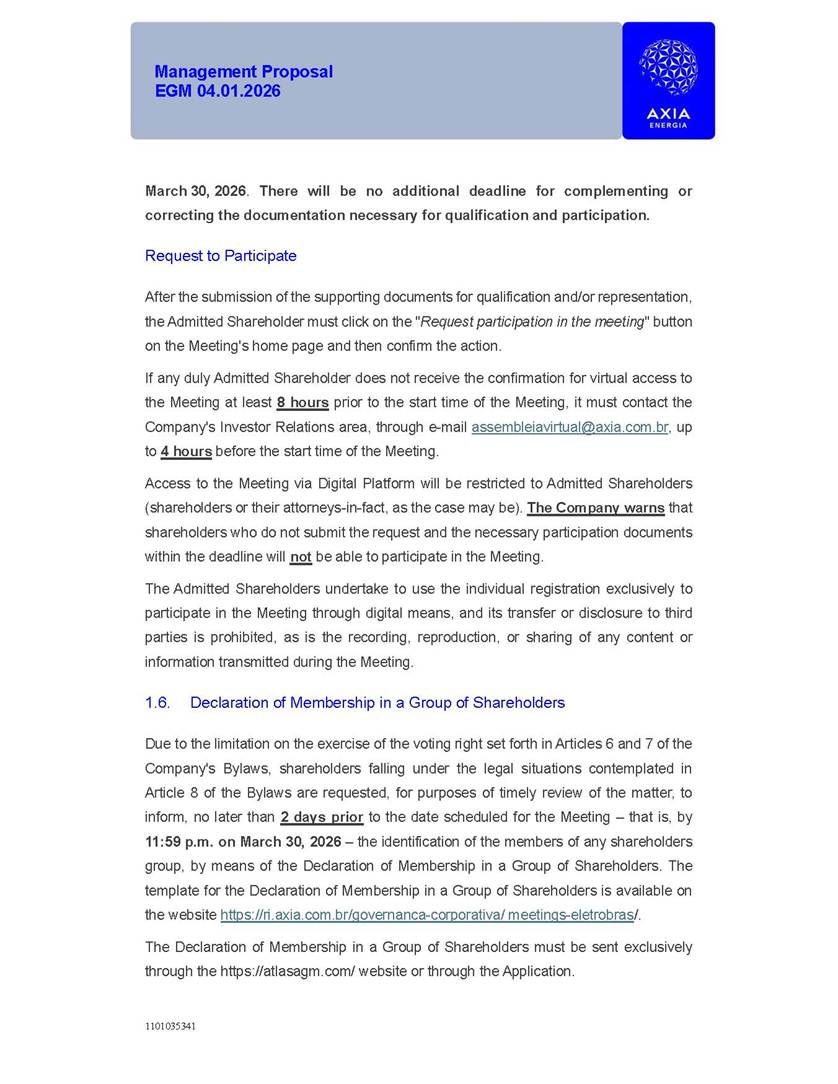 1101035341 Management Proposal EGM 04.01.2026 Management Proposal EGM 04.01.2026 1101035341 Management Proposal EGM 04.01.2026 Index 1. Manual for Participation ................................................................... 47 1.1. Introduction ...................................................................................... 47 1.2. Exclusively Digital Meeting .............................................................. 58 1.3. Remote Voting Ballot (BVD) ............................................................ 69 1.4. Required Documents ..................................................................... 812 1.5. Registration and Accreditation ..................................................... 1013 1.6. Declaration of Membership in a Group of Shareholders .............. 1215 2. Management Proposal .............................................................. 1417 2.1. General Guidelines ...................................................................... 1417 2.2. Agenda ........................................................................................ 1518 2.3. Clarifications on the agenda of the EGM ..................................... 1621 2.4. List of Schedules ......................................................................... 3344 2.5. Conclusion ................................................................................... 3545 SCHEDULE 1 ............................................................................................... 3646 SCHEDULE 2 ............................................................................................... 4259 SCHEDULE 3 ............................................................................................... 4664 SCHEDULE 4 ............................................................................................ 101119 SCHEDULE 5 ........................................................................................... 138157 SCHEDULE 6 ........................................................................................... 189208 SCHEDULE 7 ........................................................................................... 193212 SCHEDULE 8 ........................................................................................... 247266 SCHEDULE 9 ........................................................................................... 284304 1101035341 Management Proposal EGM 04.01.2026 1101035341 Management Proposal EGM 04.01.2026 1. Manual for Participation 1.1. Introduction The Management of CENTRAIS ELÉTRICAS BRASILEIRAS S.A. – Eletrobras, a corporation, headquartered in the City of Rio de Janeiro, State of Rio de Janeiro, at Avenida Graça Aranha, No. 26, Store A, Downtown, Zip code 20030-090, registered in the National Registry of Legal Entities (Cadastro Nacional de Pessoas Jurídicas) ("CNPJ") under No. 00.001.180/0001-26 ("Company" or "AXIA Energia"), with its bylaws filed with the Commercial Registry of the State of Rio de Janeiro (Junta Comercial do Estado do Rio de Janeiro) under NIRE 33.3.00346767, registered with the Brazilian Securities and Exchange Commission (Comissão de Valores Mobiliários) ("CVM") as a publicly-held company category "A" under the code 00243-7, with its securities currently admitted to trading on Level 1 of Corporate Governance of B3 S.A. – Brasil, Bolsa, Balcão ("B3"), pursuant to Brazilian Law No. 6,404, of 1976 ("Brazilian Corporate Law"), and CVM Resolution No. 81, of 2022 ("RCVM 81"), presents this Participation Manual, containing the information, documents and clarifications to guide the participation of shareholders at the Company's Extraordinary General Meeting, to be held exclusively digitally, on first call, on April 1, 2026, at 4 p.m., considering, therefore, to be held at the Company's headquarters ("Meeting" or "EGM" and "Manual", respectively), as well as the management proposal regarding the resolutions on the agenda, including the analysis of the matters submitted to the shareholders at the Meeting ("Management Proposal"). The Company's Management clarifies that, on this same date, it is also disclosing the call notice calling the Special Meeting of Class "A1" Preferred Shareholders ("PNA1") ("PNA1 Special Meeting") and the Special Meeting of Class "B1" Preferred Shareholders ("PNB1") ("PNB1 Special Meeting"), to be held, likewise, on April 1, 2026. As will be detailed in this Management Proposal, the PNA1 Special Meeting and the PNB1 Special Meeting are part of the context of this EGM, being held pursuant to and for the purposes of article 136, §1, of the Brazilian Corporate Law, given that the EGM agenda contemplates proposals for conversion of PNA1 and PNB1 shares. 1101035341 Management Proposal EGM 04.01.2026 1.2. Exclusively Digital Meeting The Meeting will be exclusively digital, to be held through the digital platform of "Atlas AGM" ("Digital Platform"). The exclusively digital format is intended to facilitate the participation of shareholders and others involved in the Meeting, pursuant to the Brazilian Corporate Law, RCVM 81 and the Company's Bylaws. Shareholders who wish to participate in the Meeting must register on the https://atlasagm.com website or through the "Atlas AGM" application available on the Apple Store and Google Play Store ("Application") and submit all documents necessary to qualify for participation or voting at the Meeting by 11:59 p.m. on March 30, 2026. The Digital Platform meets the requirements set forth in article 28, paragraph 1, items I to III, of RCVM 81 and the Meeting will be fully recorded. By accessing the Digital Platform and participating in the Meeting, the Admitted Shareholder (as defined below) authorizes the Company, and third parties authorized by the Company, to record and use the information, in accordance with applicable law. The recordings and related information will be used and processed by the Company for a period of five years, and may be used for the Company's de