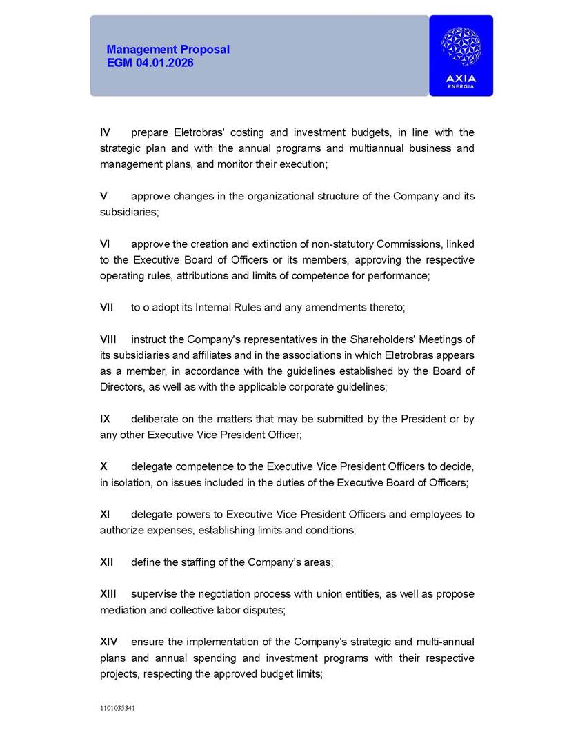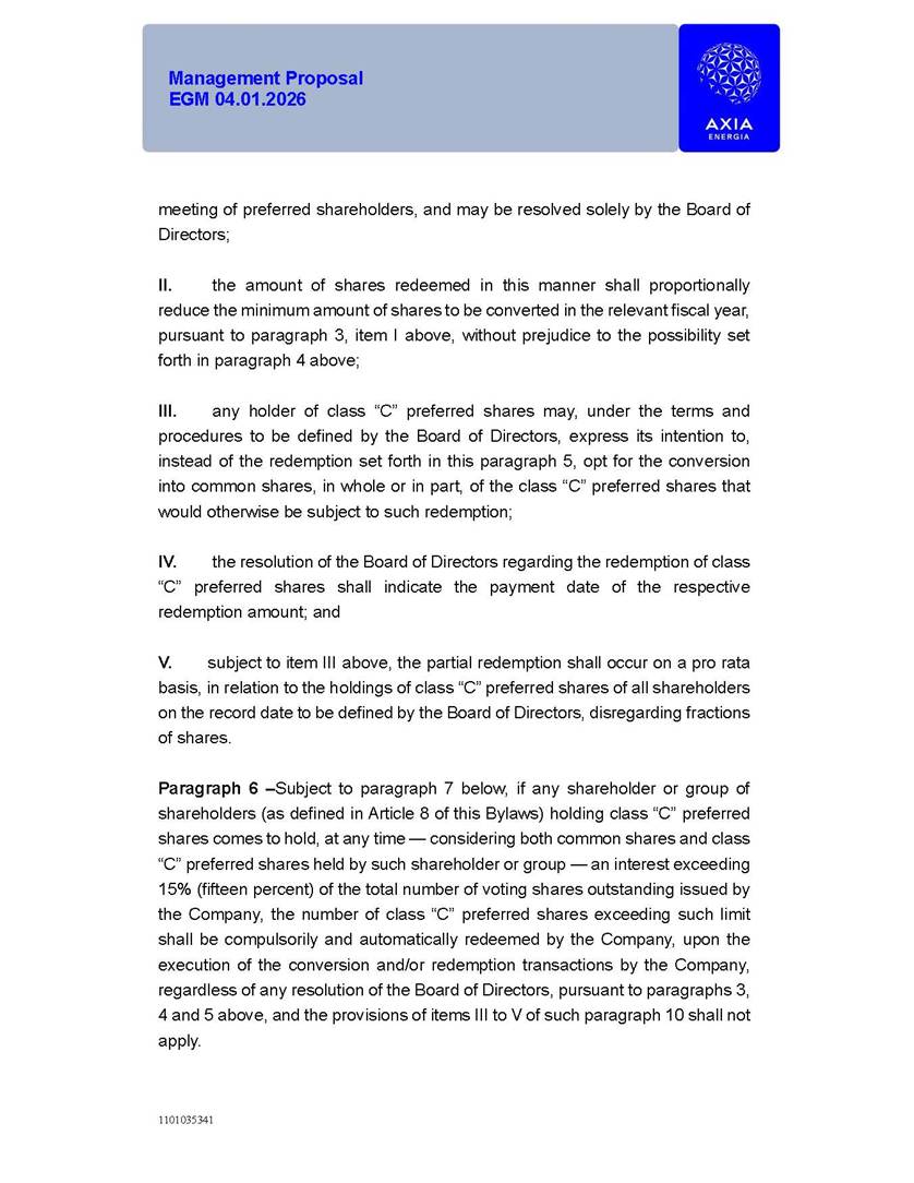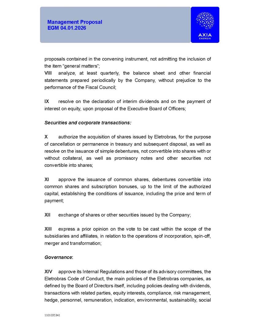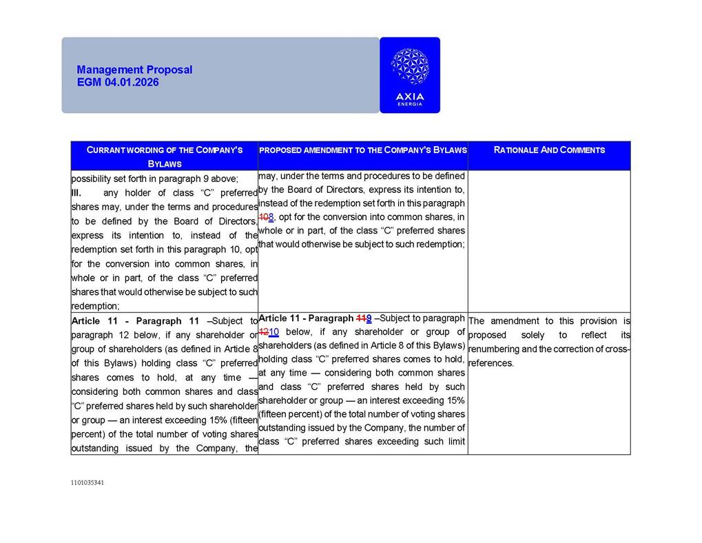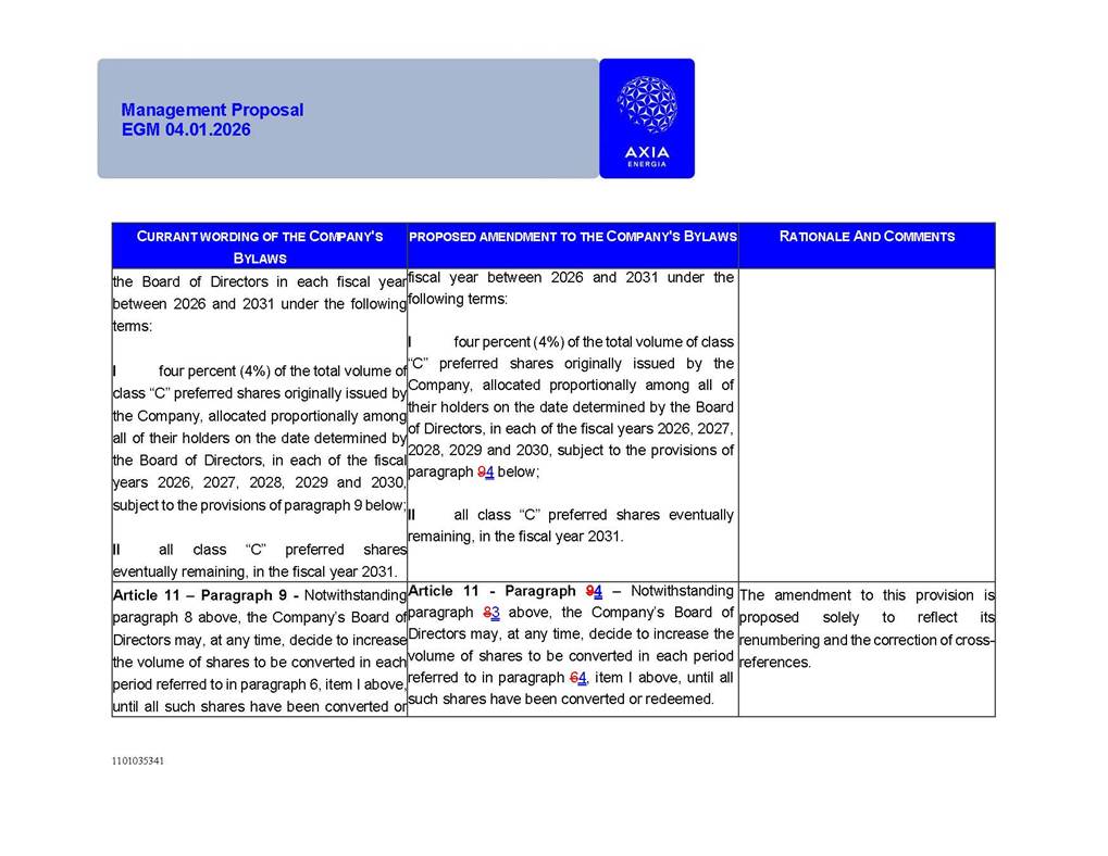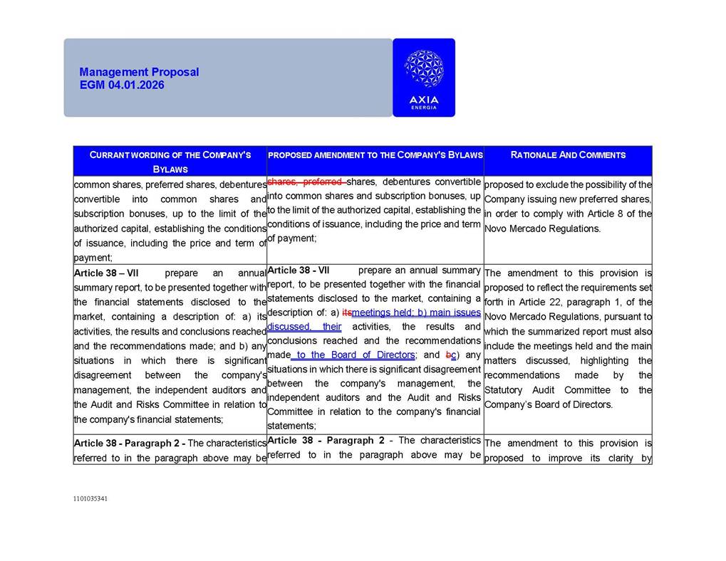 1101035341 Management Proposal EGM 04.01.2026 Management Proposal EGM 04.01.2026 1101035341 Management Proposal EGM 04.01.2026 Index 1. Manual for Participation ................................................................... 47 1.1. Introduction ...................................................................................... 47 1.2. Exclusively Digital Meeting .............................................................. 58 1.3. Remote Voting Ballot (BVD) ............................................................ 69 1.4. Required Documents ..................................................................... 812 1.5. Registration and Accreditation ..................................................... 1013 1.6. Declaration of Membership in a Group of Shareholders .............. 1215 2. Management Proposal .............................................................. 1417 2.1. General Guidelines ...................................................................... 1417 2.2. Agenda ........................................................................................ 1518 2.3. Clarifications on the agenda of the EGM ..................................... 1621 2.4. List of Schedules ......................................................................... 3344 2.5. Conclusion ................................................................................... 3545 SCHEDULE 1 ............................................................................................... 3646 SCHEDULE 2 ............................................................................................... 4259 SCHEDULE 3 ............................................................................................... 4664 SCHEDULE 4 ............................................................................................ 101119 SCHEDULE 5 ........................................................................................... 138157 SCHEDULE 6 ........................................................................................... 189208 SCHEDULE 7 ........................................................................................... 193212 SCHEDULE 8 ........................................................................................... 247266 SCHEDULE 9 ........................................................................................... 284304 1101035341 Management Proposal EGM 04.01.2026 1101035341 Management Proposal EGM 04.01.2026 1. Manual for Participation 1.1. Introduction The Management of CENTRAIS ELÉTRICAS BRASILEIRAS S.A. – Eletrobras, a corporation, headquartered in the City of Rio de Janeiro, State of Rio de Janeiro, at Avenida Graça Aranha, No. 26, Store A, Downtown, Zip code 20030-090, registered in the National Registry of Legal Entities (Cadastro Nacional de Pessoas Jurídicas) ("CNPJ") under No. 00.001.180/0001-26 ("Company" or "AXIA Energia"), with its bylaws filed with the Commercial Registry of the State of Rio de Janeiro (Junta Comercial do Estado do Rio de Janeiro) under NIRE 33.3.00346767, registered with the Brazilian Securities and Exchange Commission (Comissão de Valores Mobiliários) ("CVM") as a publicly-held company category "A" under the code 00243-7, with its securities currently admitted to trading on Level 1 of Corporate Governance of B3 S.A. – Brasil, Bolsa, Balcão ("B3"), pursuant to Brazilian Law No. 6,404, of 1976 ("Brazilian Corporate Law"), and CVM Resolution No. 81, of 2022 ("RCVM 81"), presents this Participation Manual, containing the information, documents and clarifications to guide the participation of shareholders at the Company's Extraordinary General Meeting, to be held exclusively digitally, on first call, on April 1, 2026, at 4 p.m., considering, therefore, to be held at the Company's headquarters ("Meeting" or "EGM" and "Manual", respectively), as well as the management proposal regarding the resolutions on the agenda, including the analysis of the matters submitted to the shareholders at the Meeting ("Management Proposal"). The Company's Management clarifies that, on this same date, it is also disclosing the call notice calling the Special Meeting of Class "A1" Preferred Shareholders ("PNA1") ("PNA1 Special Meeting") and the Special Meeting of Class "B1" Preferred Shareholders ("PNB1") ("PNB1 Special Meeting"), to be held, likewise, on April 1, 2026. As will be detailed in this Management Proposal, the PNA1 Special Meeting and the PNB1 Special Meeting are part of the context of this EGM, being held pursuant to and for the purposes of article 136, §1, of the Brazilian Corporate Law, given that the EGM agenda contemplates proposals for conversion of PNA1 and PNB1 shares. 1101035341 Management Proposal EGM 04.01.2026 1.2. Exclusively Digital Meeting The Meeting will be exclusively digital, to be held through the digital platform of "Atlas AGM" ("Digital Platform"). The exclusively digital format is intended to facilitate the participation of shareholders and others involved in the Meeting, pursuant to the Brazilian Corporate Law, RCVM 81 and the Company's Bylaws. Shareholders who wish to participate in the Meeting must register on the https://atlasagm.com website or through the "Atlas AGM" application available on the Apple Store and Google Play Store ("Application") and submit all documents necessary to qualify for participation or voting at the Meeting by 11:59 p.m. on March 30, 2026. The Digital Platform meets the requirements set forth in article 28, paragraph 1, items I to III, of RCVM 81 and the Meeting will be fully recorded. By accessing the Digital Platform and participating in the Meeting, the Admitted Shareholder (as defined below) authorizes the Company, and third parties authorized by the Company, to record and use the information, in accordance with applicable law. The recordings and related information will be used and processed by the Company for a period of five years, and may be used for the Company's de
