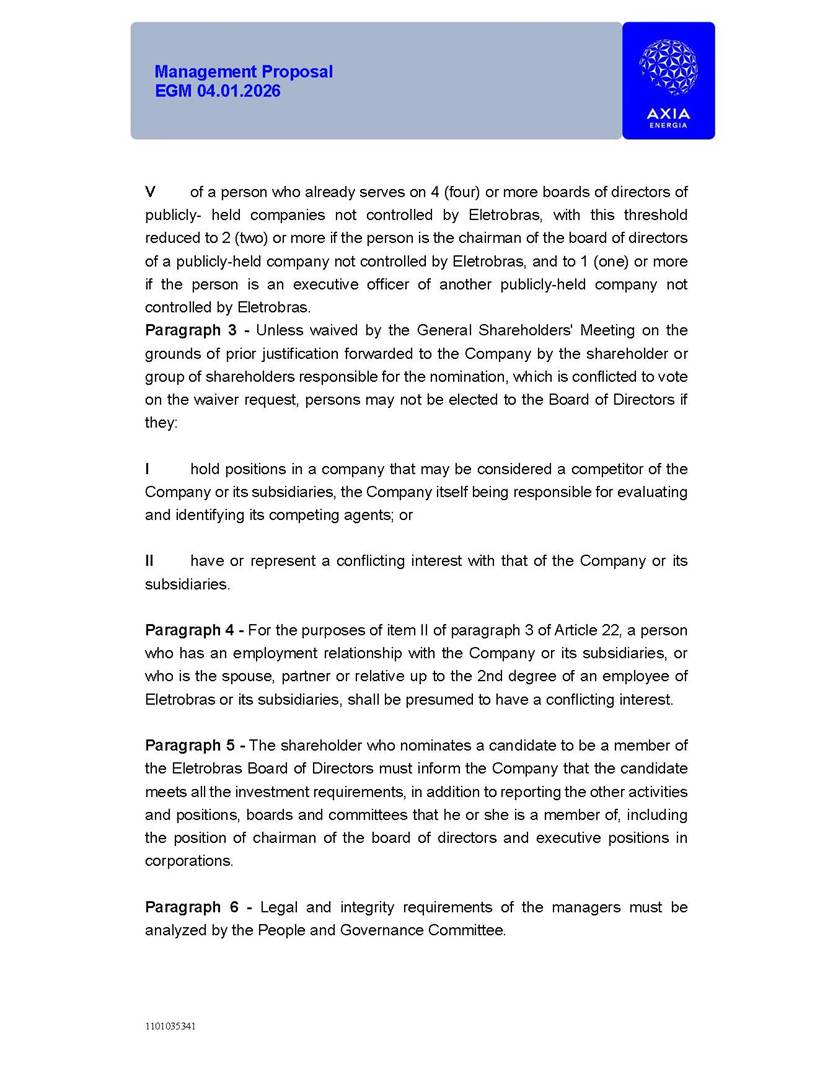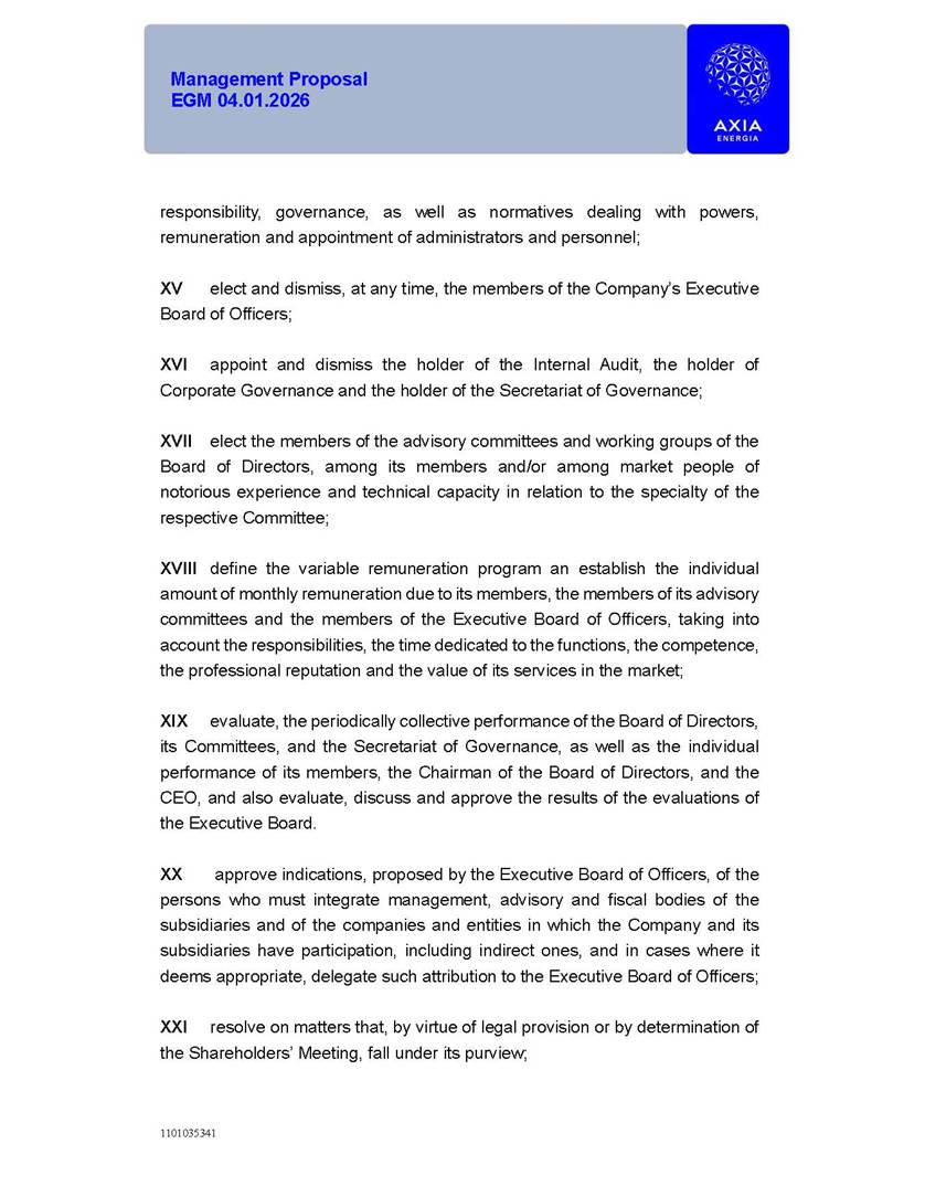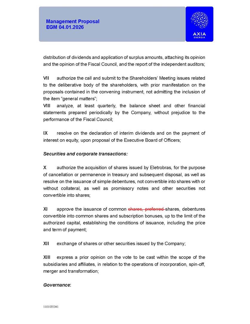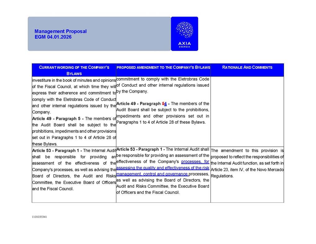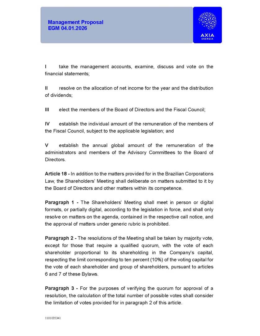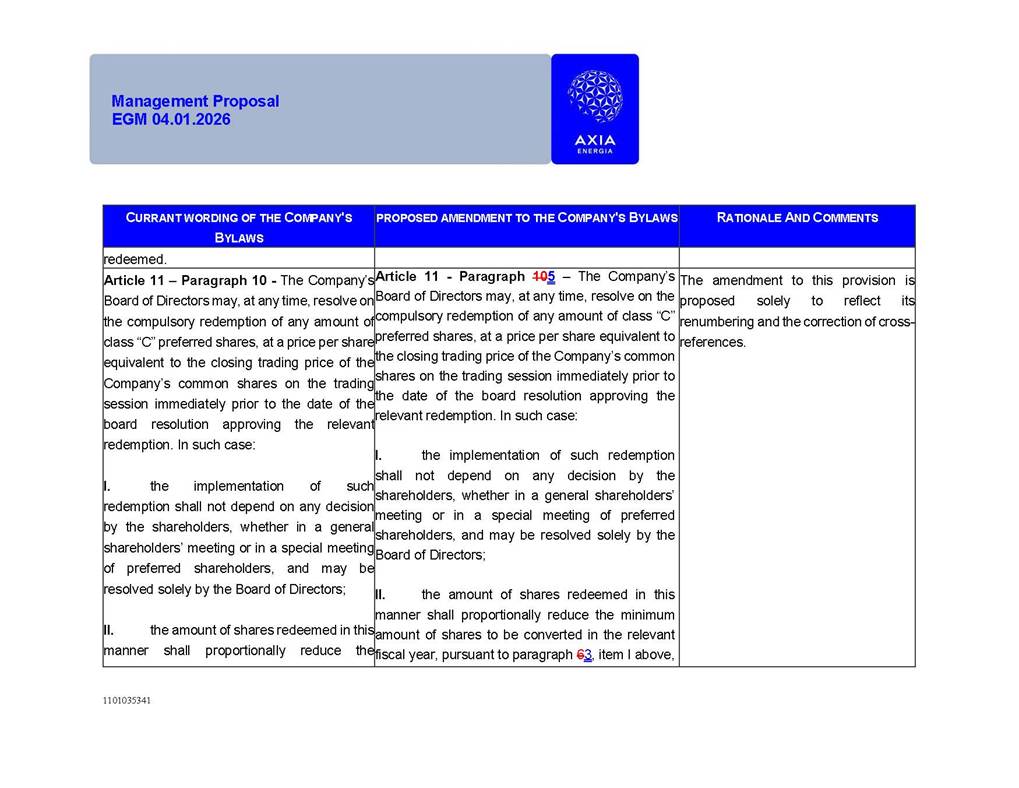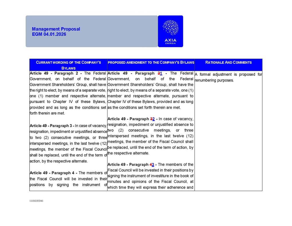 1101035341 Management Proposal EGM 04.01.2026 Management Proposal EGM 04.01.2026 1101035341 Management Proposal EGM 04.01.2026 Index 1. Manual for Participation ................................................................... 47 1.1. Introduction ...................................................................................... 47 1.2. Exclusively Digital Meeting .............................................................. 58 1.3. Remote Voting Ballot (BVD) ............................................................ 69 1.4. Required Documents ..................................................................... 812 1.5. Registration and Accreditation ..................................................... 1013 1.6. Declaration of Membership in a Group of Shareholders .............. 1215 2. Management Proposal .............................................................. 1417 2.1. General Guidelines ...................................................................... 1417 2.2. Agenda ........................................................................................ 1518 2.3. Clarifications on the agenda of the EGM ..................................... 1621 2.4. List of Schedules ......................................................................... 3344 2.5. Conclusion ................................................................................... 3545 SCHEDULE 1 ............................................................................................... 3646 SCHEDULE 2 ............................................................................................... 4259 SCHEDULE 3 ............................................................................................... 4664 SCHEDULE 4 ............................................................................................ 101119 SCHEDULE 5 ........................................................................................... 138157 SCHEDULE 6 ........................................................................................... 189208 SCHEDULE 7 ........................................................................................... 193212 SCHEDULE 8 ........................................................................................... 247266 SCHEDULE 9 ........................................................................................... 284304 1101035341 Management Proposal EGM 04.01.2026 1101035341 Management Proposal EGM 04.01.2026 1. Manual for Participation 1.1. Introduction The Management of CENTRAIS ELÉTRICAS BRASILEIRAS S.A. – Eletrobras, a corporation, headquartered in the City of Rio de Janeiro, State of Rio de Janeiro, at Avenida Graça Aranha, No. 26, Store A, Downtown, Zip code 20030-090, registered in the National Registry of Legal Entities (Cadastro Nacional de Pessoas Jurídicas) ("CNPJ") under No. 00.001.180/0001-26 ("Company" or "AXIA Energia"), with its bylaws filed with the Commercial Registry of the State of Rio de Janeiro (Junta Comercial do Estado do Rio de Janeiro) under NIRE 33.3.00346767, registered with the Brazilian Securities and Exchange Commission (Comissão de Valores Mobiliários) ("CVM") as a publicly-held company category "A" under the code 00243-7, with its securities currently admitted to trading on Level 1 of Corporate Governance of B3 S.A. – Brasil, Bolsa, Balcão ("B3"), pursuant to Brazilian Law No. 6,404, of 1976 ("Brazilian Corporate Law"), and CVM Resolution No. 81, of 2022 ("RCVM 81"), presents this Participation Manual, containing the information, documents and clarifications to guide the participation of shareholders at the Company's Extraordinary General Meeting, to be held exclusively digitally, on first call, on April 1, 2026, at 4 p.m., considering, therefore, to be held at the Company's headquarters ("Meeting" or "EGM" and "Manual", respectively), as well as the management proposal regarding the resolutions on the agenda, including the analysis of the matters submitted to the shareholders at the Meeting ("Management Proposal"). The Company's Management clarifies that, on this same date, it is also disclosing the call notice calling the Special Meeting of Class "A1" Preferred Shareholders ("PNA1") ("PNA1 Special Meeting") and the Special Meeting of Class "B1" Preferred Shareholders ("PNB1") ("PNB1 Special Meeting"), to be held, likewise, on April 1, 2026. As will be detailed in this Management Proposal, the PNA1 Special Meeting and the PNB1 Special Meeting are part of the context of this EGM, being held pursuant to and for the purposes of article 136, §1, of the Brazilian Corporate Law, given that the EGM agenda contemplates proposals for conversion of PNA1 and PNB1 shares. 1101035341 Management Proposal EGM 04.01.2026 1.2. Exclusively Digital Meeting The Meeting will be exclusively digital, to be held through the digital platform of "Atlas AGM" ("Digital Platform"). The exclusively digital format is intended to facilitate the participation of shareholders and others involved in the Meeting, pursuant to the Brazilian Corporate Law, RCVM 81 and the Company's Bylaws. Shareholders who wish to participate in the Meeting must register on the https://atlasagm.com website or through the "Atlas AGM" application available on the Apple Store and Google Play Store ("Application") and submit all documents necessary to qualify for participation or voting at the Meeting by 11:59 p.m. on March 30, 2026. The Digital Platform meets the requirements set forth in article 28, paragraph 1, items I to III, of RCVM 81 and the Meeting will be fully recorded. By accessing the Digital Platform and participating in the Meeting, the Admitted Shareholder (as defined below) authorizes the Company, and third parties authorized by the Company, to record and use the information, in accordance with applicable law. The recordings and related information will be used and processed by the Company for a period of five years, and may be used for the Company's de