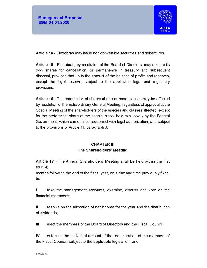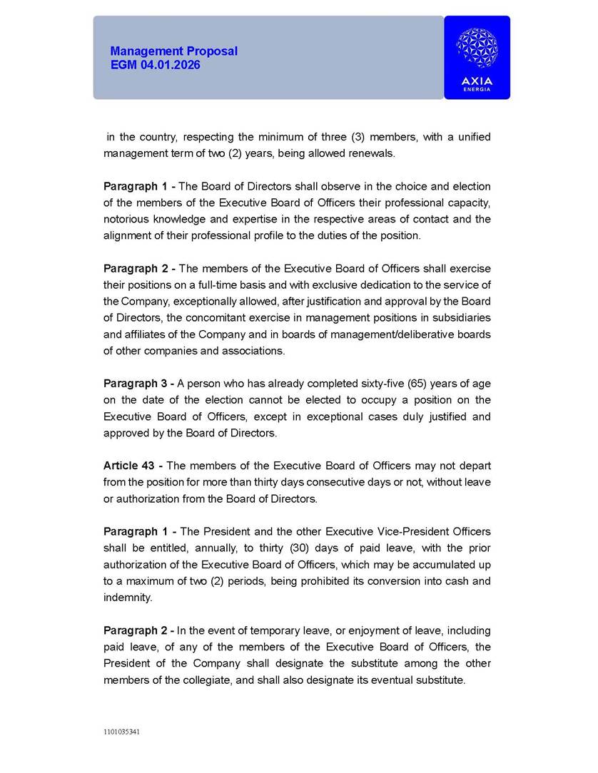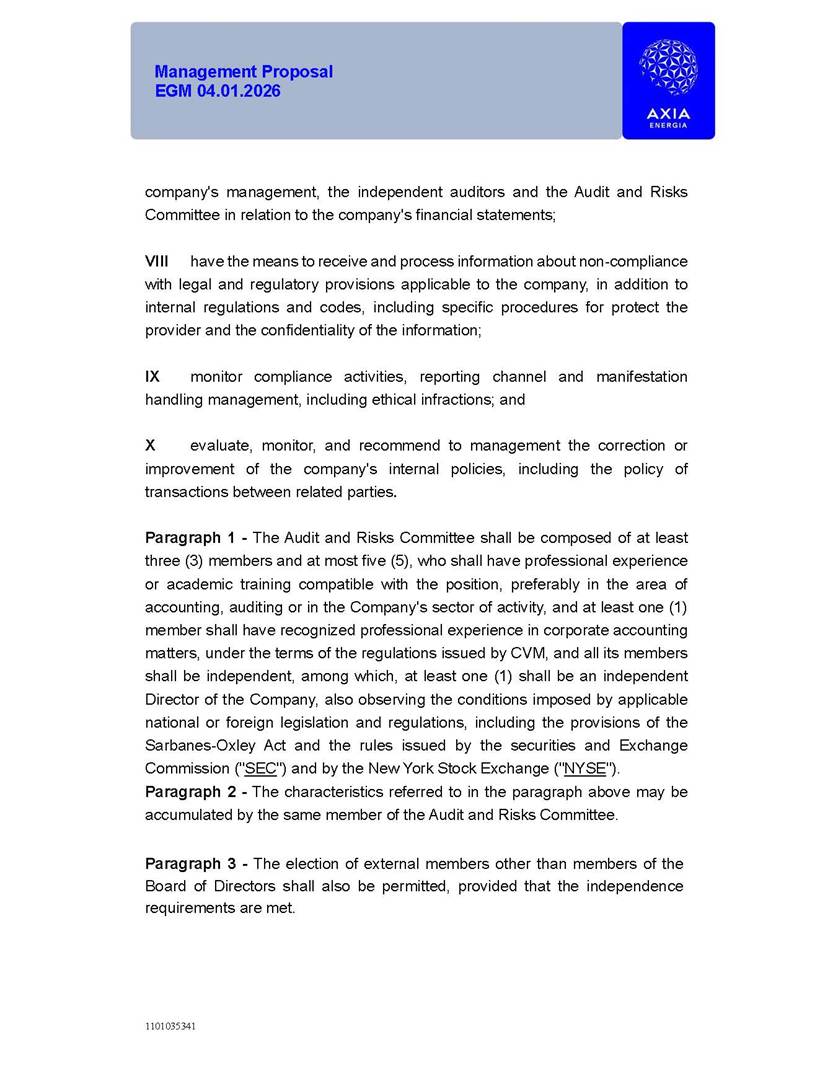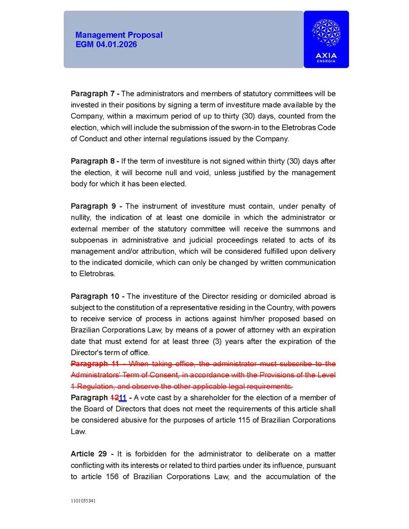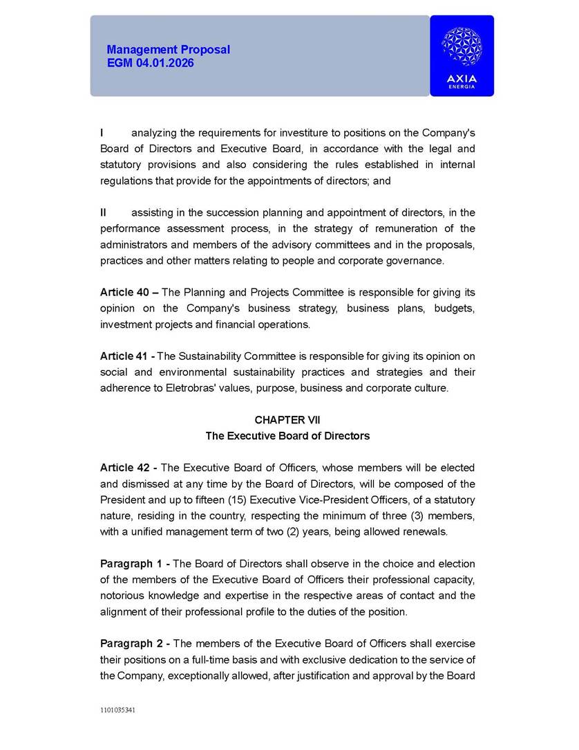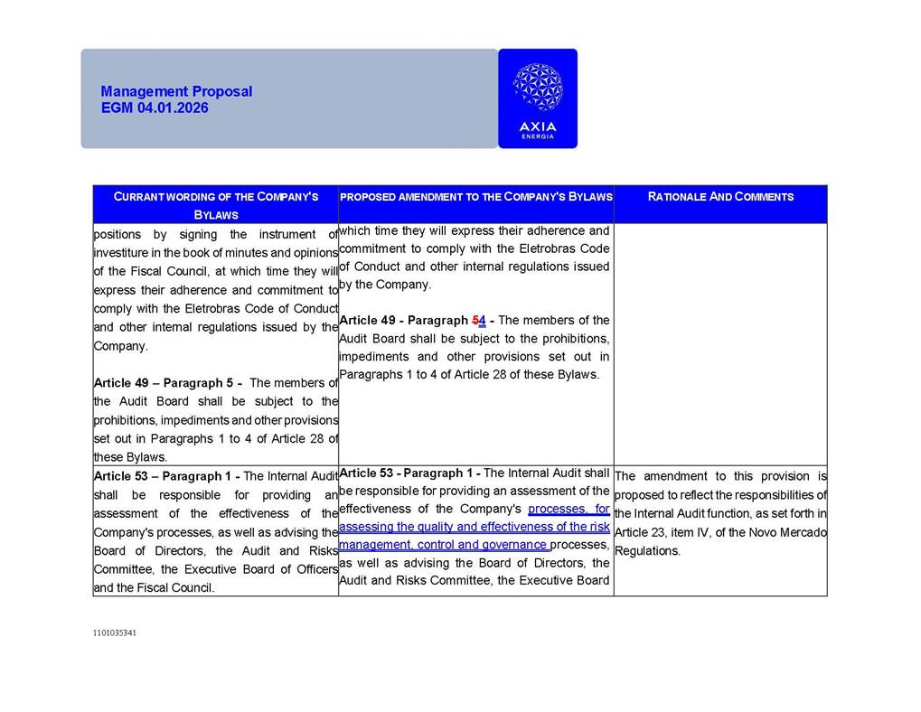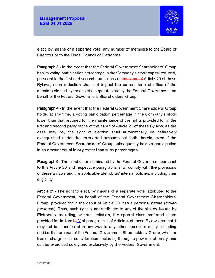1101035341 Management Proposal EGM 04.01.2026 Management Proposal EGM 04.01.2026 1101035341 Management Proposal EGM 04.01.2026 Index 1. Manual for Participation ................................................................... 47 1.1. Introduction ...................................................................................... 47 1.2. Exclusively Digital Meeting .............................................................. 58 1.3. Remote Voting Ballot (BVD) ............................................................ 69 1.4. Required Documents ..................................................................... 812 1.5. Registration and Accreditation ..................................................... 1013 1.6. Declaration of Membership in a Group of Shareholders .............. 1215 2. Management Proposal .............................................................. 1417 2.1. General Guidelines ...................................................................... 1417 2.2. Agenda ........................................................................................ 1518 2.3. Clarifications on the agenda of the EGM ..................................... 1621 2.4. List of Schedules ......................................................................... 3344 2.5. Conclusion ................................................................................... 3545 SCHEDULE 1 ............................................................................................... 3646 SCHEDULE 2 ............................................................................................... 4259 SCHEDULE 3 ............................................................................................... 4664 SCHEDULE 4 ............................................................................................ 101119 SCHEDULE 5 ........................................................................................... 138157 SCHEDULE 6 ........................................................................................... 189208 SCHEDULE 7 ........................................................................................... 193212 SCHEDULE 8 ........................................................................................... 247266 SCHEDULE 9 ........................................................................................... 284304 1101035341 Management Proposal EGM 04.01.2026 1101035341 Management Proposal EGM 04.01.2026 1. Manual for Participation 1.1. Introduction The Management of CENTRAIS ELÉTRICAS BRASILEIRAS S.A. – Eletrobras, a corporation, headquartered in the City of Rio de Janeiro, State of Rio de Janeiro, at Avenida Graça Aranha, No. 26, Store A, Downtown, Zip code 20030-090, registered in the National Registry of Legal Entities (Cadastro Nacional de Pessoas Jurídicas) ("CNPJ") under No. 00.001.180/0001-26 ("Company" or "AXIA Energia"), with its bylaws filed with the Commercial Registry of the State of Rio de Janeiro (Junta Comercial do Estado do Rio de Janeiro) under NIRE 33.3.00346767, registered with the Brazilian Securities and Exchange Commission (Comissão de Valores Mobiliários) ("CVM") as a publicly-held company category "A" under the code 00243-7, with its securities currently admitted to trading on Level 1 of Corporate Governance of B3 S.A. – Brasil, Bolsa, Balcão ("B3"), pursuant to Brazilian Law No. 6,404, of 1976 ("Brazilian Corporate Law"), and CVM Resolution No. 81, of 2022 ("RCVM 81"), presents this Participation Manual, containing the information, documents and clarifications to guide the participation of shareholders at the Company's Extraordinary General Meeting, to be held exclusively digitally, on first call, on April 1, 2026, at 4 p.m., considering, therefore, to be held at the Company's headquarters ("Meeting" or "EGM" and "Manual", respectively), as well as the management proposal regarding the resolutions on the agenda, including the analysis of the matters submitted to the shareholders at the Meeting ("Management Proposal"). The Company's Management clarifies that, on this same date, it is also disclosing the call notice calling the Special Meeting of Class "A1" Preferred Shareholders ("PNA1") ("PNA1 Special Meeting") and the Special Meeting of Class "B1" Preferred Shareholders ("PNB1") ("PNB1 Special Meeting"), to be held, likewise, on April 1, 2026. As will be detailed in this Management Proposal, the PNA1 Special Meeting and the PNB1 Special Meeting are part of the context of this EGM, being held pursuant to and for the purposes of article 136, §1, of the Brazilian Corporate Law, given that the EGM agenda contemplates proposals for conversion of PNA1 and PNB1 shares. 1101035341 Management Proposal EGM 04.01.2026 1.2. Exclusively Digital Meeting The Meeting will be exclusively digital, to be held through the digital platform of "Atlas AGM" ("Digital Platform"). The exclusively digital format is intended to facilitate the participation of shareholders and others involved in the Meeting, pursuant to the Brazilian Corporate Law, RCVM 81 and the Company's Bylaws. Shareholders who wish to participate in the Meeting must register on the https://atlasagm.com website or through the "Atlas AGM" application available on the Apple Store and Google Play Store ("Application") and submit all documents necessary to qualify for participation or voting at the Meeting by 11:59 p.m. on March 30, 2026. The Digital Platform meets the requirements set forth in article 28, paragraph 1, items I to III, of RCVM 81 and the Meeting will be fully recorded. By accessing the Digital Platform and participating in the Meeting, the Admitted Shareholder (as defined below) authorizes the Company, and third parties authorized by the Company, to record and use the information, in accordance with applicable law. The recordings and related information will be used and processed by the Company for a period of five years, and may be used for the Company's de