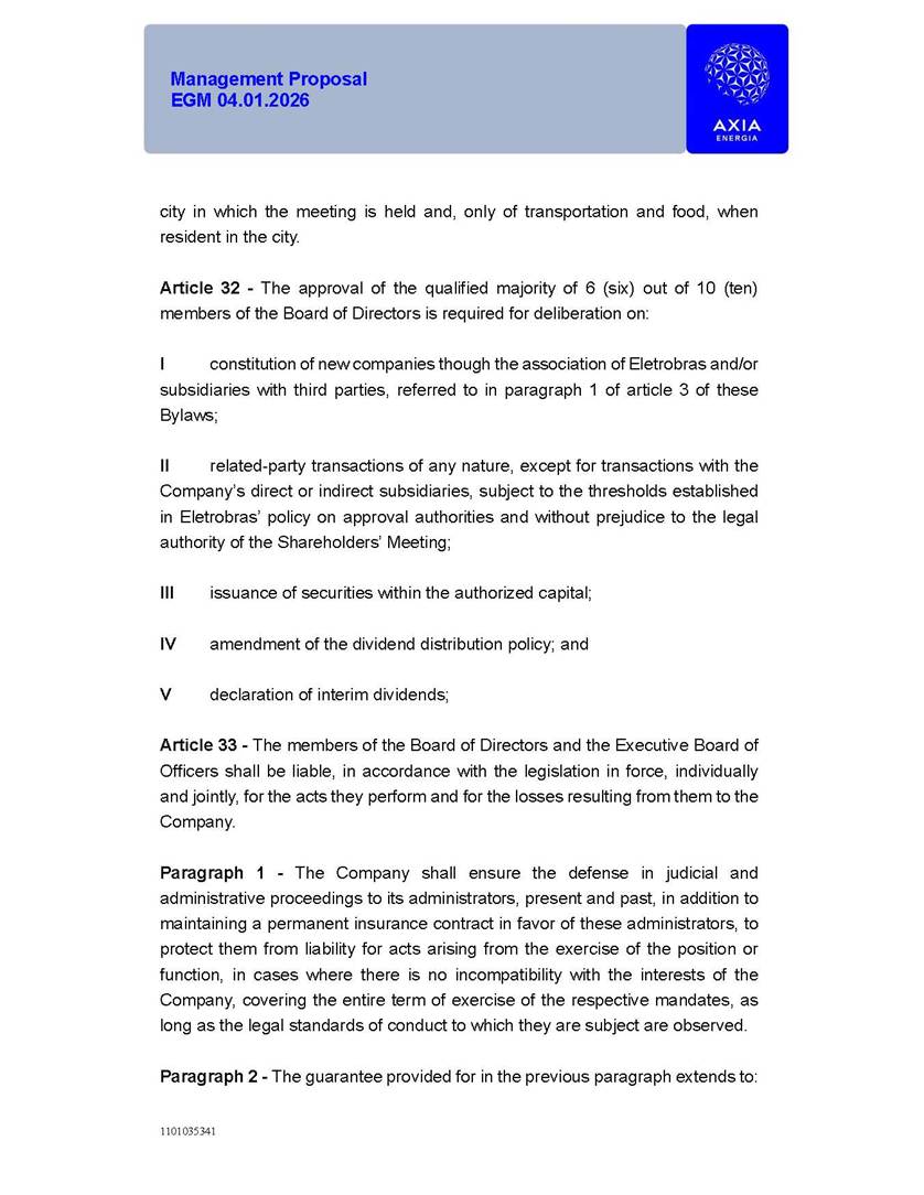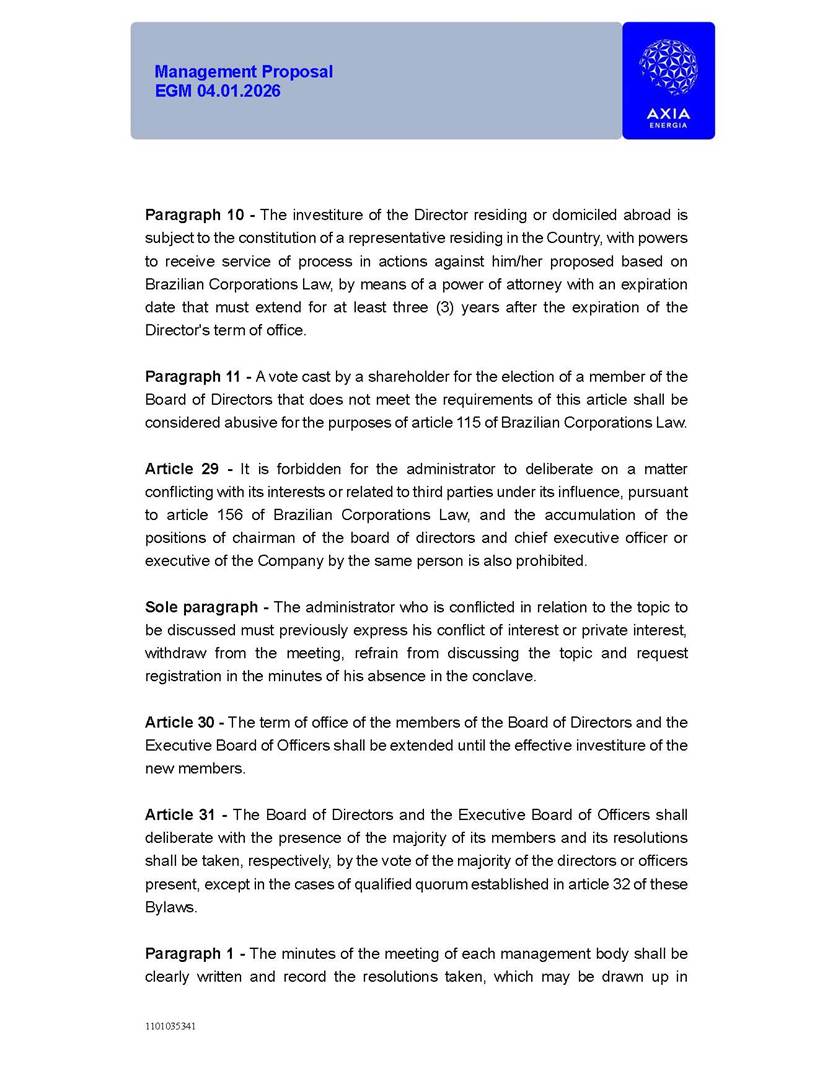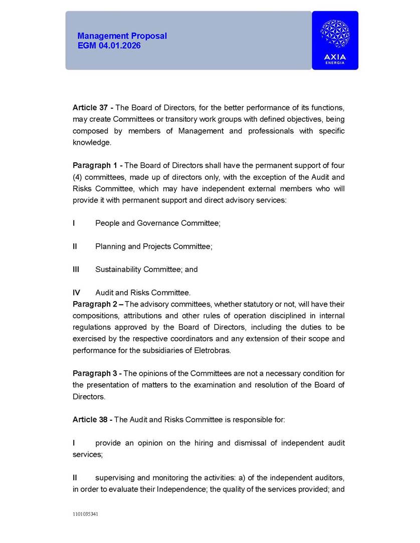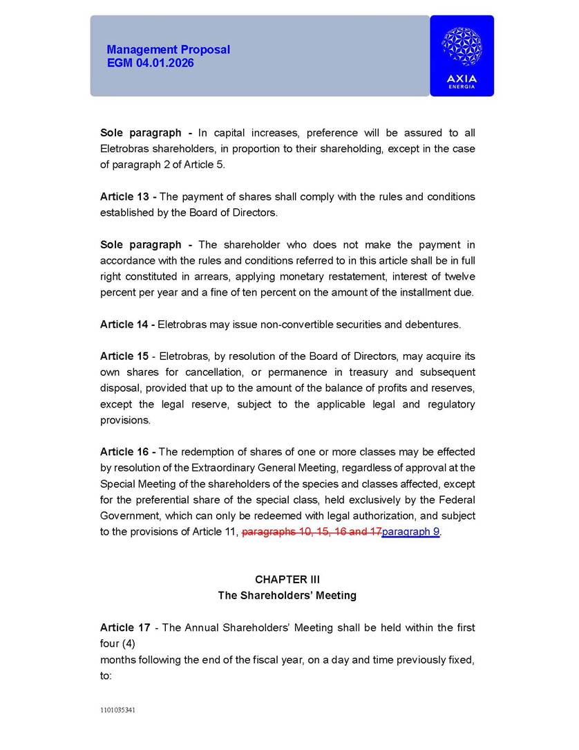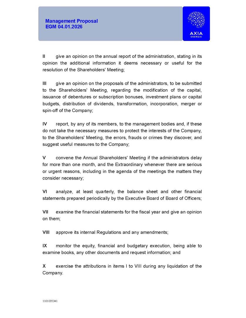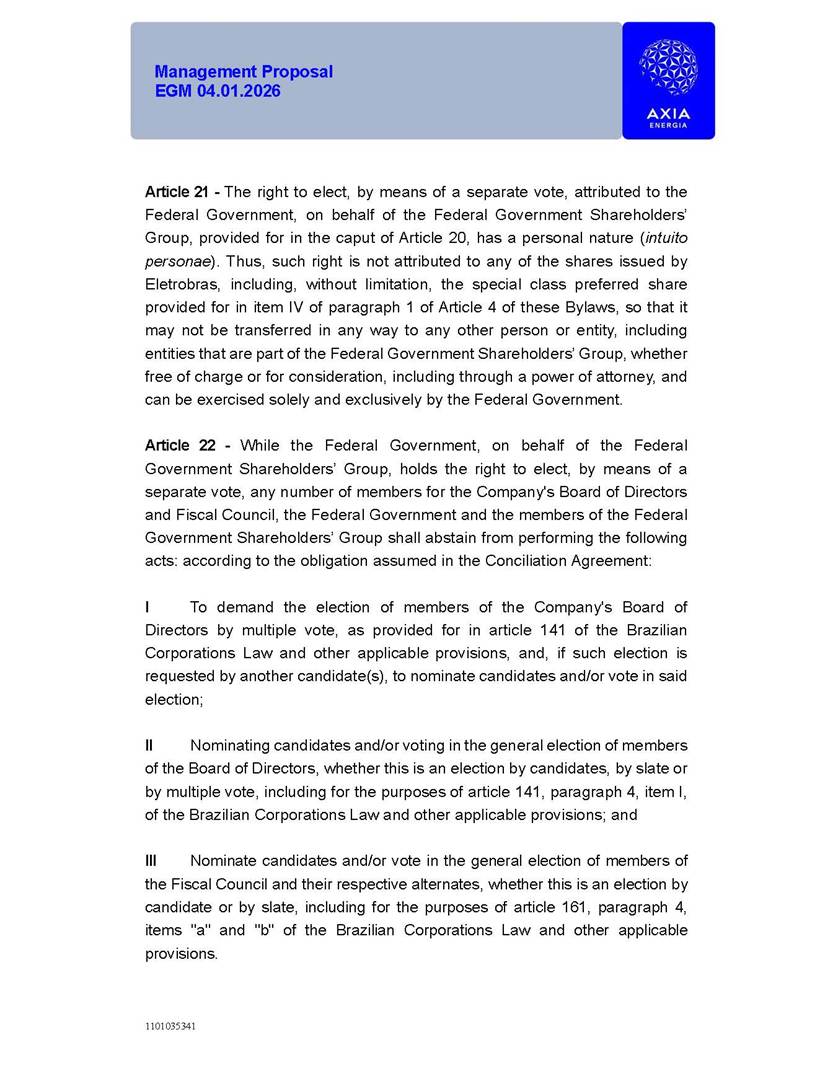 1101035341 Management Proposal EGM 04.01.2026 Management Proposal EGM 04.01.2026 1101035341 Management Proposal EGM 04.01.2026 Index 1. Manual for Participation ................................................................... 47 1.1. Introduction ...................................................................................... 47 1.2. Exclusively Digital Meeting .............................................................. 58 1.3. Remote Voting Ballot (BVD) ............................................................ 69 1.4. Required Documents ..................................................................... 812 1.5. Registration and Accreditation ..................................................... 1013 1.6. Declaration of Membership in a Group of Shareholders .............. 1215 2. Management Proposal .............................................................. 1417 2.1. General Guidelines ...................................................................... 1417 2.2. Agenda ........................................................................................ 1518 2.3. Clarifications on the agenda of the EGM ..................................... 1621 2.4. List of Schedules ......................................................................... 3344 2.5. Conclusion ................................................................................... 3545 SCHEDULE 1 ............................................................................................... 3646 SCHEDULE 2 ............................................................................................... 4259 SCHEDULE 3 ............................................................................................... 4664 SCHEDULE 4 ............................................................................................ 101119 SCHEDULE 5 ........................................................................................... 138157 SCHEDULE 6 ........................................................................................... 189208 SCHEDULE 7 ........................................................................................... 193212 SCHEDULE 8 ........................................................................................... 247266 SCHEDULE 9 ........................................................................................... 284304 1101035341 Management Proposal EGM 04.01.2026 1101035341 Management Proposal EGM 04.01.2026 1. Manual for Participation 1.1. Introduction The Management of CENTRAIS ELÉTRICAS BRASILEIRAS S.A. – Eletrobras, a corporation, headquartered in the City of Rio de Janeiro, State of Rio de Janeiro, at Avenida Graça Aranha, No. 26, Store A, Downtown, Zip code 20030-090, registered in the National Registry of Legal Entities (Cadastro Nacional de Pessoas Jurídicas) ("CNPJ") under No. 00.001.180/0001-26 ("Company" or "AXIA Energia"), with its bylaws filed with the Commercial Registry of the State of Rio de Janeiro (Junta Comercial do Estado do Rio de Janeiro) under NIRE 33.3.00346767, registered with the Brazilian Securities and Exchange Commission (Comissão de Valores Mobiliários) ("CVM") as a publicly-held company category "A" under the code 00243-7, with its securities currently admitted to trading on Level 1 of Corporate Governance of B3 S.A. – Brasil, Bolsa, Balcão ("B3"), pursuant to Brazilian Law No. 6,404, of 1976 ("Brazilian Corporate Law"), and CVM Resolution No. 81, of 2022 ("RCVM 81"), presents this Participation Manual, containing the information, documents and clarifications to guide the participation of shareholders at the Company's Extraordinary General Meeting, to be held exclusively digitally, on first call, on April 1, 2026, at 4 p.m., considering, therefore, to be held at the Company's headquarters ("Meeting" or "EGM" and "Manual", respectively), as well as the management proposal regarding the resolutions on the agenda, including the analysis of the matters submitted to the shareholders at the Meeting ("Management Proposal"). The Company's Management clarifies that, on this same date, it is also disclosing the call notice calling the Special Meeting of Class "A1" Preferred Shareholders ("PNA1") ("PNA1 Special Meeting") and the Special Meeting of Class "B1" Preferred Shareholders ("PNB1") ("PNB1 Special Meeting"), to be held, likewise, on April 1, 2026. As will be detailed in this Management Proposal, the PNA1 Special Meeting and the PNB1 Special Meeting are part of the context of this EGM, being held pursuant to and for the purposes of article 136, §1, of the Brazilian Corporate Law, given that the EGM agenda contemplates proposals for conversion of PNA1 and PNB1 shares. 1101035341 Management Proposal EGM 04.01.2026 1.2. Exclusively Digital Meeting The Meeting will be exclusively digital, to be held through the digital platform of "Atlas AGM" ("Digital Platform"). The exclusively digital format is intended to facilitate the participation of shareholders and others involved in the Meeting, pursuant to the Brazilian Corporate Law, RCVM 81 and the Company's Bylaws. Shareholders who wish to participate in the Meeting must register on the https://atlasagm.com website or through the "Atlas AGM" application available on the Apple Store and Google Play Store ("Application") and submit all documents necessary to qualify for participation or voting at the Meeting by 11:59 p.m. on March 30, 2026. The Digital Platform meets the requirements set forth in article 28, paragraph 1, items I to III, of RCVM 81 and the Meeting will be fully recorded. By accessing the Digital Platform and participating in the Meeting, the Admitted Shareholder (as defined below) authorizes the Company, and third parties authorized by the Company, to record and use the information, in accordance with applicable law. The recordings and related information will be used and processed by the Company for a period of five years, and may be used for the Company's de