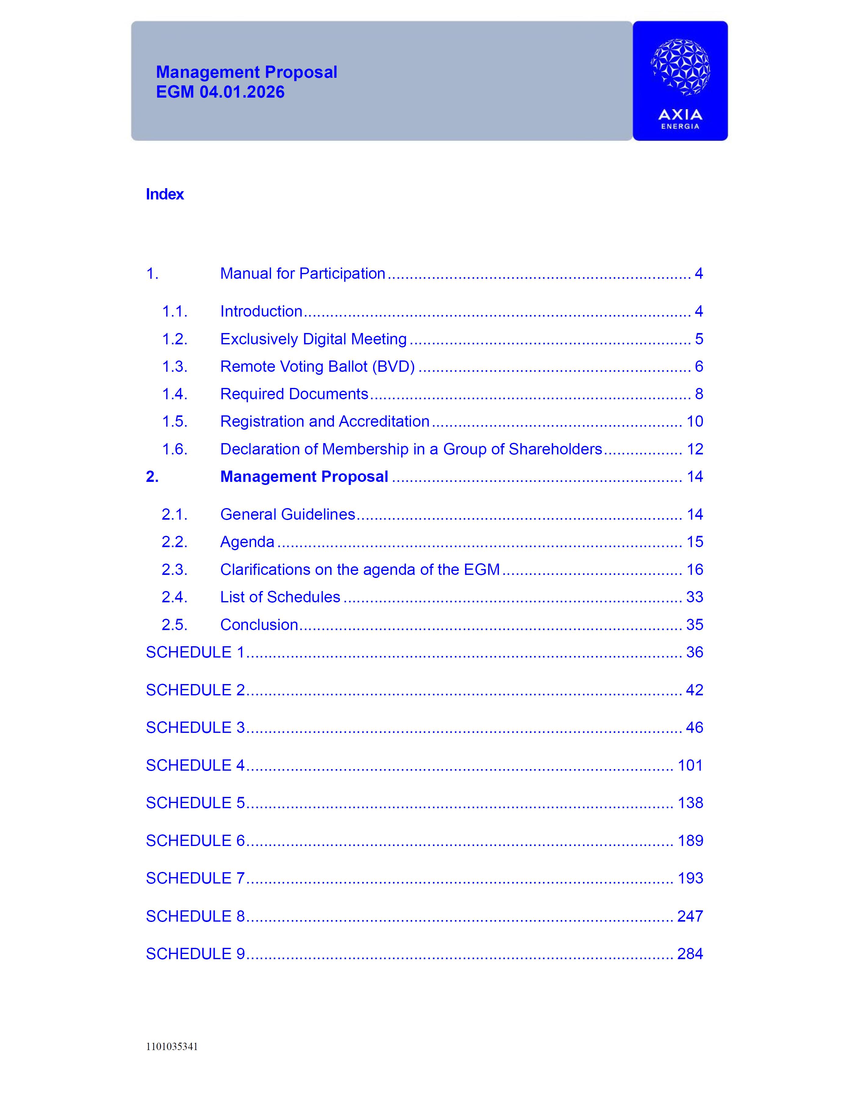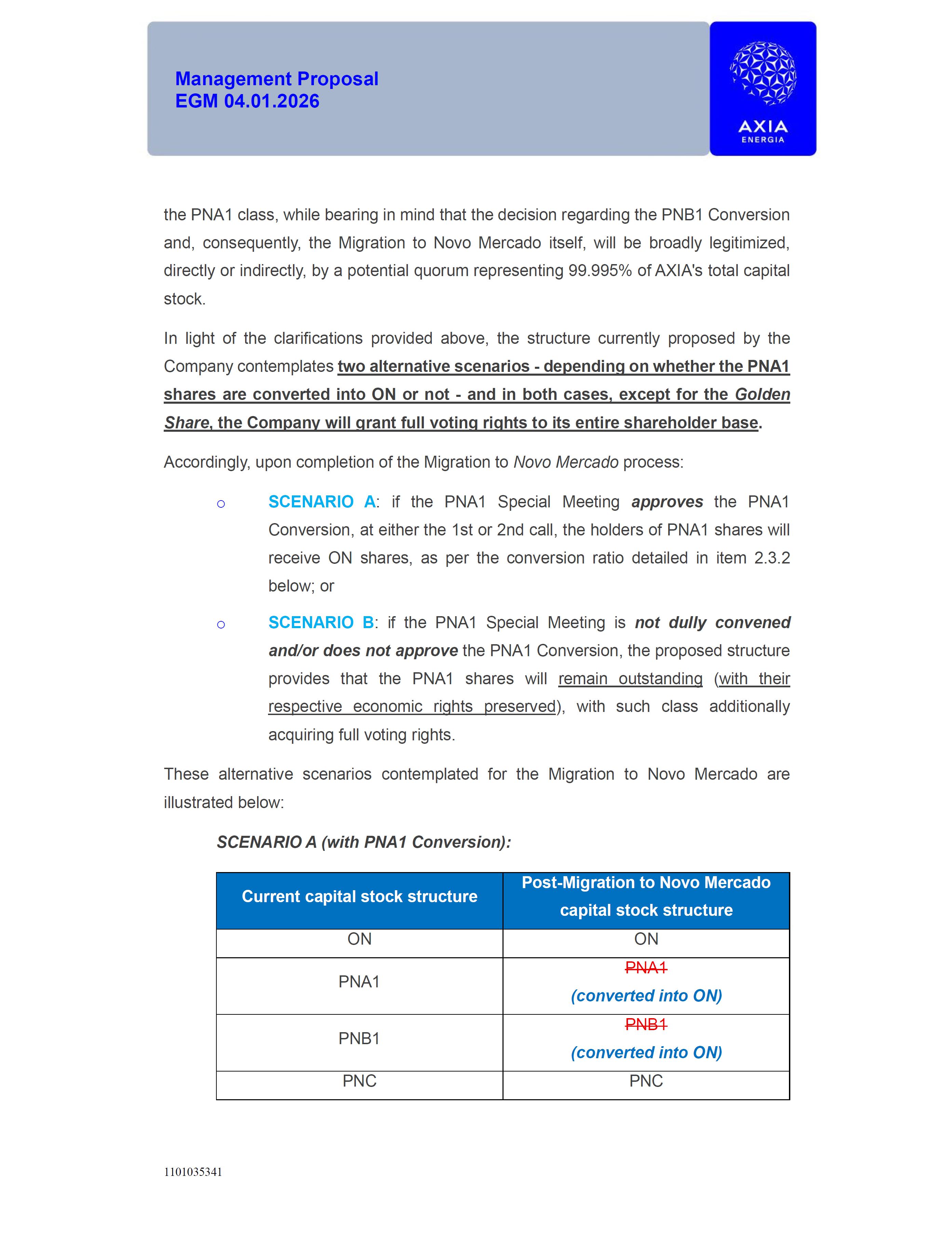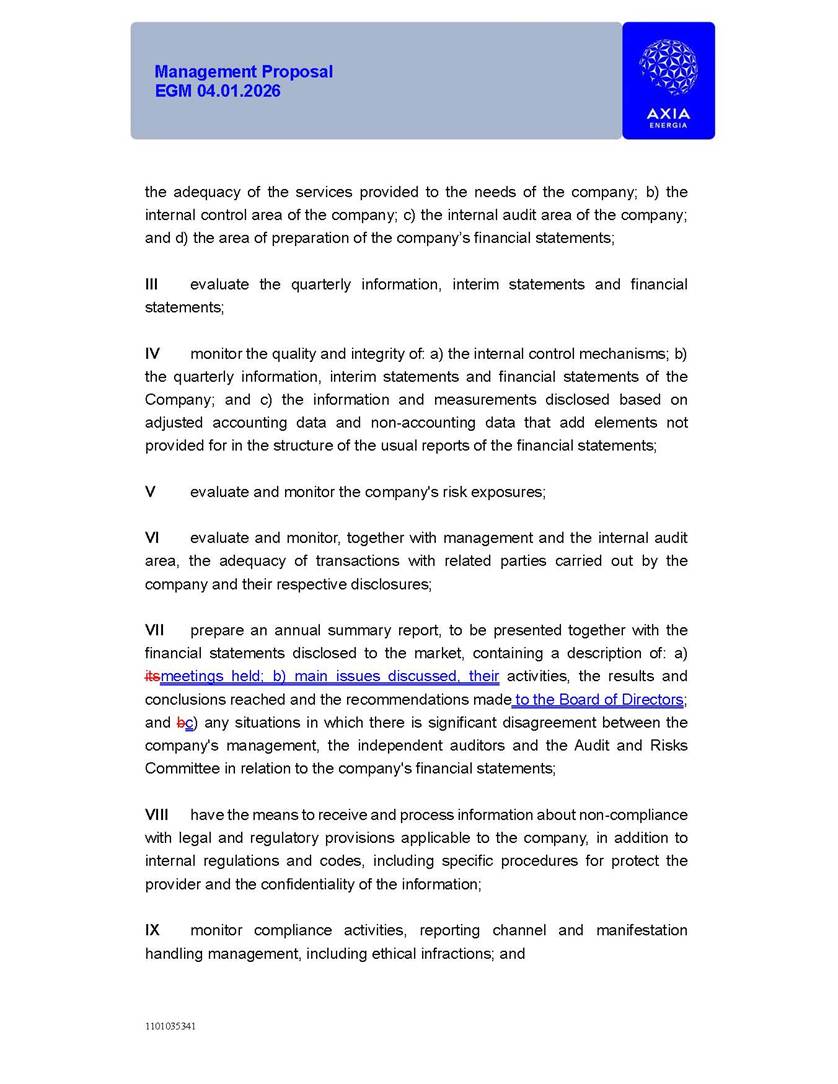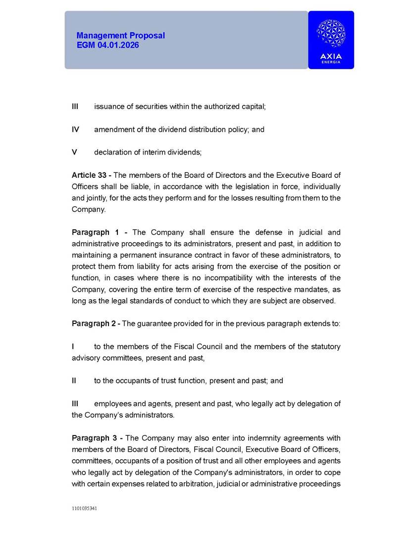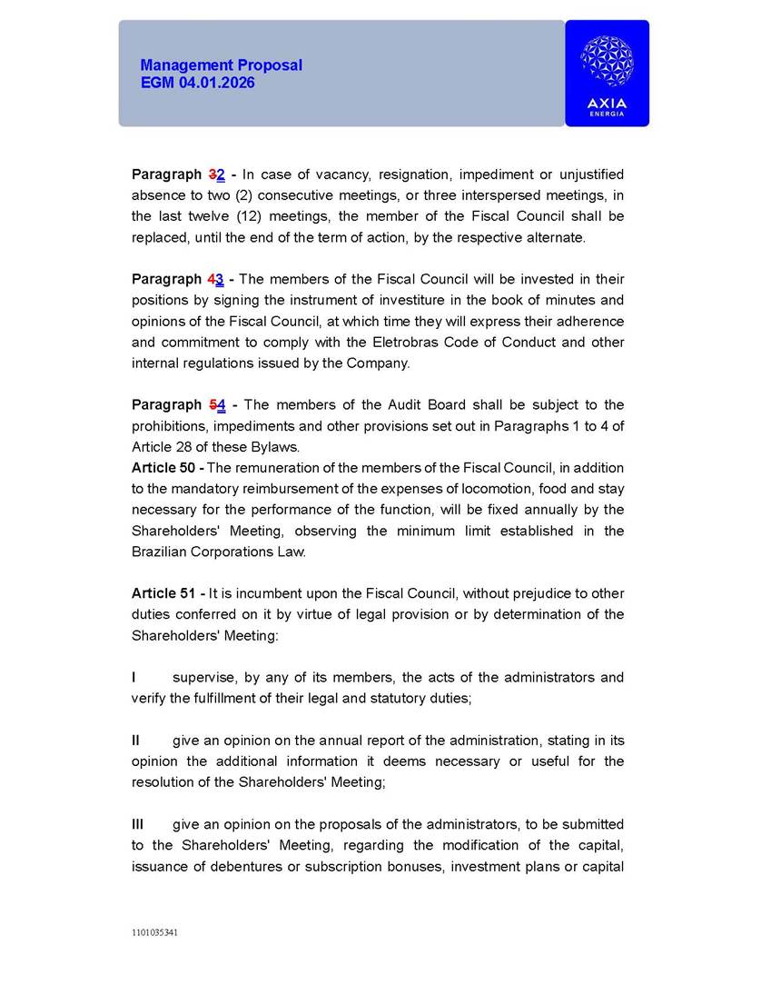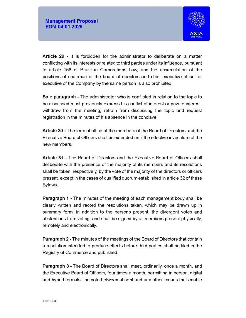 1101035341 Management Proposal EGM 04.01.2026 Management Proposal EGM 04.01.2026 1101035341 Management Proposal EGM 04.01.2026 Index 1. Manual for Participation ................................................................... 47 1.1. Introduction ...................................................................................... 47 1.2. Exclusively Digital Meeting .............................................................. 58 1.3. Remote Voting Ballot (BVD) ............................................................ 69 1.4. Required Documents ..................................................................... 812 1.5. Registration and Accreditation ..................................................... 1013 1.6. Declaration of Membership in a Group of Shareholders .............. 1215 2. Management Proposal .............................................................. 1417 2.1. General Guidelines ...................................................................... 1417 2.2. Agenda ........................................................................................ 1518 2.3. Clarifications on the agenda of the EGM ..................................... 1621 2.4. List of Schedules ......................................................................... 3344 2.5. Conclusion ................................................................................... 3545 SCHEDULE 1 ............................................................................................... 3646 SCHEDULE 2 ............................................................................................... 4259 SCHEDULE 3 ............................................................................................... 4664 SCHEDULE 4 ............................................................................................ 101119 SCHEDULE 5 ........................................................................................... 138157 SCHEDULE 6 ........................................................................................... 189208 SCHEDULE 7 ........................................................................................... 193212 SCHEDULE 8 ........................................................................................... 247266 SCHEDULE 9 ........................................................................................... 284304 1101035341 Management Proposal EGM 04.01.2026 1101035341 Management Proposal EGM 04.01.2026 1. Manual for Participation 1.1. Introduction The Management of CENTRAIS ELÉTRICAS BRASILEIRAS S.A. – Eletrobras, a corporation, headquartered in the City of Rio de Janeiro, State of Rio de Janeiro, at Avenida Graça Aranha, No. 26, Store A, Downtown, Zip code 20030-090, registered in the National Registry of Legal Entities (Cadastro Nacional de Pessoas Jurídicas) ("CNPJ") under No. 00.001.180/0001-26 ("Company" or "AXIA Energia"), with its bylaws filed with the Commercial Registry of the State of Rio de Janeiro (Junta Comercial do Estado do Rio de Janeiro) under NIRE 33.3.00346767, registered with the Brazilian Securities and Exchange Commission (Comissão de Valores Mobiliários) ("CVM") as a publicly-held company category "A" under the code 00243-7, with its securities currently admitted to trading on Level 1 of Corporate Governance of B3 S.A. – Brasil, Bolsa, Balcão ("B3"), pursuant to Brazilian Law No. 6,404, of 1976 ("Brazilian Corporate Law"), and CVM Resolution No. 81, of 2022 ("RCVM 81"), presents this Participation Manual, containing the information, documents and clarifications to guide the participation of shareholders at the Company's Extraordinary General Meeting, to be held exclusively digitally, on first call, on April 1, 2026, at 4 p.m., considering, therefore, to be held at the Company's headquarters ("Meeting" or "EGM" and "Manual", respectively), as well as the management proposal regarding the resolutions on the agenda, including the analysis of the matters submitted to the shareholders at the Meeting ("Management Proposal"). The Company's Management clarifies that, on this same date, it is also disclosing the call notice calling the Special Meeting of Class "A1" Preferred Shareholders ("PNA1") ("PNA1 Special Meeting") and the Special Meeting of Class "B1" Preferred Shareholders ("PNB1") ("PNB1 Special Meeting"), to be held, likewise, on April 1, 2026. As will be detailed in this Management Proposal, the PNA1 Special Meeting and the PNB1 Special Meeting are part of the context of this EGM, being held pursuant to and for the purposes of article 136, §1, of the Brazilian Corporate Law, given that the EGM agenda contemplates proposals for conversion of PNA1 and PNB1 shares. 1101035341 Management Proposal EGM 04.01.2026 1.2. Exclusively Digital Meeting The Meeting will be exclusively digital, to be held through the digital platform of "Atlas AGM" ("Digital Platform"). The exclusively digital format is intended to facilitate the participation of shareholders and others involved in the Meeting, pursuant to the Brazilian Corporate Law, RCVM 81 and the Company's Bylaws. Shareholders who wish to participate in the Meeting must register on the https://atlasagm.com website or through the "Atlas AGM" application available on the Apple Store and Google Play Store ("Application") and submit all documents necessary to qualify for participation or voting at the Meeting by 11:59 p.m. on March 30, 2026. The Digital Platform meets the requirements set forth in article 28, paragraph 1, items I to III, of RCVM 81 and the Meeting will be fully recorded. By accessing the Digital Platform and participating in the Meeting, the Admitted Shareholder (as defined below) authorizes the Company, and third parties authorized by the Company, to record and use the information, in accordance with applicable law. The recordings and related information will be used and processed by the Company for a period of five years, and may be used for the Company's de