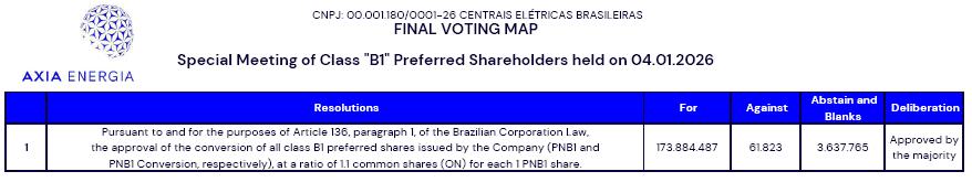 F C A Resolutions For Against Abstain and Blanks Deliberation 1 Pursuant to and for the purposes of Article 136, paragraph 1, of the Brazilian Corporation Law,the approval of the conversion of all class B1 preferred shares issued by the Company (PNB1 andPNB1 Conversion, respectively), at a ratio of 1.1 common shares (ON) for each 1 PNB1 share. 173.884.487 61.823 3.637.765 Approved by the majority CNPJ: 00.001.180/0001-26 CENTRAIS ELÉTRICAS BRASILEIRAS FINAL VOTING MAP Special Meeting of Class "B1" Preferred Shareholders held on 04.01.2026 # Classificação: Pública 1