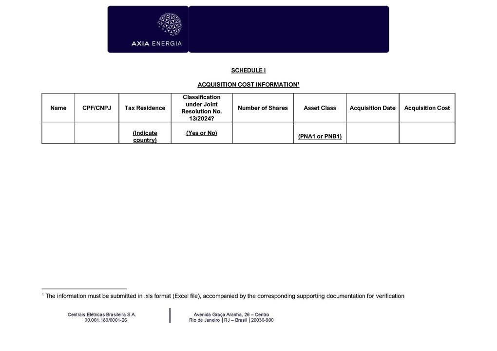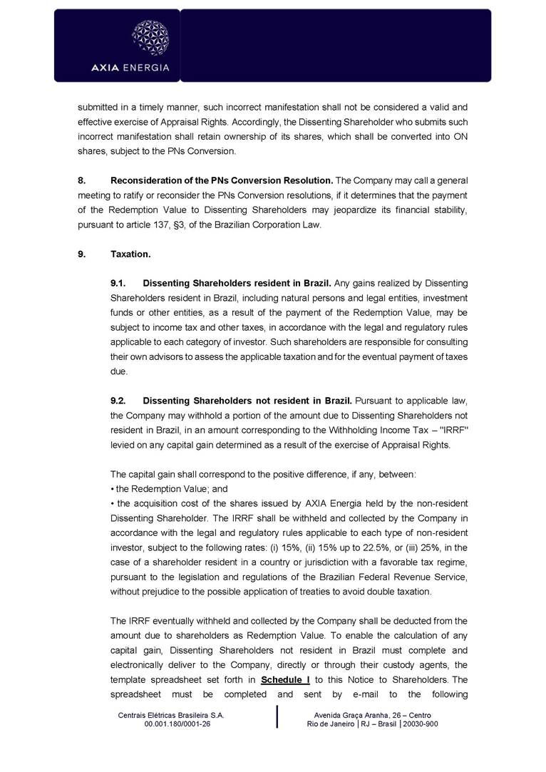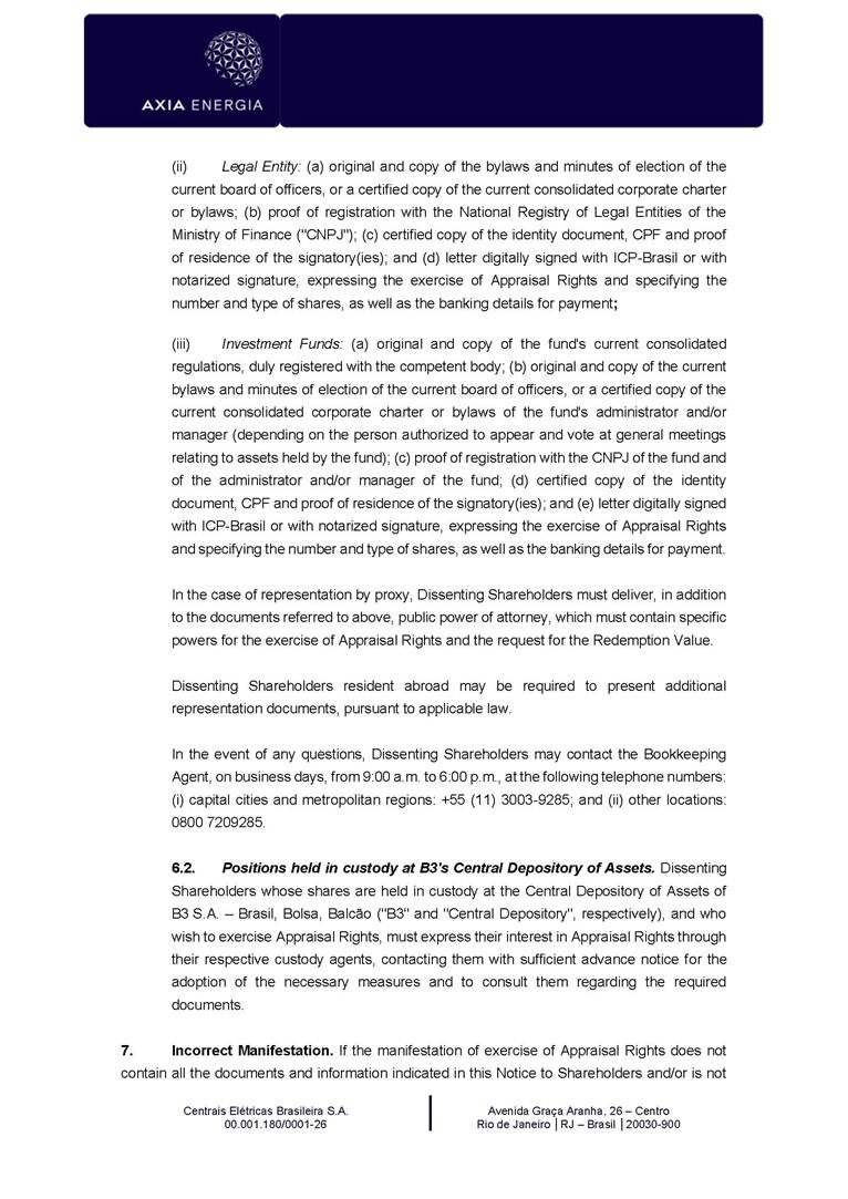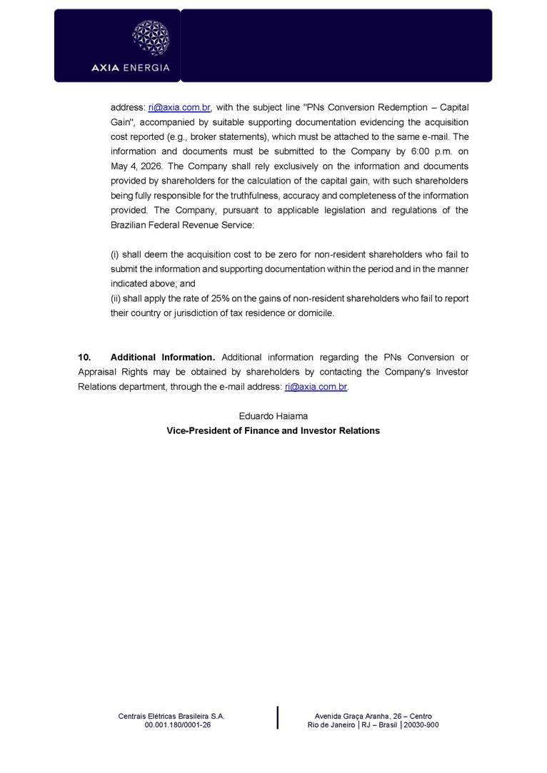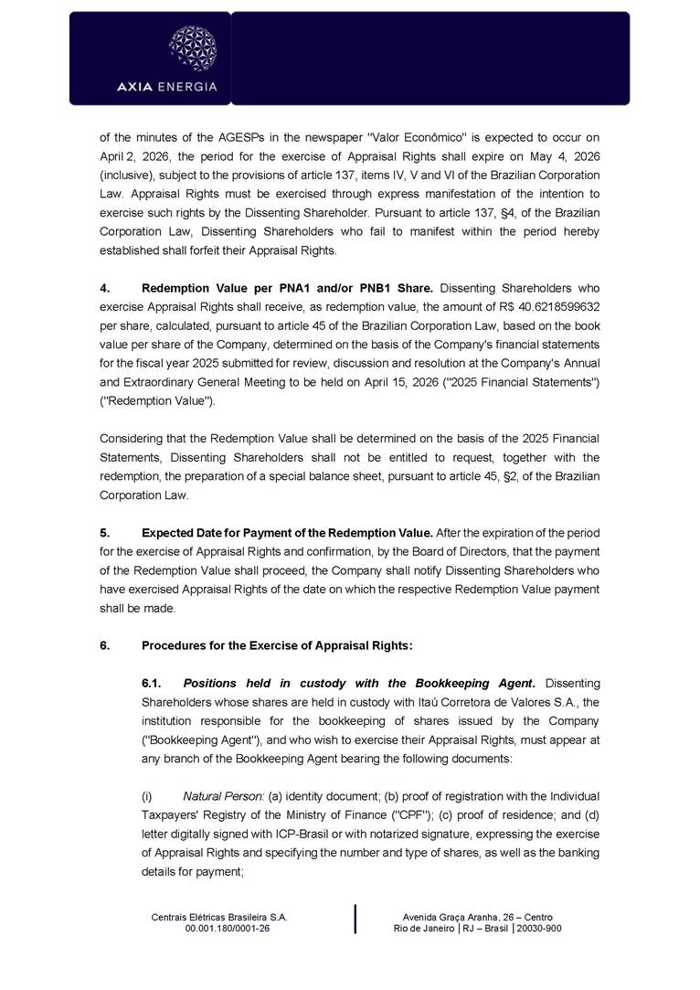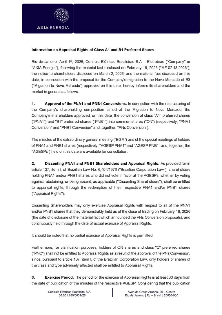 Centrais Elétricas Brasileira S.A. 00.001.180/0001-26 Avenida Graça Aranha, 26 – Centro Rio de Janeiro │RJ – Brasil │20030-900 Information on Appraisal Rights of Class A1 and B1 Preferred Shares Rio de Janeiro, April 1st, 2026, Centrais Elétricas Brasileiras S.A. - Eletrobras ("Company" or "AXIA Energia"), following the material fact disclosed on February 18, 2026 ("MF 02.18.2026"), the notice to shareholders disclosed on March 2, 2026, and the material fact disclosed on this date, in connection with the proposal for the Company's migration to the Novo Mercado of B3 ("Migration to Novo Mercado") approved on this date, hereby informs its shareholders and the market in general as follows: 1. Approval of the PNA1 and PNB1 Conversions. In connection with the restructuring of the Company's shareholding composition aimed at the Migration to Novo Mercado, the Company's shareholders approved, on this date, the conversion of class "A1" preferred shares ("PNA1") and "B1" preferred shares ("PNB1") into common shares ("ON") (respectively, "PNA1 Conversion" and "PNB1 Conversion" and, together, "PNs Conversion"). The minutes of the extraordinary general meeting ("EGM") and of the special meetings of holders of PNA1 and PNB1 shares (respectively, "AGESP PNA1" and "AGESP PNB1" and, together, the "AGESPs") held on this date are available for consultation. 2. Dissenting PNA1 and PNB1 Shareholders and Appraisal Rights. As provided for in article 137, item I, of Brazilian Law No. 6,404/1976 ("Brazilian Corporation Law"), shareholders holding PNA1 and/or PNB1 shares who did not vote in favor at the AGESPs, whether by voting against, abstaining, or being absent, as applicable ("Dissenting Shareholders"), shall be entitled to appraisal rights, through the redemption of their respective PNA1 and/or PNB1 shares ("Appraisal Rights"). Dissenting Shareholders may only exercise Appraisal Rights with respect to all of the PNA1 and/or PNB1 shares that they demonstrably held as of the close of trading on February 18, 2026 (the date of disclosure of the material fact which announced the PNs Conversion proposals), and continuously held through the date of actual exercise of Appraisal Rights. It should be noted that no partial exercise of Appraisal Rights is permitted. Furthermore, for clarification purposes, holders of ON shares and class "C" preferred shares ("PNC") shall not be entitled to Appraisal Rights as a result of the approval of the PNs Conversion, since, pursuant to article 137, item I, of the Brazilian Corporation Law, only holders of shares of the class and type adversely affected shall be entitled to Appraisal Rights. 3. Exercise Period. The period for the exercise of Appraisal Rights is at least 30 days from the date of publication of the minutes of the respective AGESP. Considering that the publication Centrais Elétricas Brasileira S.A. 00.001.180/0001-26 Avenida Graça Aranha, 26 – Centro Rio de Janeiro │RJ – Brasil │20030-900 of the minutes of the AGESPs in the newspaper "Valor Econômico" is expected to occur on April 2, 2026, the period for the exercise of Appraisal Rights shall expire on May 4, 2026 (inclusive), subject to the provisions of article 137, items IV, V and VI of the Brazilian Corporation Law. Appraisal Rights must be exercised through express manifestation of the intention to exercise such rights by the Dissenting Shareholder. Pursuant to article 137, §4, of the Brazilian Corporation Law, Dissenting Shareholders who fail to manifest within the period hereby established shall forfeit their Appraisal Rights. 4. Redemption Value per PNA1 and/or PNB1 Share. Dissenting Shareholders who exercise Appraisal Rights shall receive, as redemption value, the amount of R$ 40.6218599632 per share, calculated, pursuant to article 45 of the Brazilian Corporation Law, based on the book value per share of the Company, determined on the basis of the Company's financial statements for the fiscal year 2025 submitted for review, discussion and resolution at the Company's Annual and Extraordinary General Meeting to be held on April 15, 2026 ("2025 Financial Statements") ("Redemption Value"). Considering that the Redemption Value shall be determined on the basis of the 2025 Financial Statements, Dissenting Shareholders shall not be entitled to request, together with the redemption, the preparation of a special balance sheet, pursuant to article 45, §2, of the Brazilian Corporation Law. 5. Expected Date for Payment of the Redemption Value. After the expiration of the period for the exercise of Appraisal Rights and confirmation, by the Board of Directors, that the payment of the Redemption Value shall proceed, the Company shall notify Dissenting Shareholders who have exercised Appraisal Rights of the date on which the respective Redemption Value payment shall be made. 6. Procedures for the Exercise of Appraisal Rights: 6.1. Positions held in custody with the Bookkeeping Agent. Dissenting Shareholders whose shares are held in custody with Itaú Corretora de Valores S.A., the institution responsible for the bookkeeping of shares issued by the Company ("Bookkeeping Agent"), and who wish to exercise their Appraisal Rights, must appear at any branch of the Bookkeeping Agent bearing the following documents: (i) Natural Person: (a) identity document; (b) proof of registration with the Individual Taxpayers' Registry of the Ministry of Finance ("CPF"); (c) proof of residence; and (d) letter digitally signed with ICP-Brasil or with notarized signature, expressing the exercise of Appraisal Rights and specifying the number and type of shares, as well as the banking details for payment; Centrais Elétricas Brasileira S.A. 00.001.180/0001-26 Avenida Graça Aranha, 26 – Centro Rio de Janeiro │RJ – Brasil │20030-900 (ii) Legal Entity: (a) original and copy of the bylaws and minutes of election of the current board of officers, or a certified copy of the current consolidated corporate charter or bylaw