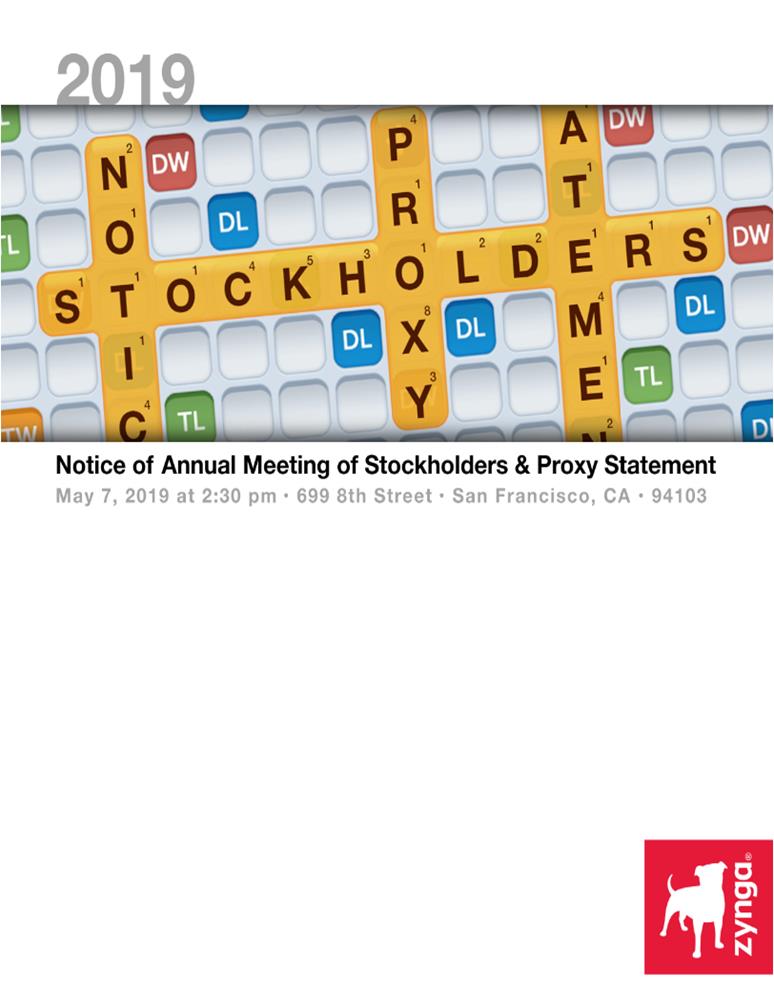 Important Notice Regarding the Availability of Proxy Materials for the Annual Meeting of Stockholders to Be Held on May 7, 2019: The proxy statement and Zynga’s Annual Report on Form 10-K for 2018 are available electronically at https://investor.zynga.com/financial-information/annual-reports. We are making the proxy statement and the form of proxy first available on or about March 28, 2019. |