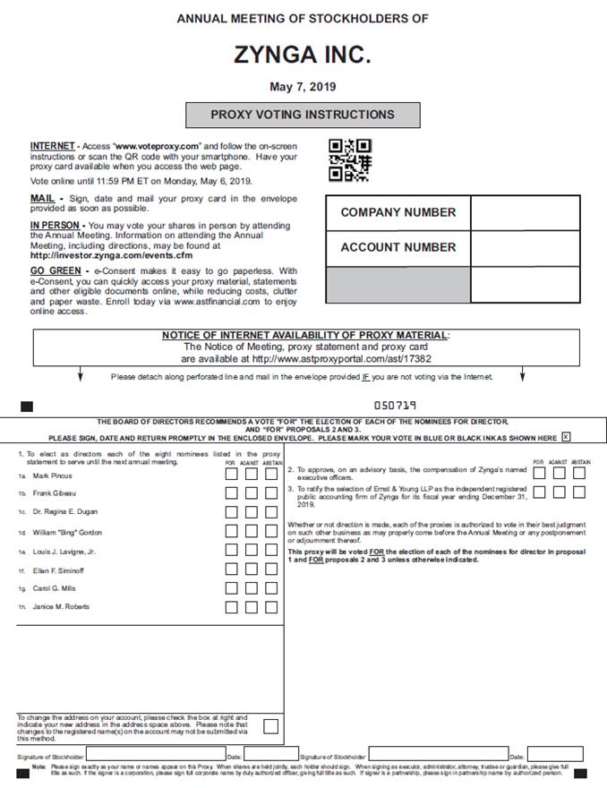 annual meeting of stockholders of zynga inc. may 7, 2019 proxy voting instructions internet-access “www.voteproxy.com” and follow the on-screen instructions or scan the qr code with your smartphone. have your proxy card available when you access the web page. vote online until 11:59 pm et on monday, may 6, 2019. mail sign, date and mail your proxy card in the envelope provided as soon as possible. in person – you may vote your shares in person by attending the annual meeting. information on attending the annual meeting, including directions, may be found at http://investor.zynga.com/events.cfm go green - e-consent makes it easy to go paperless. with e-consent, you can quickly access your proxy material, statements and other eligible documents online, while reducing costs, clutter and paper waste. enroll today via www.astfinancial.com to enjoy online access. company number account number notice of internet availability of proxy material: the notice of meeting of meeting, proxy statement and proxy card available at http://www.astproxyportal.com/ast/17382 please detach along perforate d line and mail in the envelope if you are not voting via the internet.050719 the board of directors recommends a vote “for” proposals 2 and 3. please sign, date and return promptly in the enclosed envelope. please mark your vote in blue or black ink as shown here 1. to elect as directors each of the eight nominees listed in the proxy statement to serve until the next annual meeting. for against abstain 1a. mark pincus 1b. frank gibeau 1c. dr. regina e. dugan 1d. william “bing” gordon 1e. louis j. lavigna, jr. 1f. ellen f. siminoff 1g. carol g. mills janice m. roberts 2. to approve, on an advisory basis, the compensation of zynga’s named executive officers. 3. to ratify the selection of ernst & young llp as the independent registered public accounting firm of zynga for its fiscal year ending december 31, 2019 whether or not direction is made, each of the proxies is authorized to vote in their best judgment on such other business as may properly come before the annual meeting or any postponement or adjournment thereof. this proxy will be voted for the election of each to the nominees for director in proposal 1 and for proposals 2 and 3 unless otherwise indicated for against abstain to change the address on your account, please check box at right and indicate your new address in the address space above. please not that changes to the registered name(s) on the account may not be submitted via this method. signature of stockholder date: signature of stockholder date: note: please sign exactly as you names appear on this proxy. when shares are hold jointly, each holder should sign. when signing as executor, administrator attorney, trustee or guardian, please give full title as such. if the signer is a corporation, please sign full corporate name by duly authorized officer, giving full tittle as such. if signer is a partnership, please sign in partnership name by authorized person.