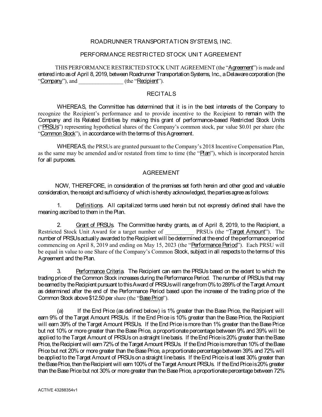 ROADRUNNER TRANSPORTATION SYSTEMS, INC. PERFORMANCE RESTRICTED STOCK UNIT AGREEMENT THIS PERFORMANCE RESTRICTED STOCK UNIT AGREEMENT (the “Agreement”) is made and entered into as of April 8, 2019, between Roadrunner Transportation Systems, Inc., a Delaware corporation (the “Company”), and ________________ (the “Recipient”). RECITALS WHEREAS, the Committee has determined that it is in the best interests of the Company to recognize the Recipient’s performance and to provide incentive to the Recipient to remain with the Company and its Related Entities by making this grant of performance-based Restricted Stock Units (“PRSUs”) representing hypothetical shares of the Company’s common stock, par value $0.01 per share (the “Common Stock”), in accordance with the terms of this Agreement. WHEREAS, the PRSUs are granted pursuant to the Company’s 2018 Incentive Compensation Plan, as the same may be amended and/or restated from time to time (the “Plan”), which is incorporated herein for all purposes. AGREEMENT NOW, THEREFORE, in consideration of the premises set forth herein and other good and valuable consideration, the receipt and sufficiency of which is hereby acknowledged, the parties agree as follows: 1. Definitions. All capitalized terms used herein but not expressly defined shall have the meaning ascribed to them in the Plan. 2. Grant of PRSUs. The Committee hereby grants, as of April 8, 2019, to the Recipient, a Restricted Stock Unit Award for a target number of __________ PRSUs (the “Target Amount”). The number of PRSUs actually awarded to the Recipient will be determined at the end of the performance period commencing on April 8, 2019 and ending on May 15, 2023 (the “Performance Period”). Each PRSU will be equal in value to one Share of the Company’s Common Stock, subject in all respects to the terms of this Agreement and the Plan. 3. Performance Criteria. The Recipient can earn the PRSUs based on the extent to which the trading price of the Common Stock increases during the Performance Period. The number of PRSUs that may be earned by the Recipient pursuant to this Award of PRSUs will range from 0% to 289% of the Target Amount as determined after the end of the Performance Period based upon the increase of the trading price of the Common Stock above $12.50 per share (the “Base Price”). (a) If the End Price (as defined below) is 1% greater than the Base Price, the Recipient will earn 9% of the Target Amount PRSUs. If the End Price is 10% greater than the Base Price, the Recipient will earn 39% of the Target Amount PRSUs. If the End Price is more than 1% greater than the Base Price but not 10% or more greater than the Base Price, a proportionate percentage between 9% and 39% will be applied to the Target Amount of PRSUs on a straight line basis. If the End Price is 20% greater than the Base Price, the Recipient will earn 72% of the Target Amount PRSUs. If the End Price is more than 10% of the Base Price but not 20% or more greater than the Base Price, a proportionate percentage between 39% and 72% will be applied to the Target Amount of PRSUs on a straight line basis. If the End Price is at least 30% greater than the Base Price, then the Recipient will earn 100% of the Target Amount PRSUs. If the End Price is 20% greater than the Base Price but not 30% or more greater than the Base Price, a proportionate percentage between 72% ACTIVE 43288354v1