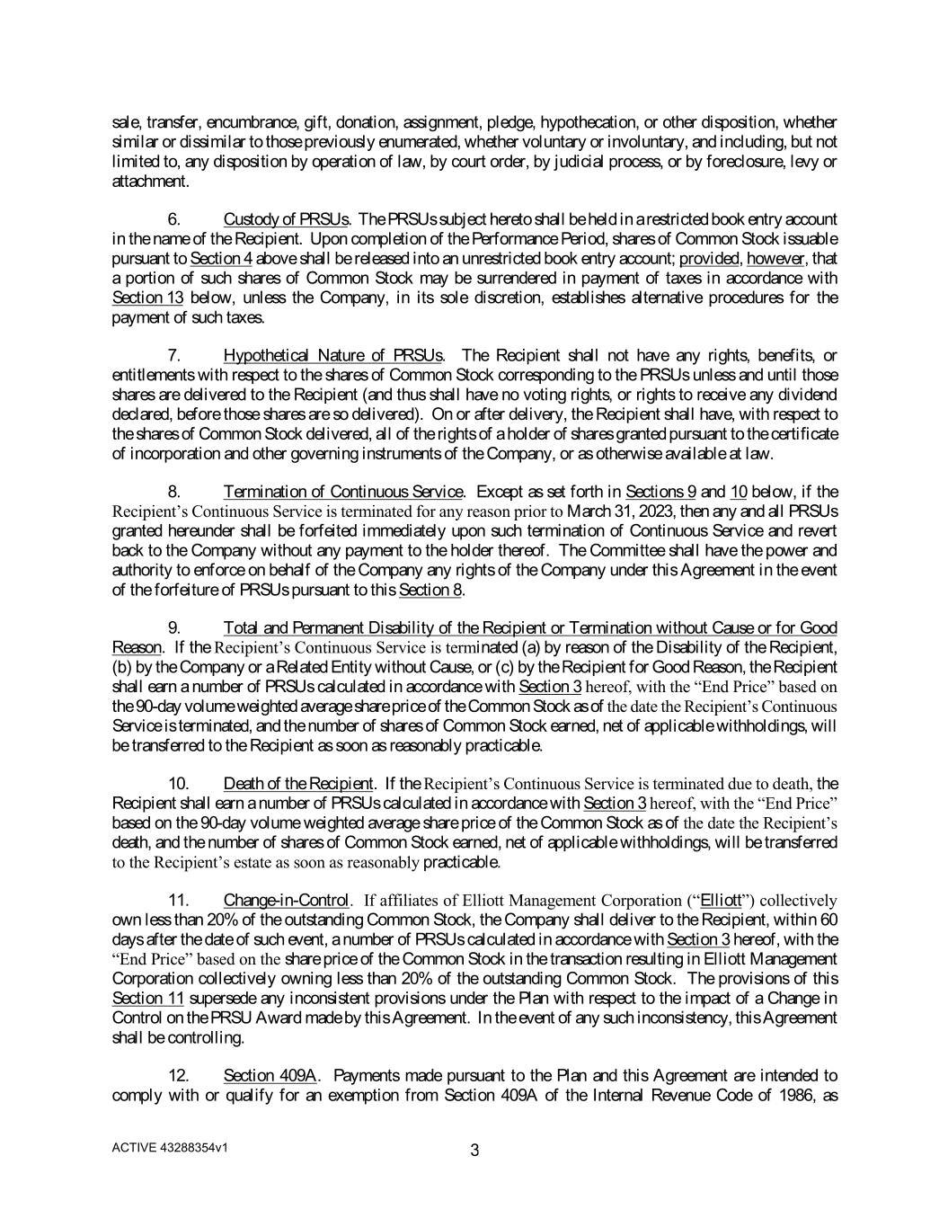 sale, transfer, encumbrance, gift, donation, assignment, pledge, hypothecation, or other disposition, whether similar or dissimilar to those previously enumerated, whether voluntary or involuntary, and including, but not limited to, any disposition by operation of law, by court order, by judicial process, or by foreclosure, levy or attachment. 6. Custody of PRSUs. The PRSUs subject hereto shall be held in a restricted book entry account in the name of the Recipient. Upon completion of the Performance Period, shares of Common Stock issuable pursuant to Section 4 above shall be released into an unrestricted book entry account; provided, however, that a portion of such shares of Common Stock may be surrendered in payment of taxes in accordance with Section 13 below, unless the Company, in its sole discretion, establishes alternative procedures for the payment of such taxes. 7. Hypothetical Nature of PRSUs. The Recipient shall not have any rights, benefits, or entitlements with respect to the shares of Common Stock corresponding to the PRSUs unless and until those shares are delivered to the Recipient (and thus shall have no voting rights, or rights to receive any dividend declared, before those shares are so delivered). On or after delivery, the Recipient shall have, with respect to the shares of Common Stock delivered, all of the rights of a holder of shares granted pursuant to the certificate of incorporation and other governing instruments of the Company, or as otherwise available at law. 8. Termination of Continuous Service. Except as set forth in Sections 9 and 10 below, if the Recipient’s Continuous Service is terminated for any reason prior to March 31, 2023, then any and all PRSUs granted hereunder shall be forfeited immediately upon such termination of Continuous Service and revert back to the Company without any payment to the holder thereof. The Committee shall have the power and authority to enforce on behalf of the Company any rights of the Company under this Agreement in the event of the forfeiture of PRSUs pursuant to this Section 8. 9. Total and Permanent Disability of the Recipient or Termination without Cause or for Good Reason. If the Recipient’s Continuous Service is terminated (a) by reason of the Disability of the Recipient, (b) by the Company or a Related Entity without Cause, or (c) by the Recipient for Good Reason, the Recipient shall earn a number of PRSUs calculated in accordance with Section 3 hereof, with the “End Price” based on the 90-day volume weighted average share price of the Common Stock as of the date the Recipient’s Continuous Service is terminated, and the number of shares of Common Stock earned, net of applicable withholdings, will be transferred to the Recipient as soon as reasonably practicable. 10. Death of the Recipient. If the Recipient’s Continuous Service is terminated due to death, the Recipient shall earn a number of PRSUs calculated in accordance with Section 3 hereof, with the “End Price” based on the 90-day volume weighted average share price of the Common Stock as of the date the Recipient’s death, and the number of shares of Common Stock earned, net of applicable withholdings, will be transferred to the Recipient’s estate as soon as reasonably practicable. 11. Change-in-Control. If affiliates of Elliott Management Corporation (“Elliott”) collectively own less than 20% of the outstanding Common Stock, the Company shall deliver to the Recipient, within 60 days after the date of such event, a number of PRSUs calculated in accordance with Section 3 hereof, with the “End Price” based on the share price of the Common Stock in the transaction resulting in Elliott Management Corporation collectively owning less than 20% of the outstanding Common Stock. The provisions of this Section 11 supersede any inconsistent provisions under the Plan with respect to the impact of a Change in Control on the PRSU Award made by this Agreement. In the event of any such inconsistency, this Agreement shall be controlling. 12. Section 409A. Payments made pursuant to the Plan and this Agreement are intended to comply with or qualify for an exemption from Section 409A of the Internal Revenue Code of 1986, as ACTIVE 43288354v1 3
