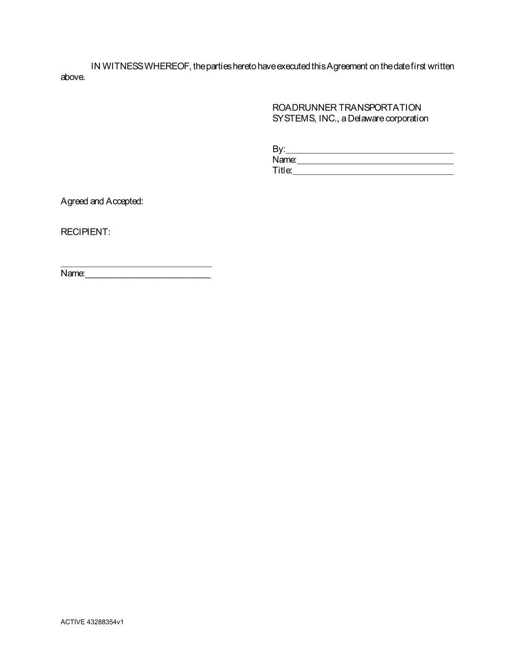 IN WITNESS WHEREOF, the parties hereto have executed this Agreement on the date first written above. ROADRUNNER TRANSPORTATION SYSTEMS, INC., a Delaware corporation By: Name: Title: Agreed and Accepted: RECIPIENT: Name:___________________________ ACTIVE 43288354v1