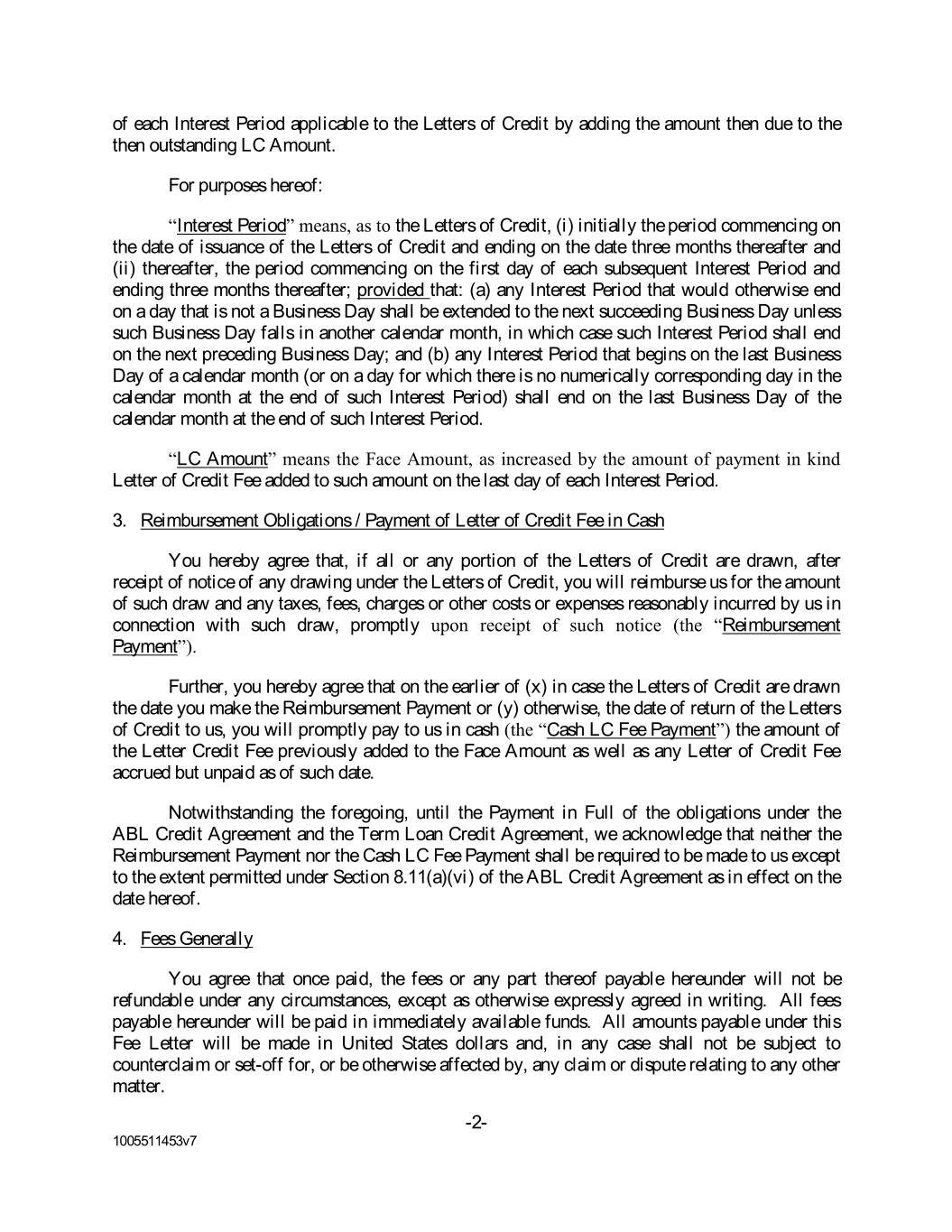 of each Interest Period applicable to the Letters of Credit by adding the amount then due to the then outstanding LC Amount. For purposes hereof: “Interest Period” means, as to the Letters of Credit, (i) initially the period commencing on the date of issuance of the Letters of Credit and ending on the date three months thereafter and (ii) thereafter, the period commencing on the first day of each subsequent Interest Period and ending three months thereafter; provided that: (a) any Interest Period that would otherwise end on a day that is not a Business Day shall be extended to the next succeeding Business Day unless such Business Day falls in another calendar month, in which case such Interest Period shall end on the next preceding Business Day; and (b) any Interest Period that begins on the last Business Day of a calendar month (or on a day for which there is no numerically corresponding day in the calendar month at the end of such Interest Period) shall end on the last Business Day of the calendar month at the end of such Interest Period. “LC Amount” means the Face Amount, as increased by the amount of payment in kind Letter of Credit Fee added to such amount on the last day of each Interest Period. 3. Reimbursement Obligations / Payment of Letter of Credit Fee in Cash You hereby agree that, if all or any portion of the Letters of Credit are drawn, after receipt of notice of any drawing under the Letters of Credit, you will reimburse us for the amount of such draw and any taxes, fees, charges or other costs or expenses reasonably incurred by us in connection with such draw, promptly upon receipt of such notice (the “Reimbursement Payment”). Further, you hereby agree that on the earlier of (x) in case the Letters of Credit are drawn the date you make the Reimbursement Payment or (y) otherwise, the date of return of the Letters of Credit to us, you will promptly pay to us in cash (the “Cash LC Fee Payment”) the amount of the Letter Credit Fee previously added to the Face Amount as well as any Letter of Credit Fee accrued but unpaid as of such date. Notwithstanding the foregoing, until the Payment in Full of the obligations under the ABL Credit Agreement and the Term Loan Credit Agreement, we acknowledge that neither the Reimbursement Payment nor the Cash LC Fee Payment shall be required to be made to us except to the extent permitted under Section 8.11(a)(vi) of the ABL Credit Agreement as in effect on the date hereof. 4. Fees Generally You agree that once paid, the fees or any part thereof payable hereunder will not be refundable under any circumstances, except as otherwise expressly agreed in writing. All fees payable hereunder will be paid in immediately available funds. All amounts payable under this Fee Letter will be made in United States dollars and, in any case shall not be subject to counterclaim or set-off for, or be otherwise affected by, any claim or dispute relating to any other matter. -2- 1005511453v7