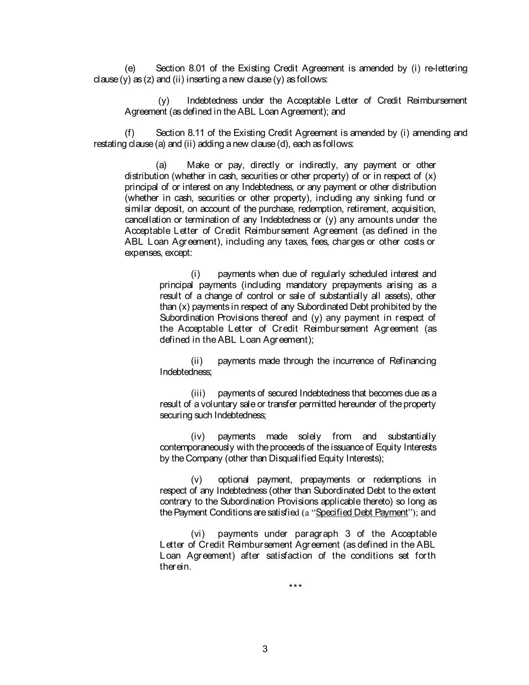(e) Section 8.01 of the Existing Credit Agreement is amended by (i) re-lettering clause (y) as (z) and (ii) inserting a new clause (y) as follows: (y) Indebtedness under the Acceptable Letter of Credit Reimbursement Agreement (as defined in the ABL Loan Agreement); and (f) Section 8.11 of the Existing Credit Agreement is amended by (i) amending and restating clause (a) and (ii) adding a new clause (d), each as follows: (a) Make or pay, directly or indirectly, any payment or other distribution (whether in cash, securities or other property) of or in respect of (x) principal of or interest on any Indebtedness, or any payment or other distribution (whether in cash, securities or other property), including any sinking fund or similar deposit, on account of the purchase, redemption, retirement, acquisition, cancellation or termination of any Indebtedness or (y) any amounts under the Acceptable Letter of Credit Reimbursement Agreement (as defined in the ABL Loan Agreement), including any taxes, fees, charges or other costs or expenses, except: (i) payments when due of regularly scheduled interest and principal payments (including mandatory prepayments arising as a result of a change of control or sale of substantially all assets), other than (x) payments in respect of any Subordinated Debt prohibited by the Subordination Provisions thereof and (y) any payment in respect of the Acceptable Letter of Credit Reimbursement Agreement (as defined in the ABL Loan Agreement); (ii) payments made through the incurrence of Refinancing Indebtedness; (iii) payments of secured Indebtedness that becomes due as a result of a voluntary sale or transfer permitted hereunder of the property securing such Indebtedness; (iv) payments made solely from and substantially contemporaneously with the proceeds of the issuance of Equity Interests by the Company (other than Disqualified Equity Interests); (v) optional payment, prepayments or redemptions in respect of any Indebtedness (other than Subordinated Debt to the extent contrary to the Subordination Provisions applicable thereto) so long as the Payment Conditions are satisfied (a “Specified Debt Payment”); and (vi) payments under paragraph 3 of the Acceptable Letter of Credit Reimbursement Agreement (as defined in the ABL Loan Agreement) after satisfaction of the conditions set forth therein. *** 3